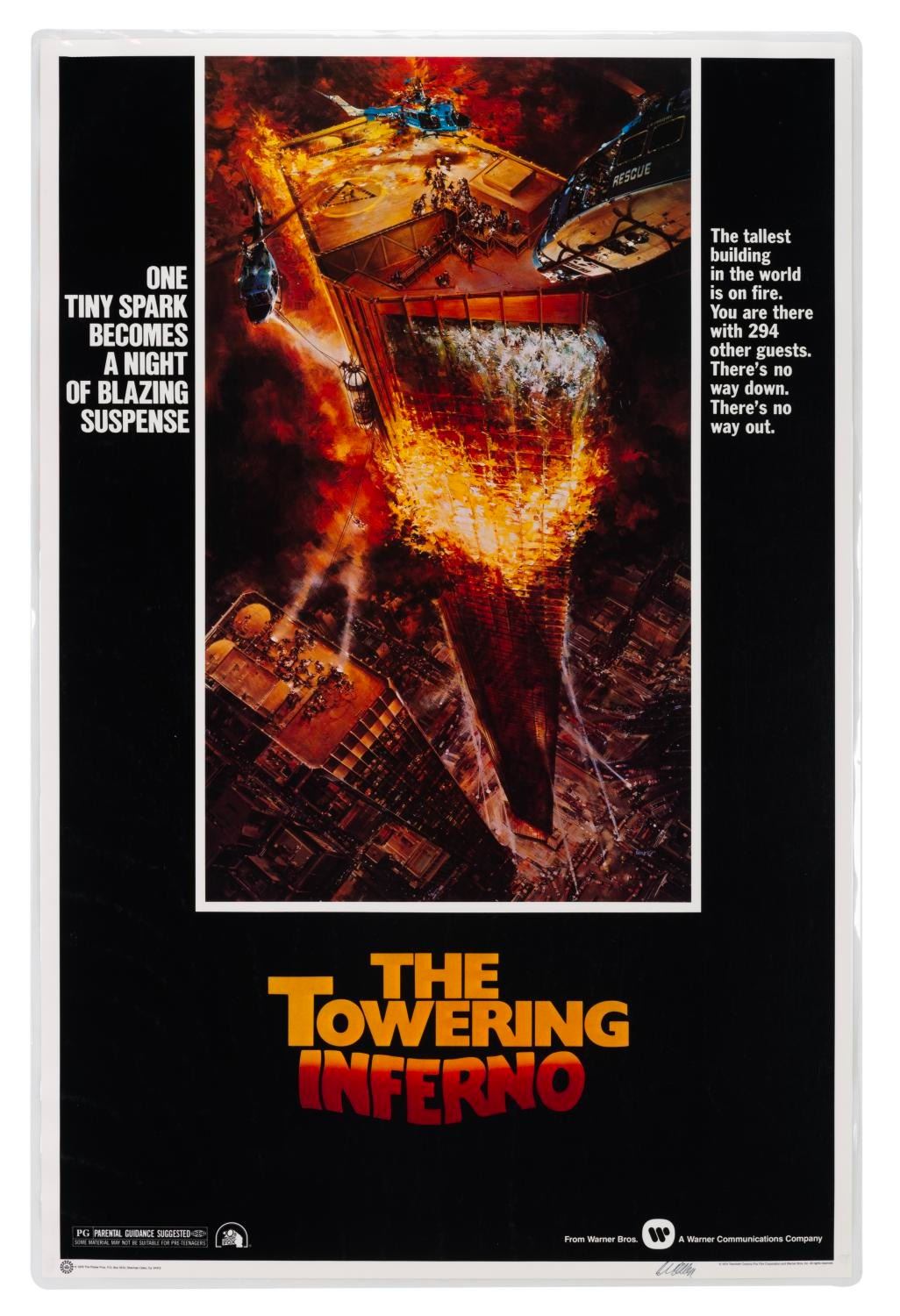 (The Poster Pros, 1976) A merchandise poster of the "Towering Inferno" one-sheet. This poster was laminated to keep as a sample. Measuring 23.25" x 35.25", the laminated poster displays in very good condition with light handling wear, and an approval signature in the bottom border.