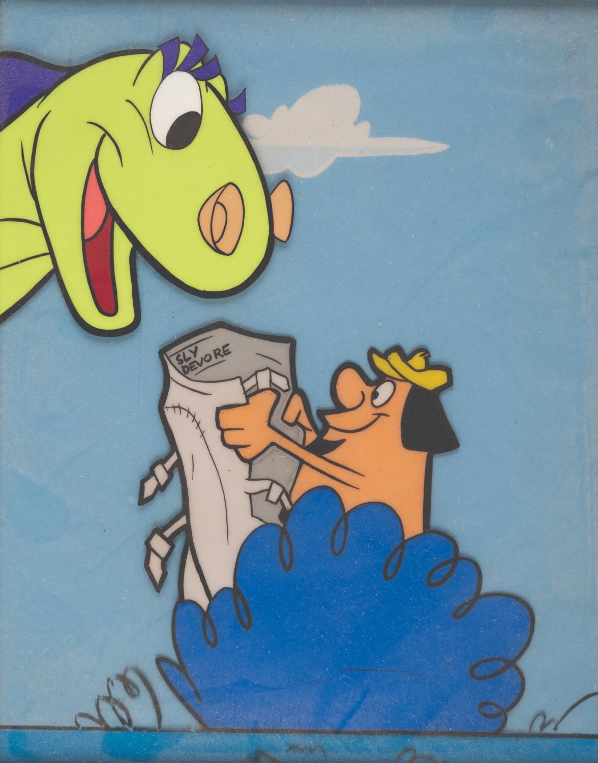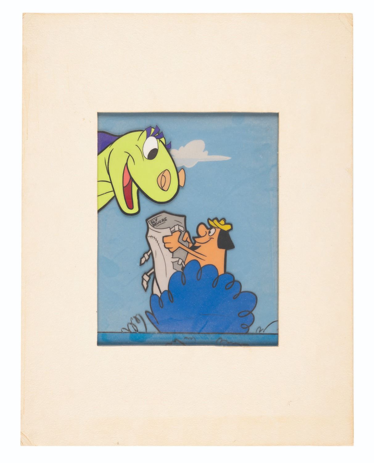 (Clampett, 1962) An original multi-layer production cel and background featuring Cecil and Go Man Van Gogh from the “Beany and Cecil” episode, “The Wildman of Wildsville.” Measuring 7” x 5.5”, the hand-painted cel and background are in very good condition presented in a 13” x 10” matte. The matte displays in good condition with bent corners to the top right and lower left, stains, and discoloration from age.