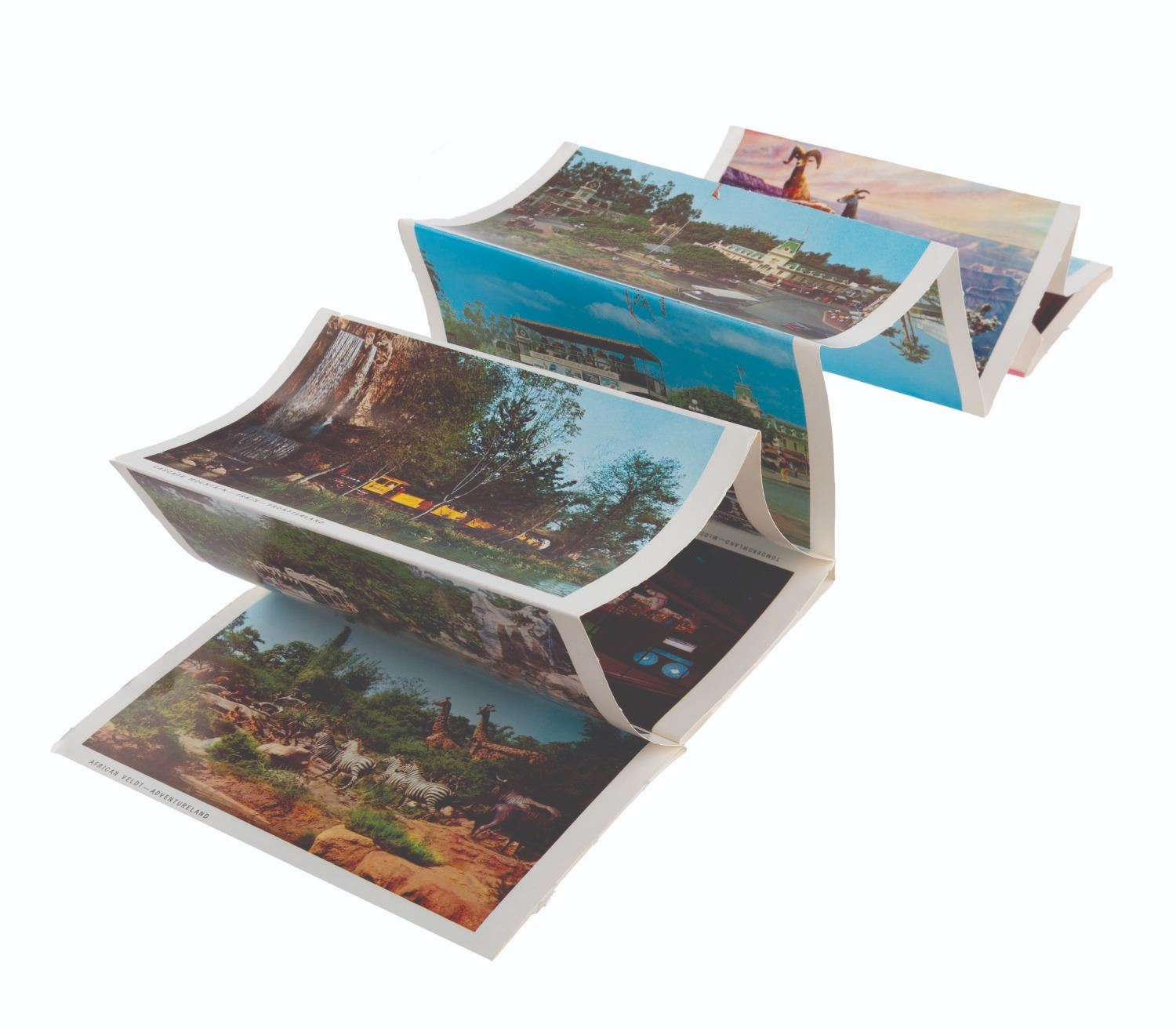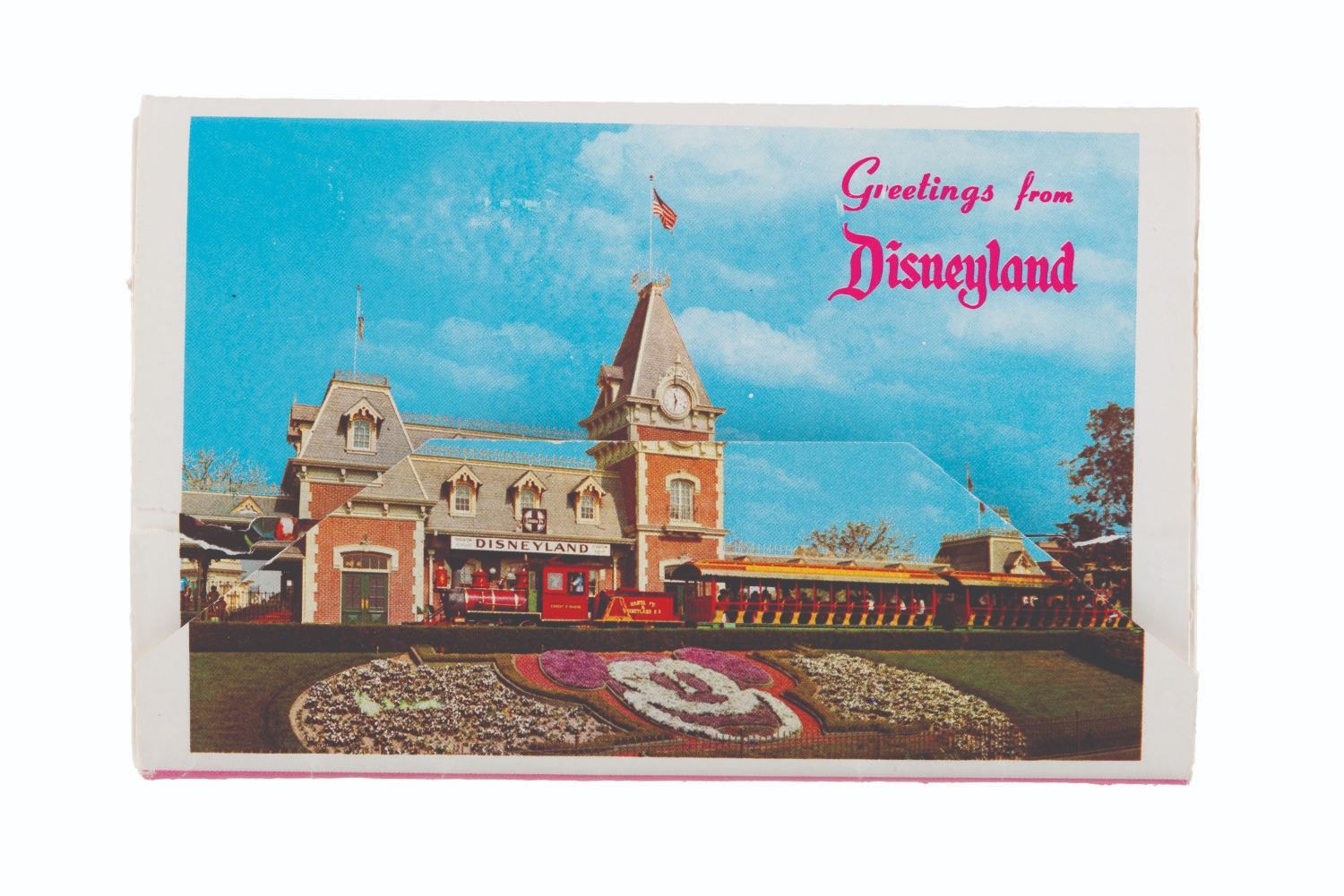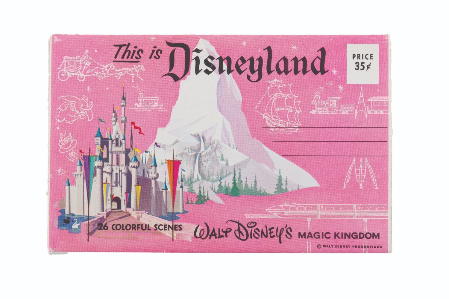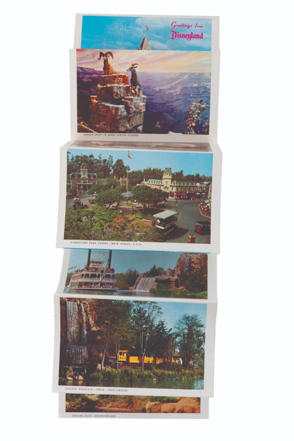 (Disneyland, 1960s) A This is Disneyland accordion mailer featuring 26 colorful scenes of Walt Disney's Magic Kingdom. Measuring 4 " x 6 ", the postcards are in fair to very good condition with light wear and a full horizontal tear through the New Orleans Square/Entrance to Disneyland card, which was partially repaired with tape.