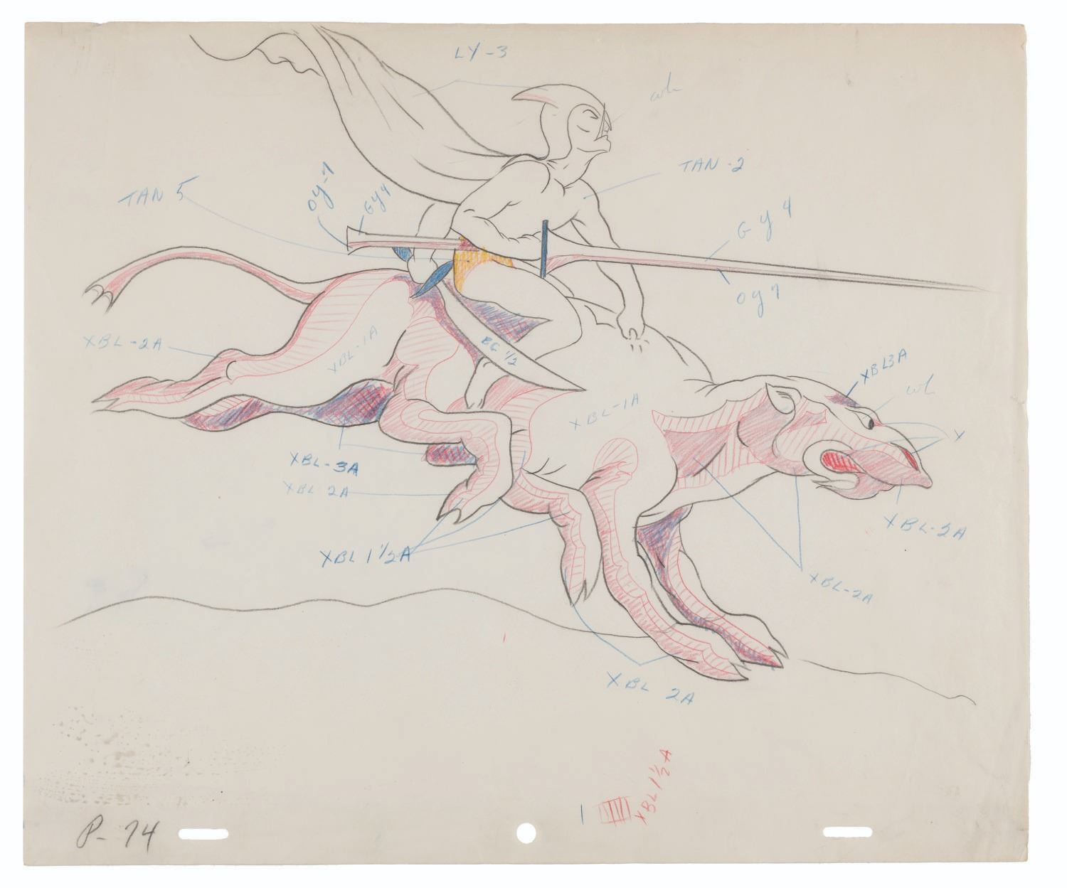 (Clampett, 1970s) A “Warlords of Mars” Thoat and rider color key drawing with hand-written notations from “Warlord of Mars.” This piece was created decades after the project was shelved, for presentations and the 1976 Jim Steranko’s Mediascene magazine feature covering the history of the project. With an image size of 8.25” x 10.75” on 10.5” x 12.5” animation paper, the graphite and colored pencil drawing is in good condition with creases, edge wear, stains, and discoloration from age.