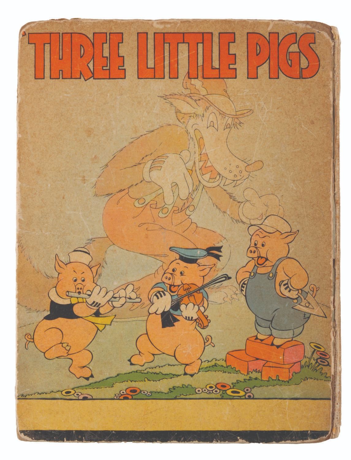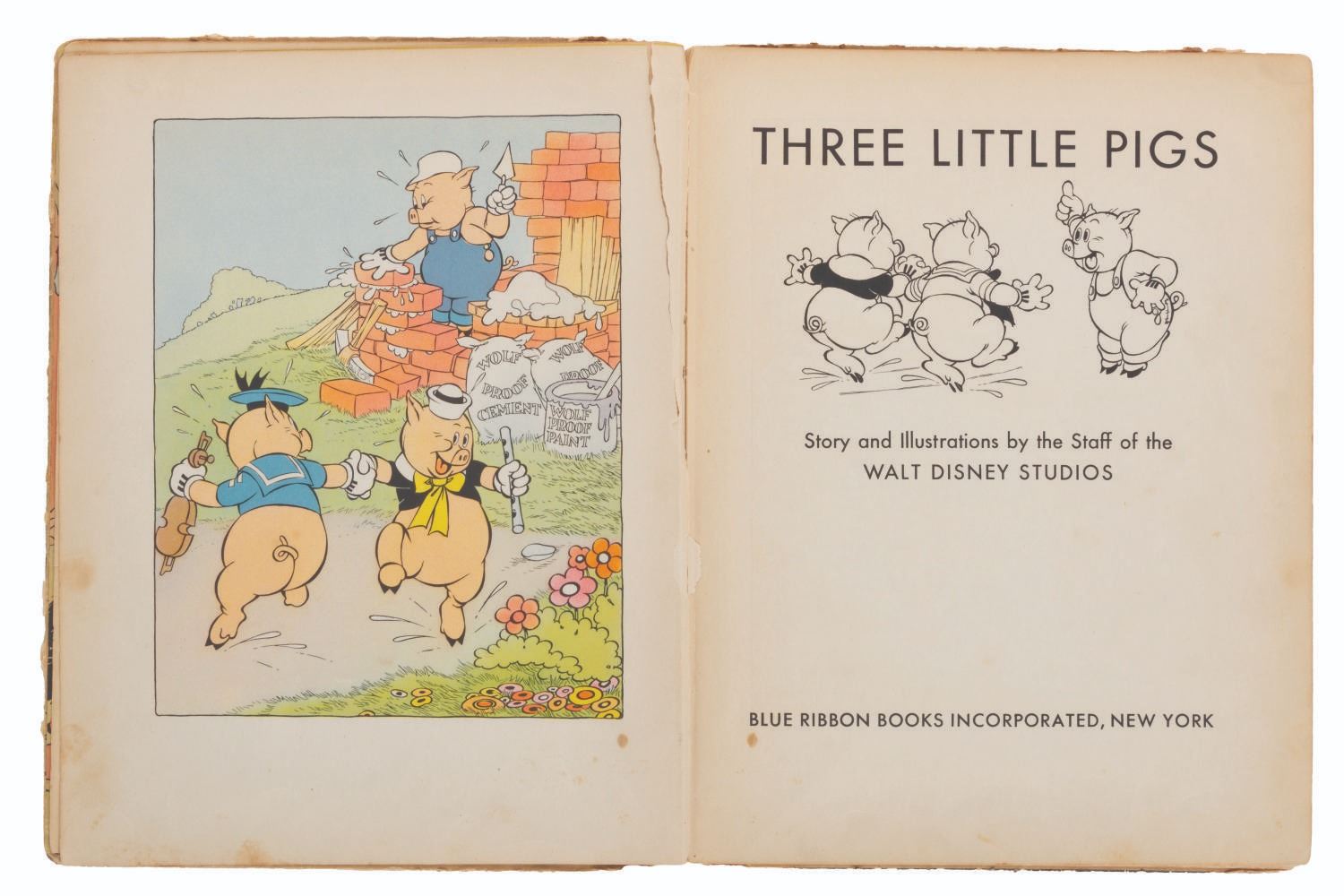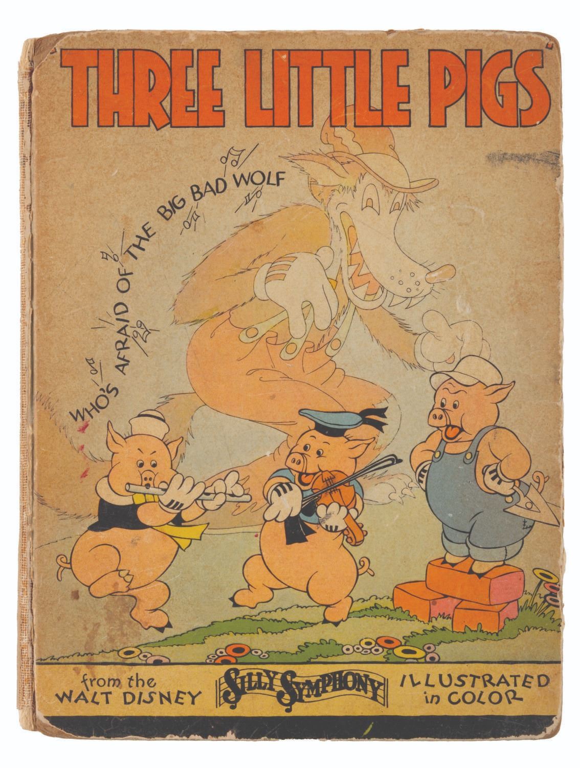 (Blue Ribbon Books, 1933) A hardcover "Three Little Pigs" book with story and illustrations by the staff of Walt Disney Studios. Measuring 8" x 10.25", the book is in fair condition with discoloration from age, soiling, spotting, inscriptions, wear, and separation at the spine.