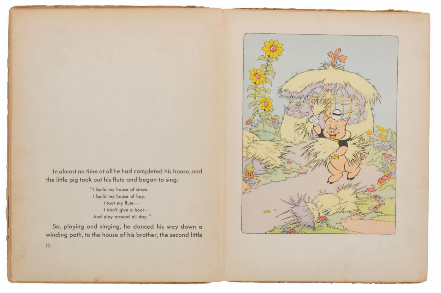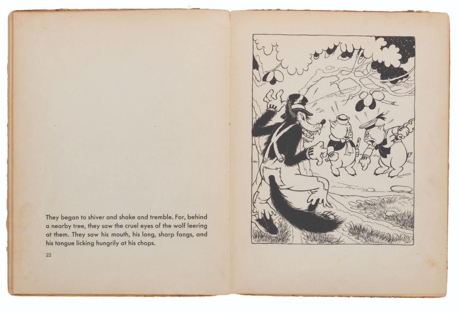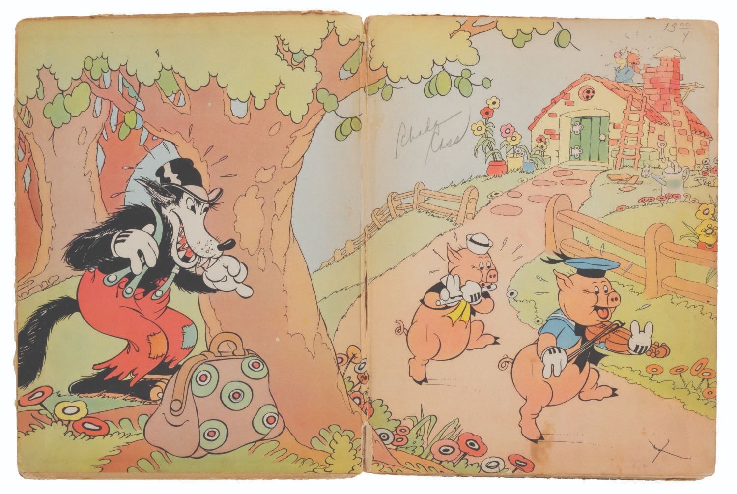 (Blue Ribbon Books, 1933) A hardcover "Three Little Pigs" book with story and illustrations by the staff of Walt Disney Studios. Measuring 8" x 10.25", the book is in fair condition with discoloration from age, soiling, spotting, inscriptions, wear, and separation at the spine.