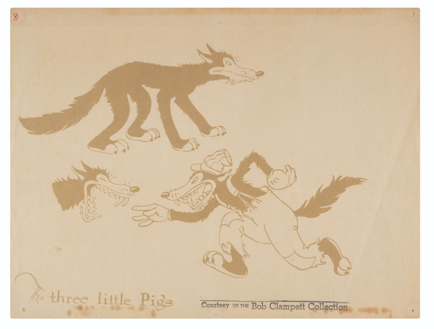 (Disney, 1933) A rare original printed model sheet of the Big Bad Wolf from the grounbreaking 1933 Disney Short “The Three Little Pigs.” Although Clampett had left the Disney Studio he, like other animators was still a fan of their work and would often go to screenings, etc. This model sheet comes from his personal collection and has his collection stamp on it. Measuring 12”x9”, the modeel sheet is in good condition with some fading and yellowing from age.