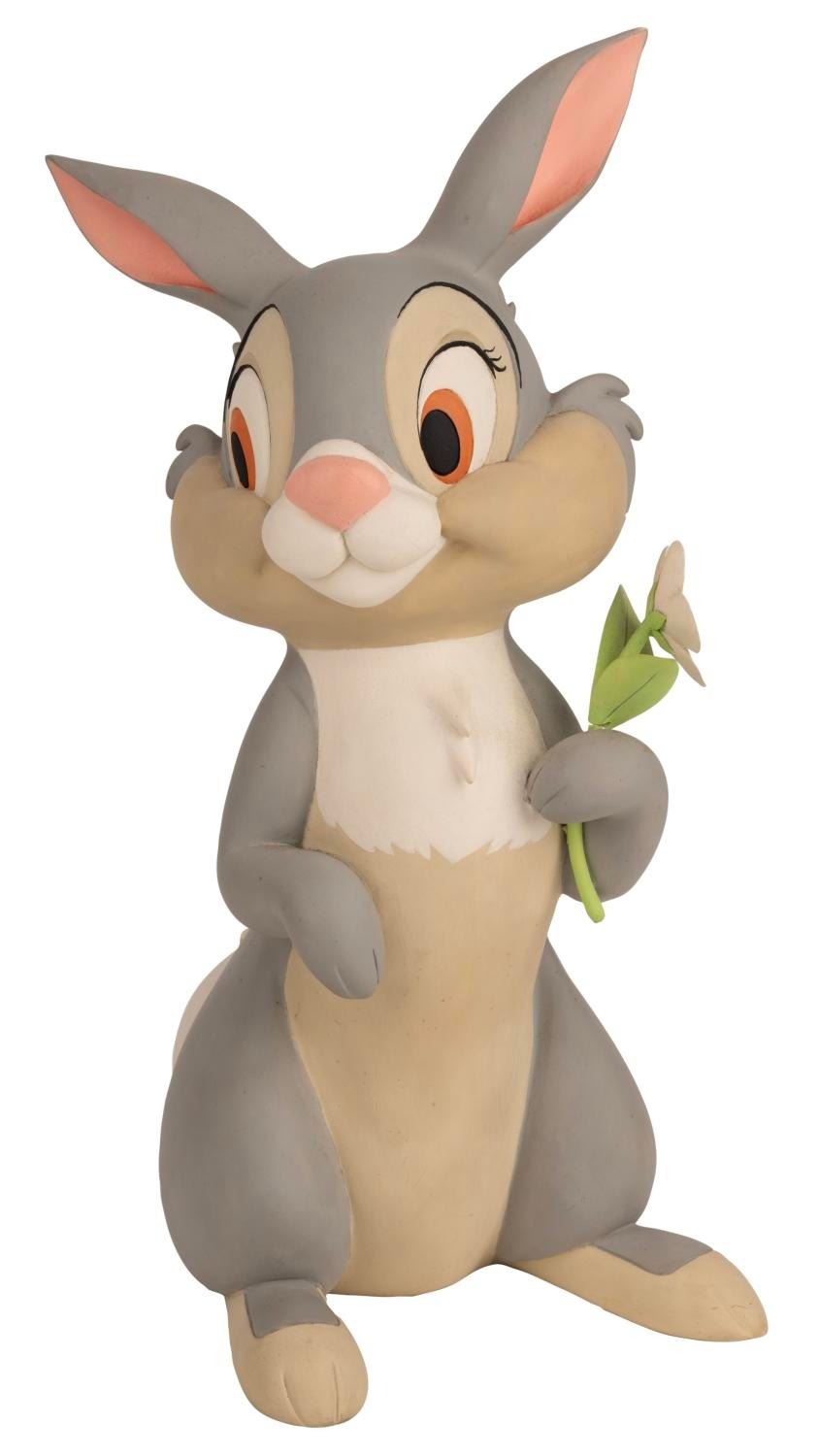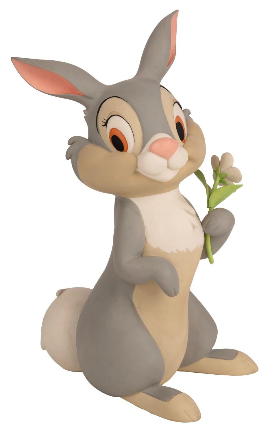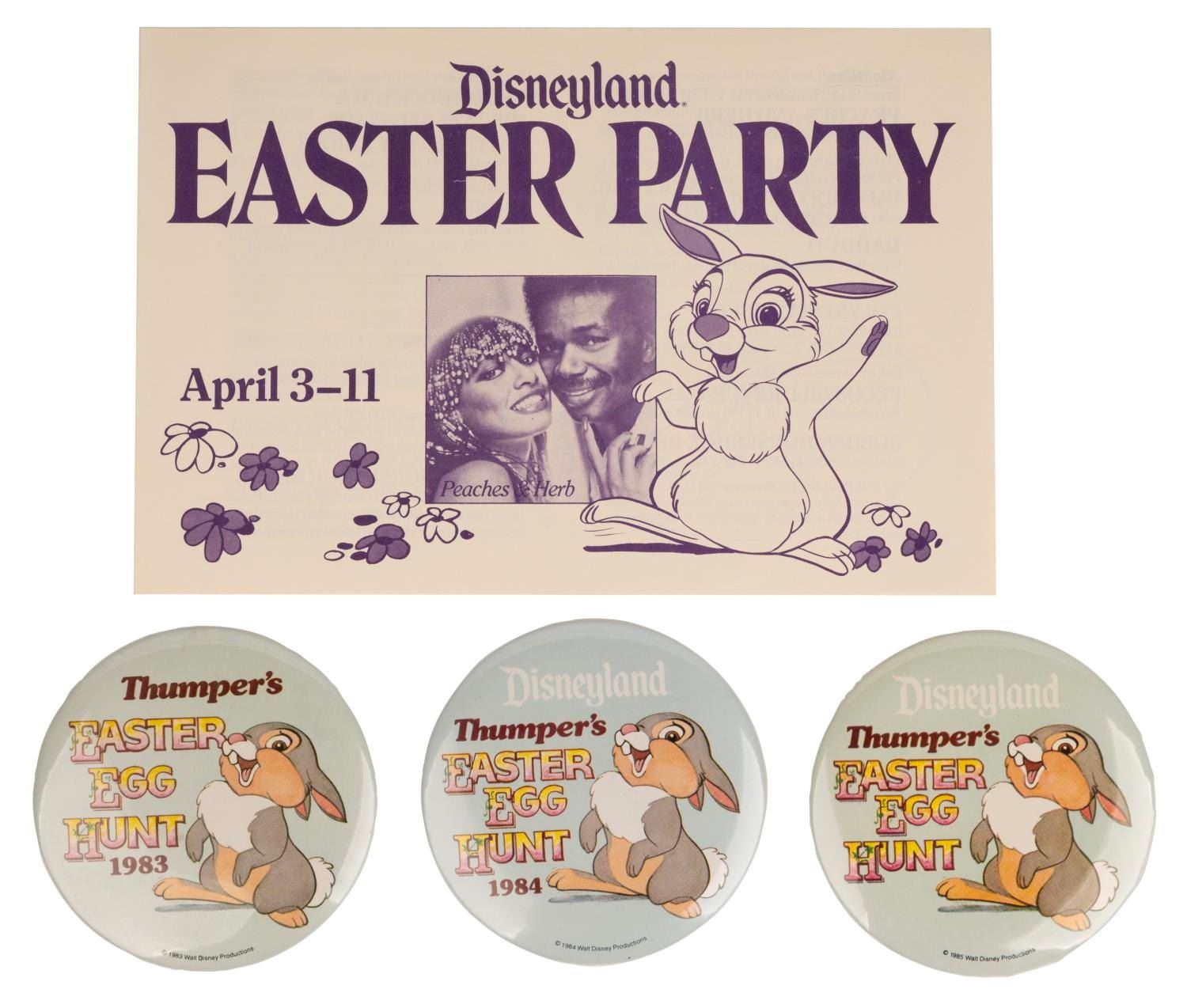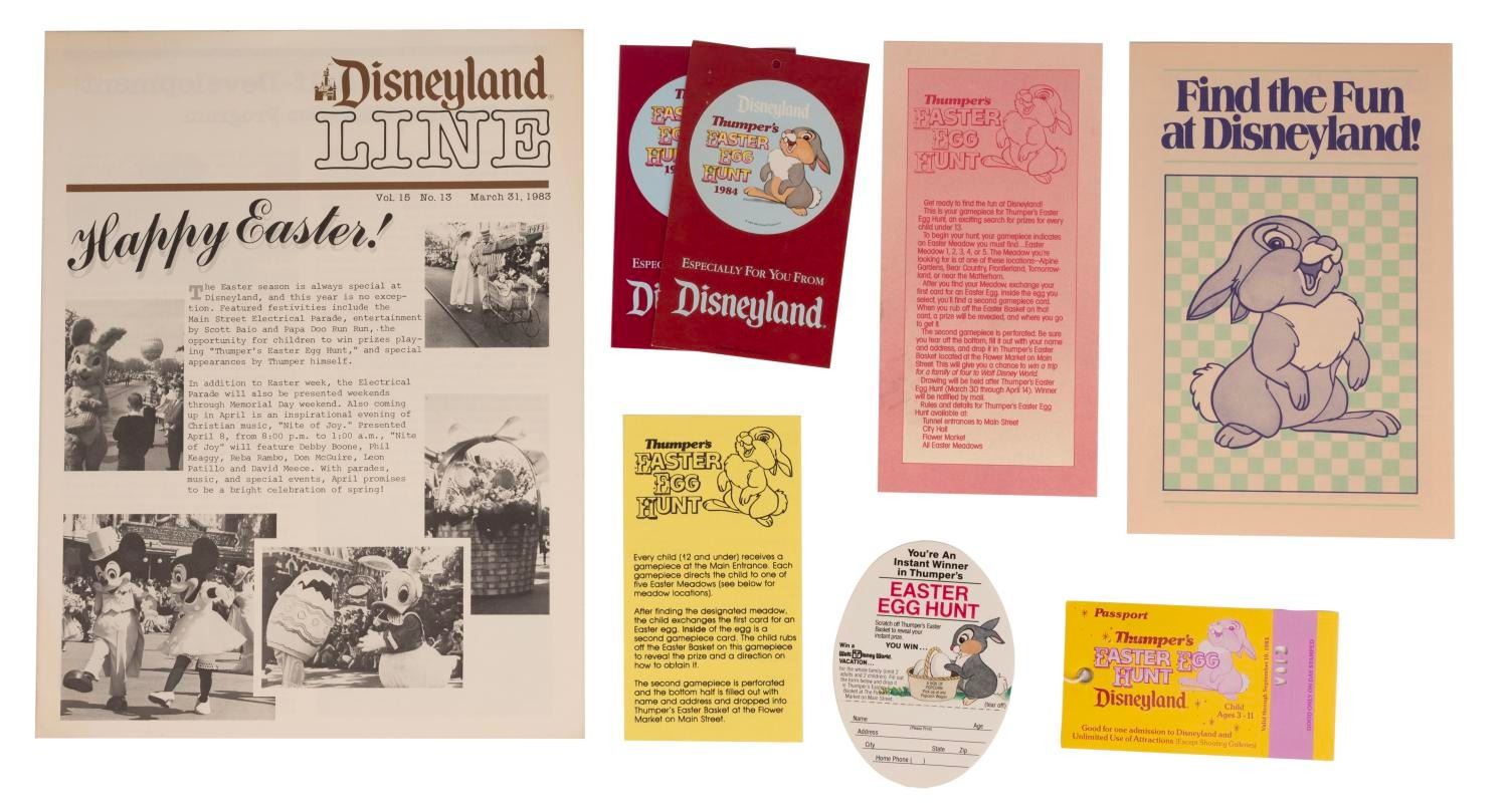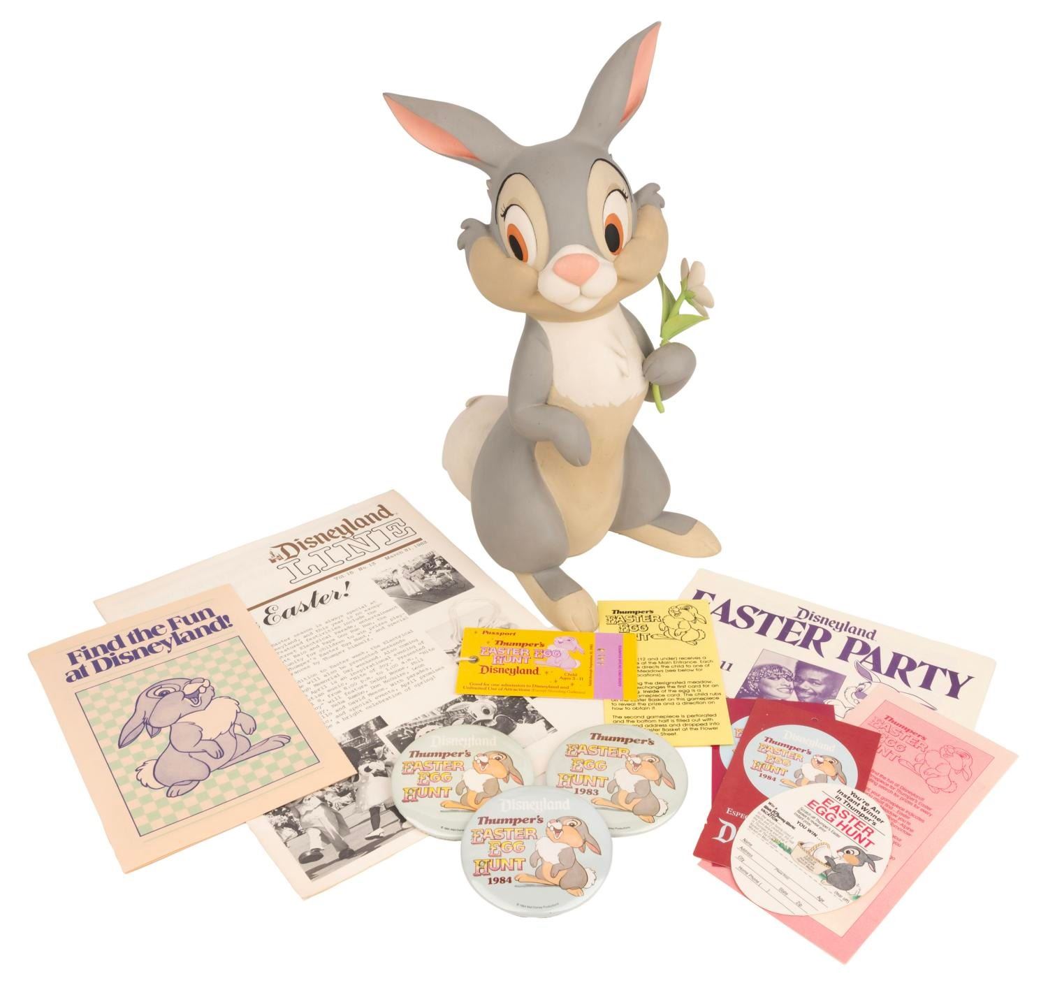 (Disneyland, 1980s) A Display figure of Thumper and collection of "Thumper's Easter Egg Hunt" memorabilia. The collection includes three buttons, a themed child's admission ticket (voided), an instant winner form, a 1982 Easter weekend entertainment program, two small information flyers about the Egg Hunt, and a March 1983 copy of the Disneyland Line with an "Easter in Disneyland" cover story. The Thumper figure is exquisitely sculpted and painted, in the style and level of craftsmanship seen online in Emporium window pieces and other Disneyland Park display sculpts. The figure measures 5.25" x 8" x 13" tall and is in good condition with slight damage to the stem of the flower, and wear from display including small scuffs. The paper items measuring from 2.25" x 4" to 8.5" x 11" are all in very good condition with some light wear.