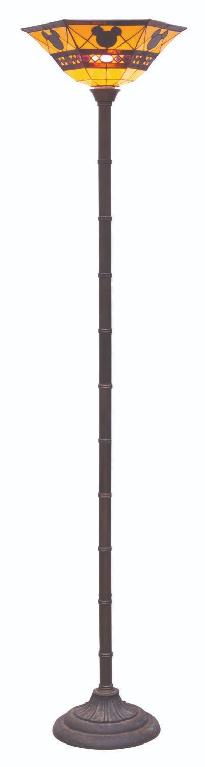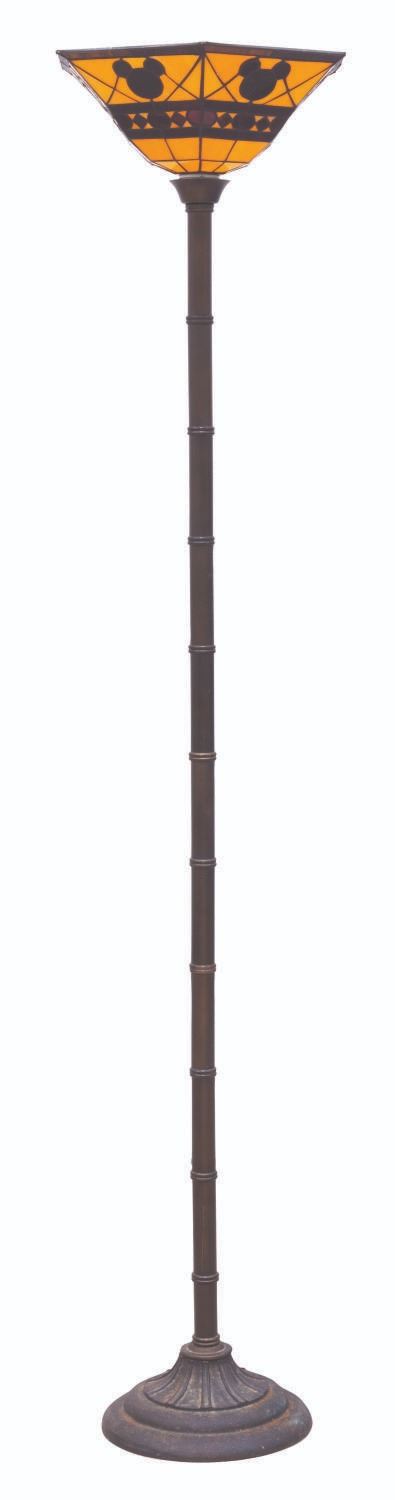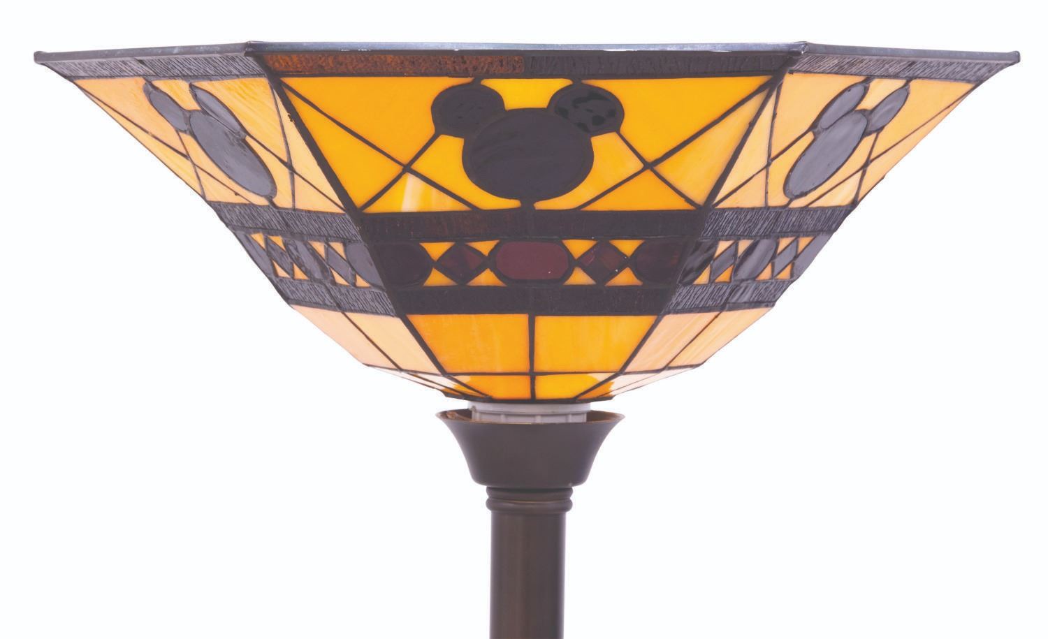 (Disney, 2000s) A Tiffany-style Mickey Mouse floor lamp originally sold by Disney Shopping. The beautiful glass shade, patterned with Mickey Mouse heads, screws onto the metal neck and base. The lamp's light function and on/off button worked when tested. Measuring 70” tall and 16” in diameter, the floor lamp is in very good condition with light wear and oxidation.