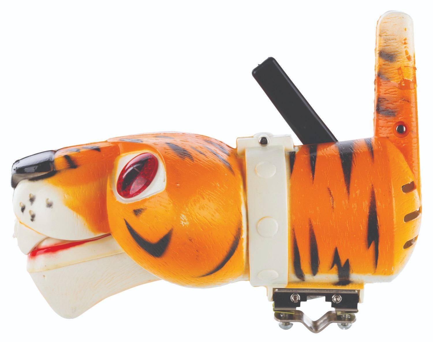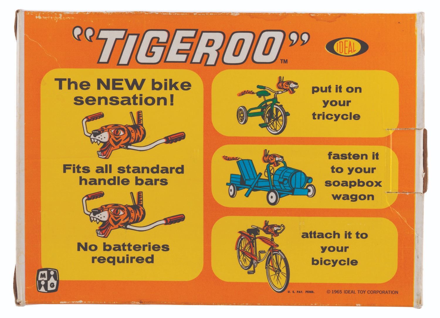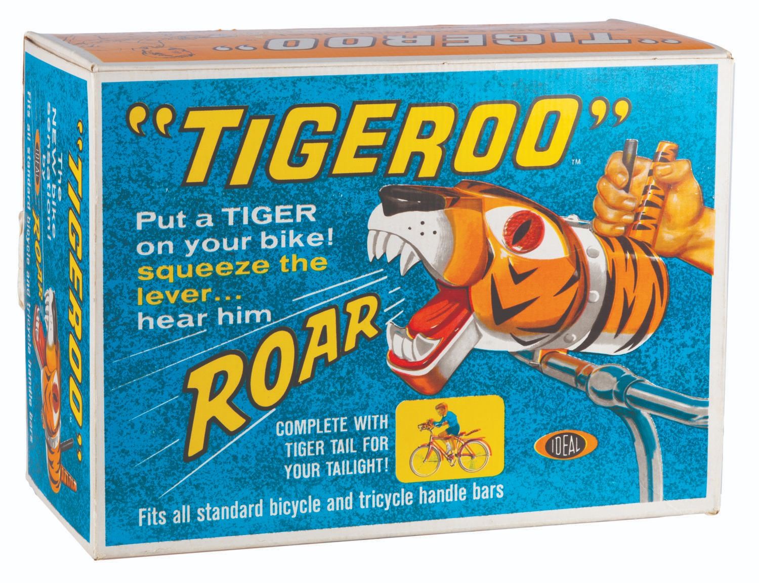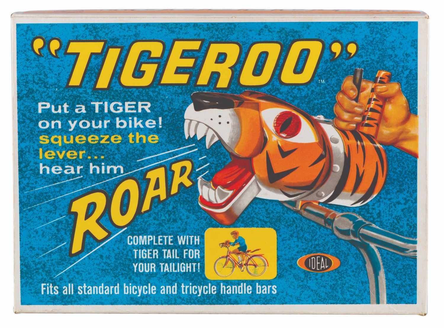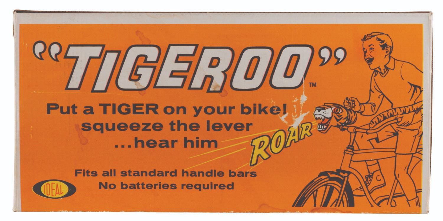(Ideal Toy Company, 1965) A Tigeroo bike horn manufactured by Ideal. When the lever is squeezed, the tiger’s mouth opens and it roars. The bike horn advertises that it attaches to all bicycle and tricycle handlebars and includes a tie-on tiger tail to give your bike some jungle flair. The 7.5” x 8” bike horn, 9” tiger tail, and 6” x 12.5” original box are in very good condition with scratches, paint loss on the tail, additional very light paint loss, and light wear.
