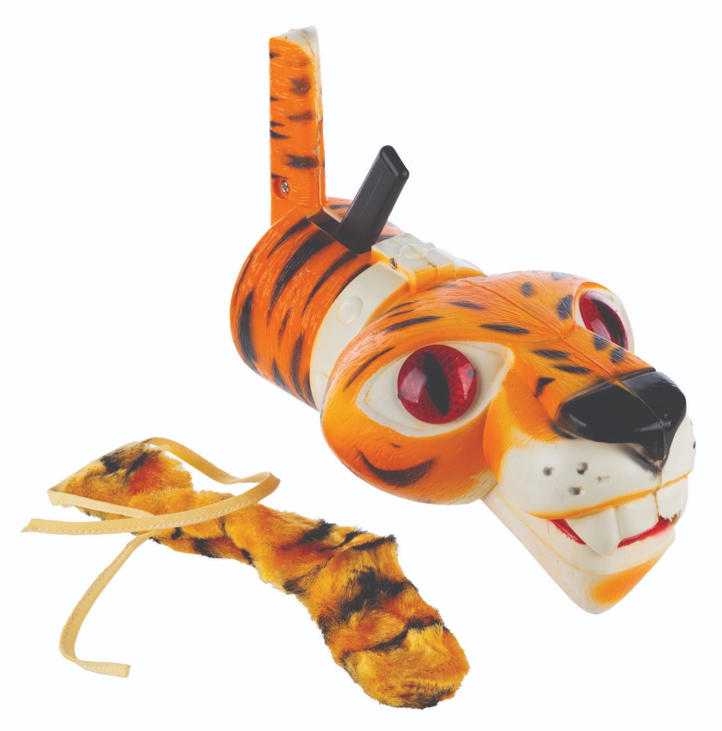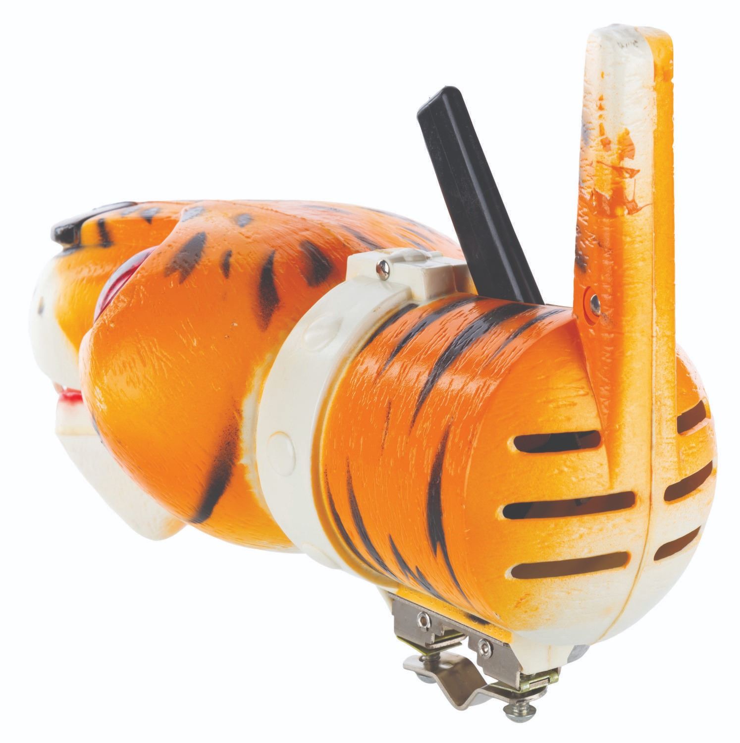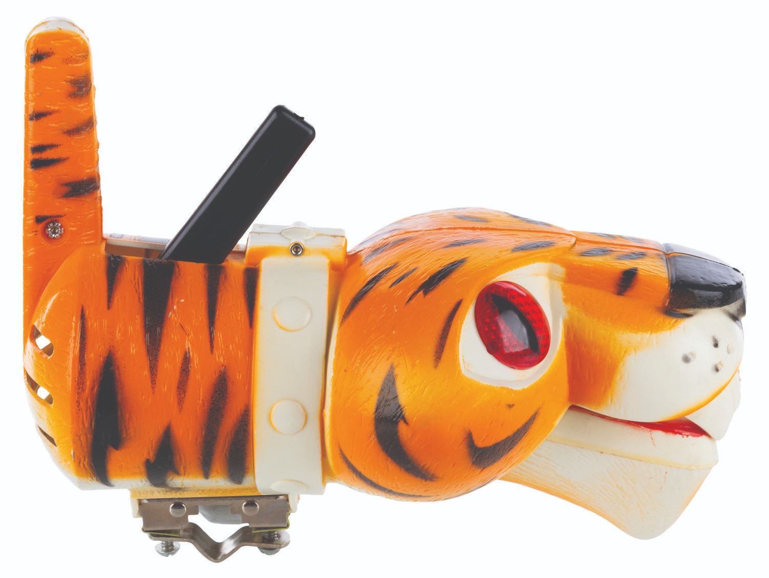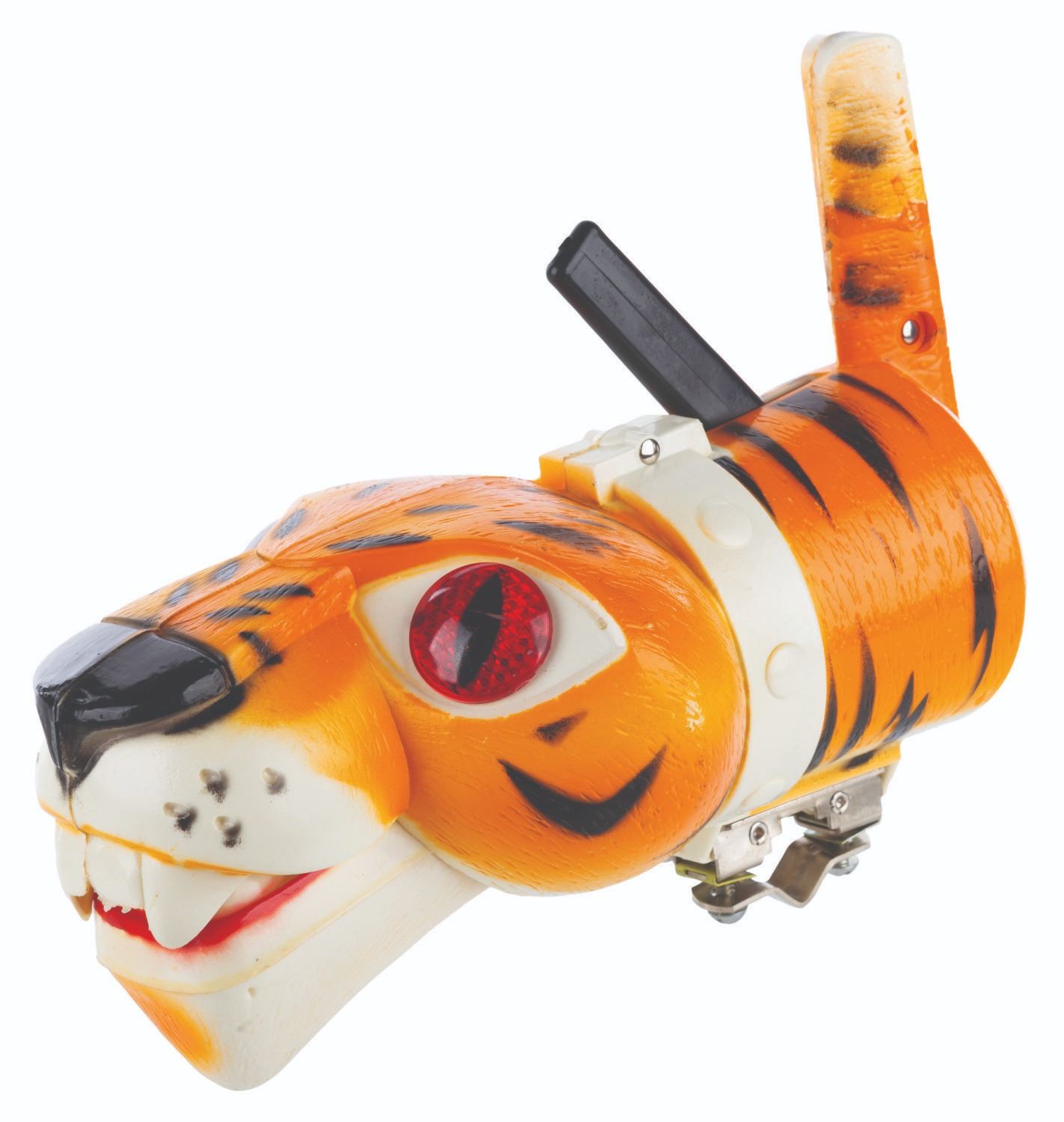 (Ideal Toy Company, 1965) A Tigeroo bike horn manufactured by Ideal. When the lever is squeezed, the tiger’s mouth opens and it roars. The bike horn advertises that it attaches to all bicycle and tricycle handlebars and includes a tie-on tiger tail to give your bike some jungle flair. The 7.5” x 8” bike horn, 9” tiger tail, and 6” x 12.5” original box are in very good condition with scratches, paint loss on the tail, additional very light paint loss, and light wear.