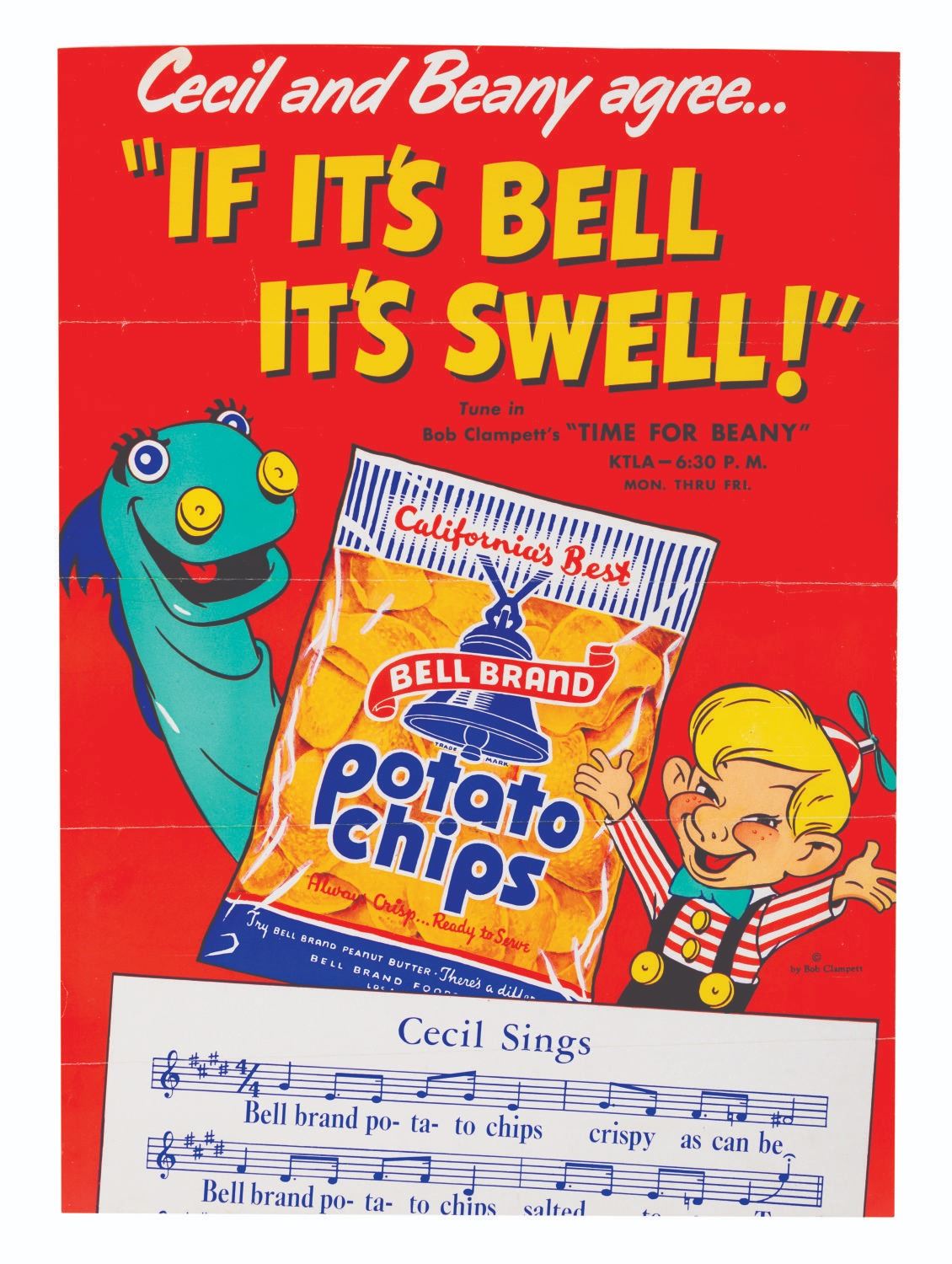 (Bell Brands, 1951) An extremely rare poster for Bell Brand potato chips featuring Beany and Cecil. Bell sponsored “Time for Beany” in 1951. Measuring 13.75” x 19”, the poster displays in very good condition with four horizontal fold lines and light edge wear.