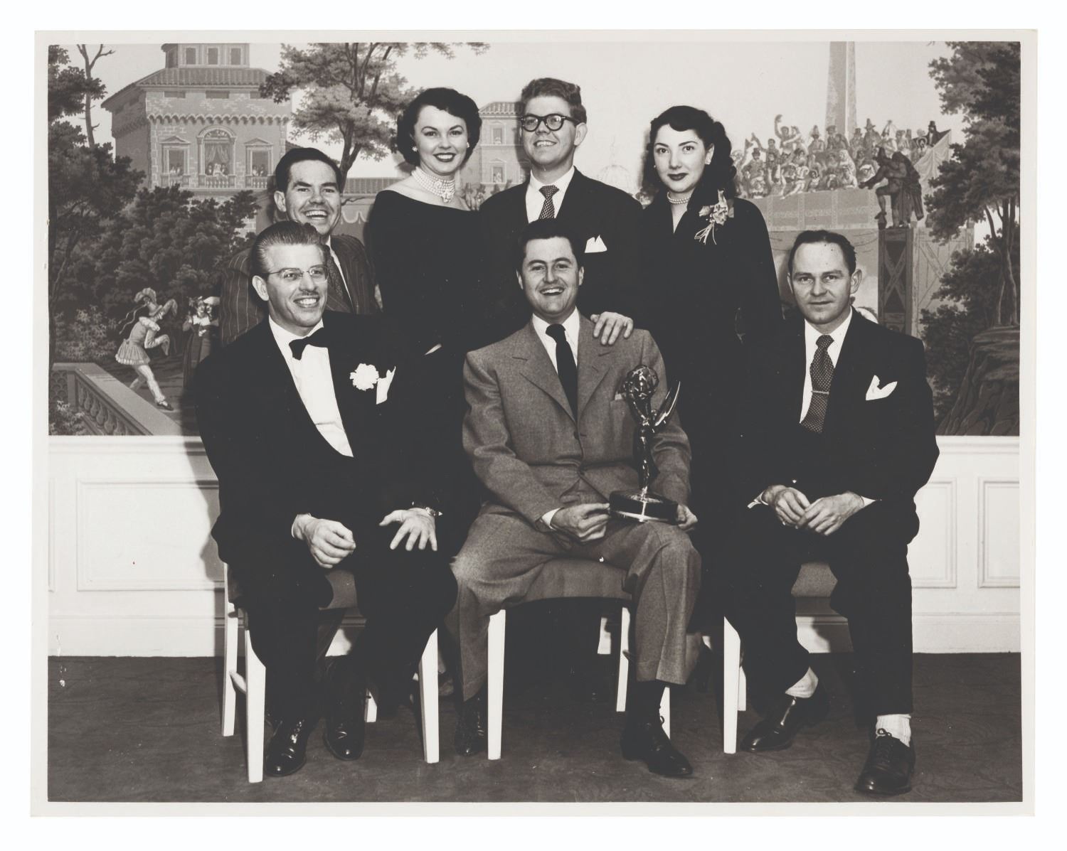 (Clampett, 1950) A photograph of Bob Clampett and the “Time for Beany” crew taken at the 2nd Emmy Awards after the series won the first award for Best Children’s Show. Pictured standing from left to right are Daws Butler, Donna Peterson, Stan Freberg, and Joan Gardner, and seated, Charles Shows, Bob Clampett, and Bill Oberlin. Measuring 8” x 10” the photo is in good condition with light edge wear, creases, and holes from staples along the left edge which do not affect the image.