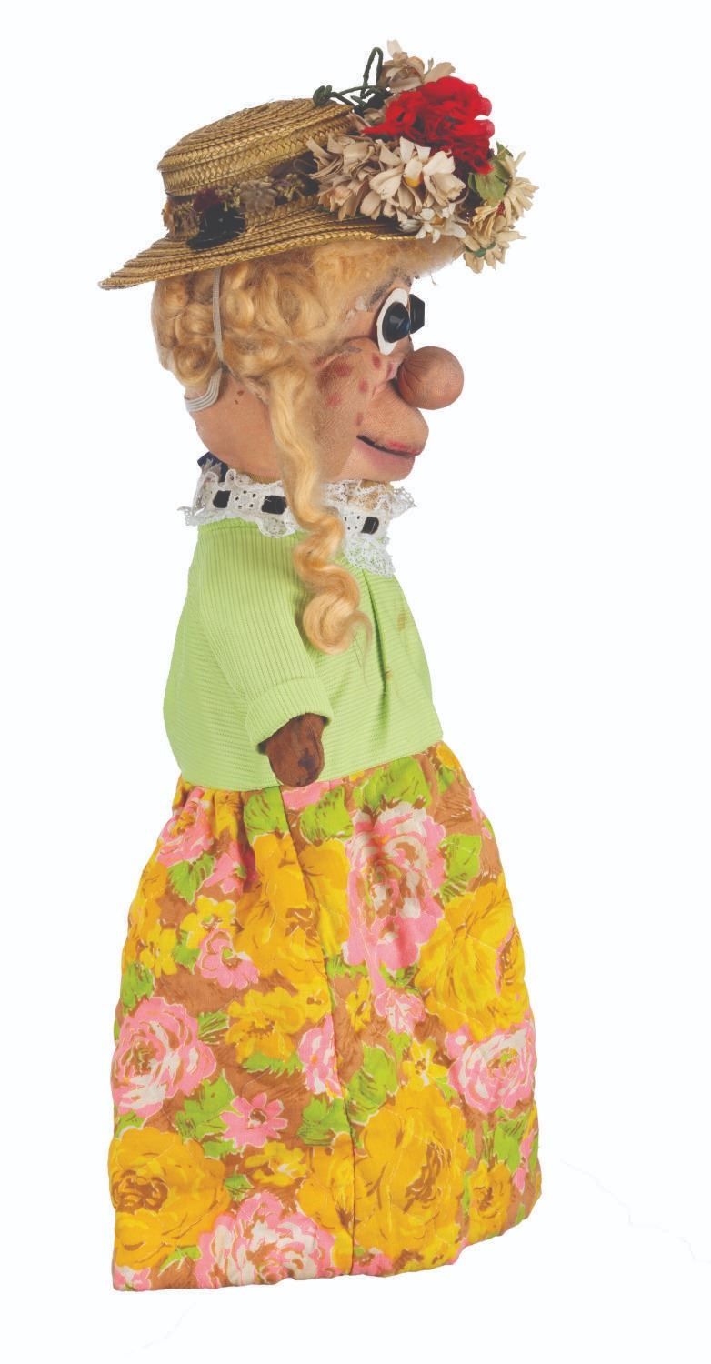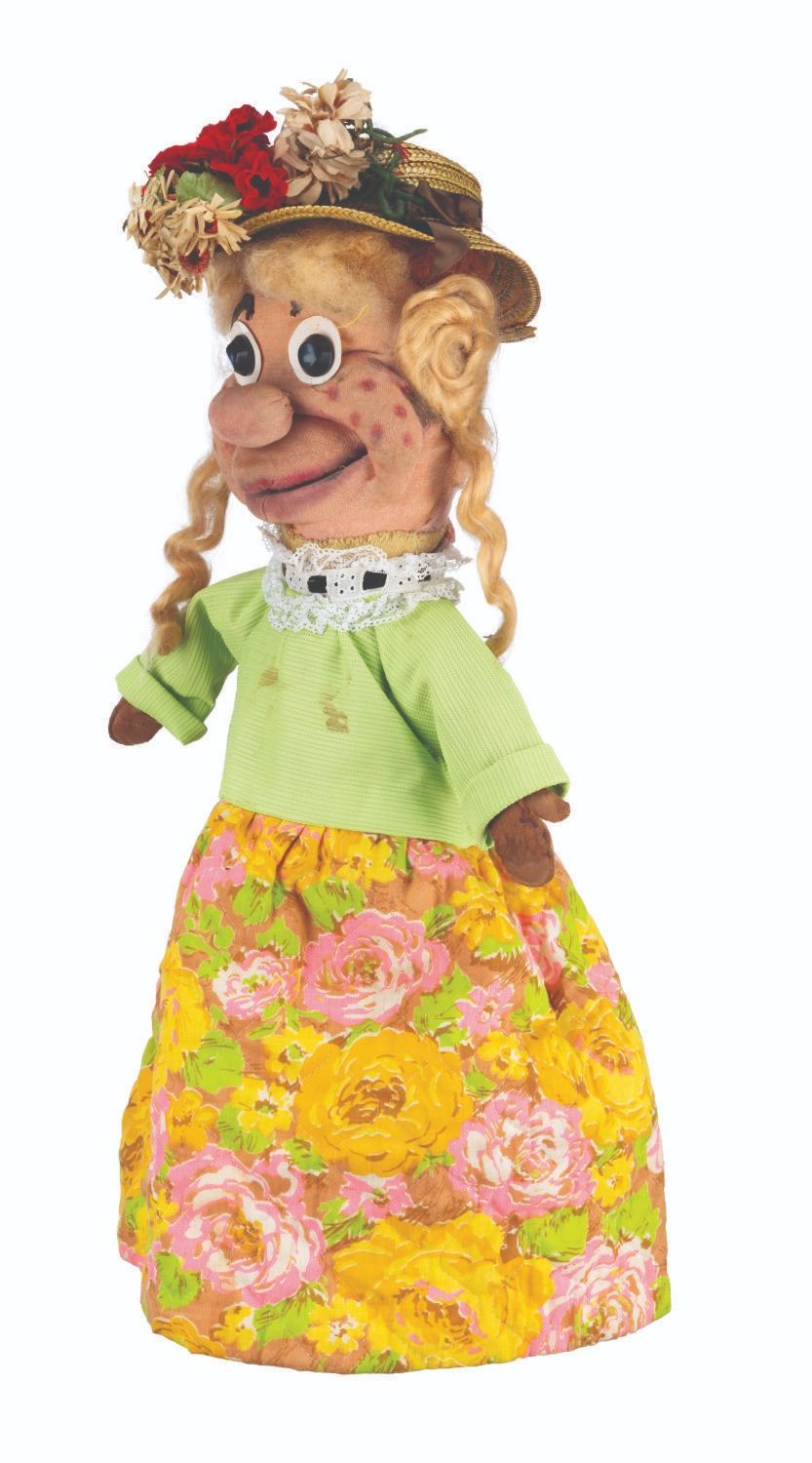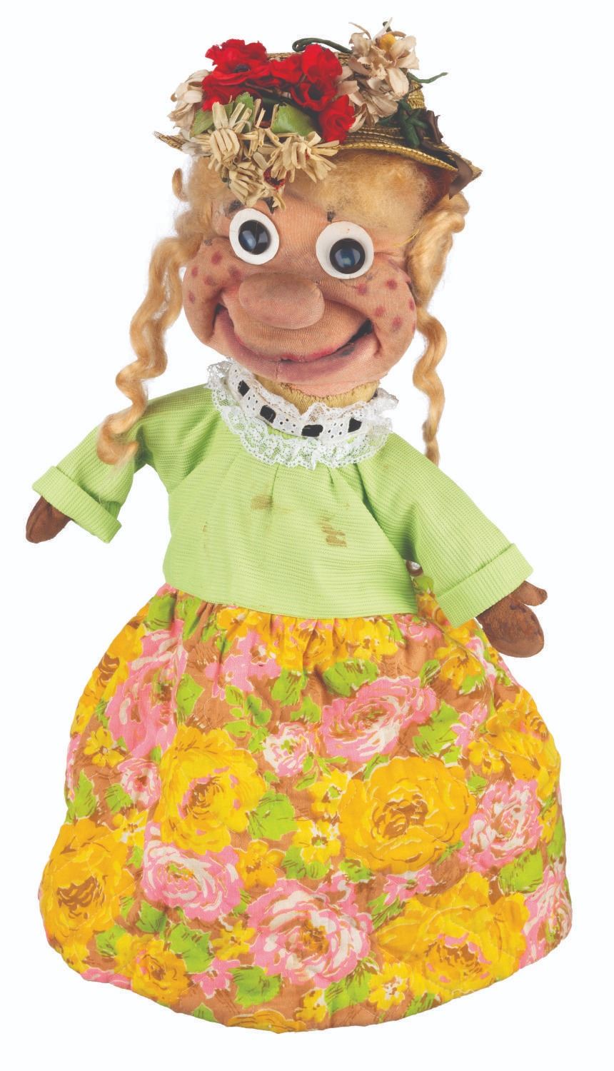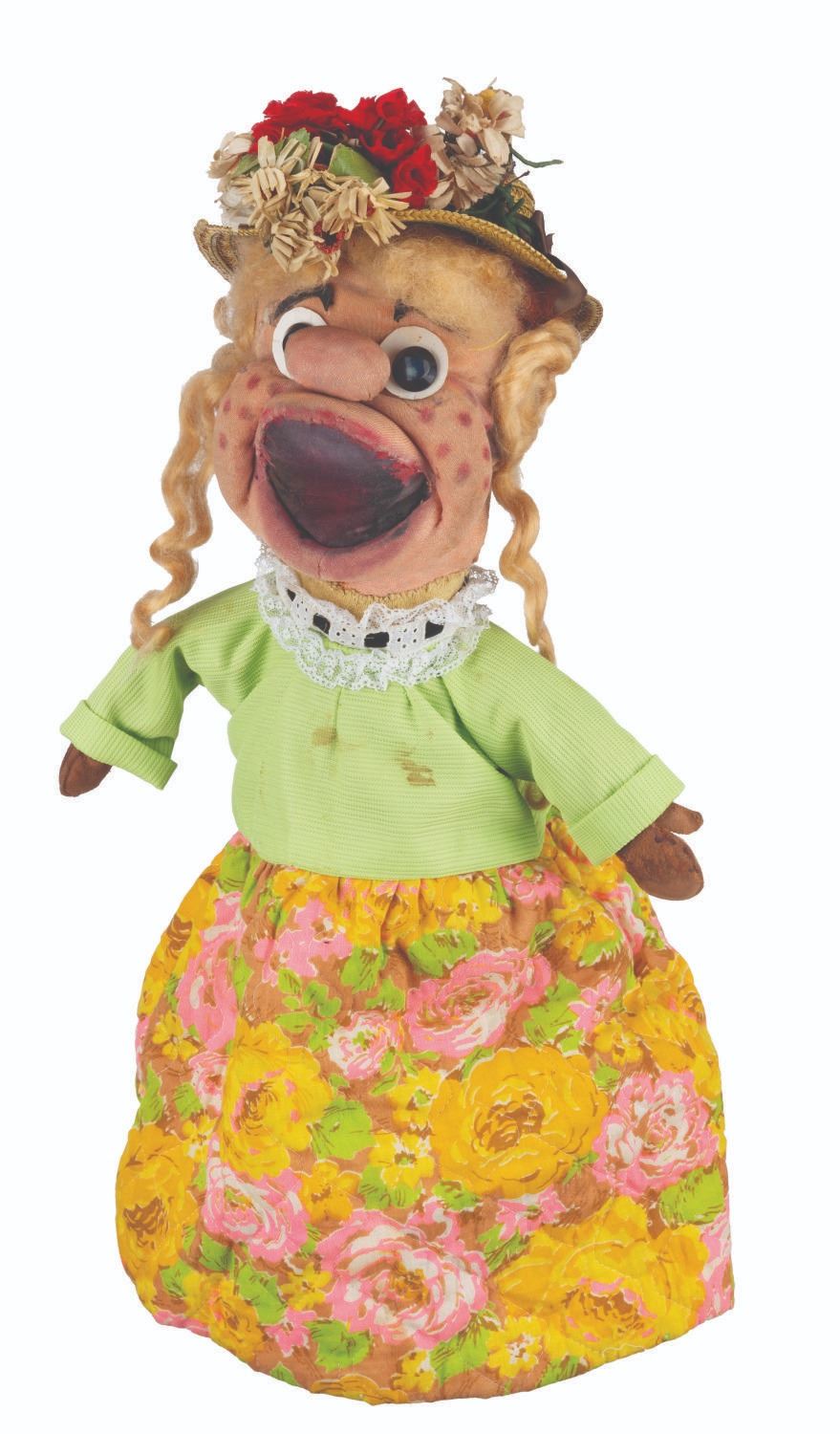 (Clampett, 1954) A production-used hand puppet of a woman in a flower dress and hat from “Buffalo Billy.” Measuring 22” tall, the puppet is in good condition with light discoloration from age, stains, glue residue, and wear from production use.