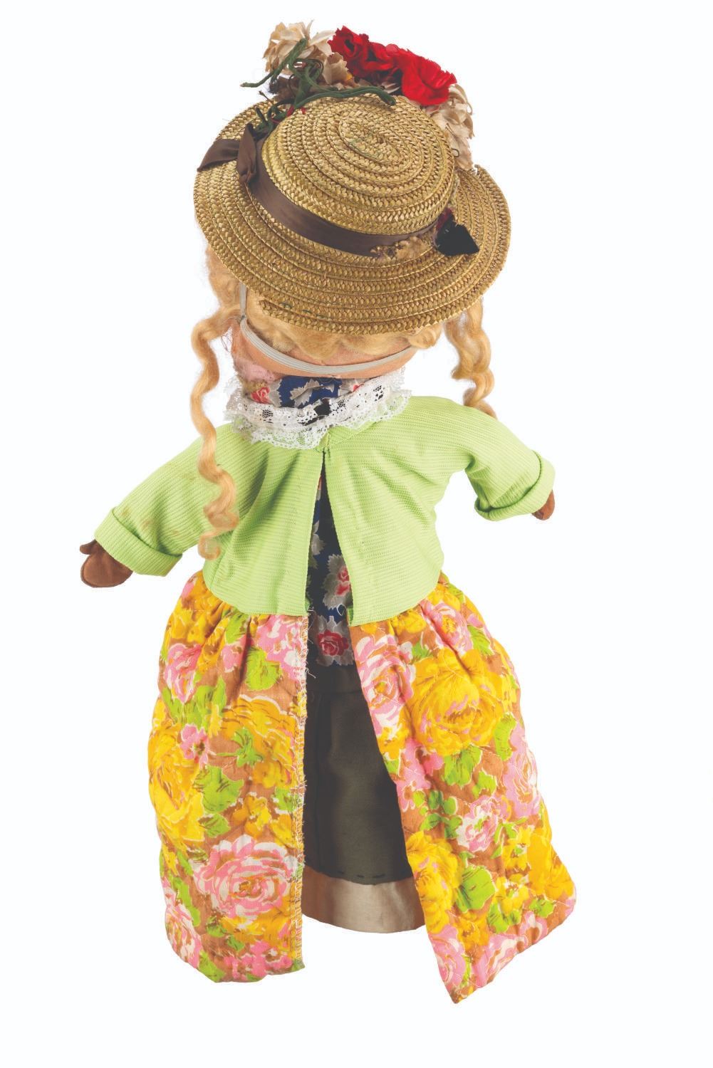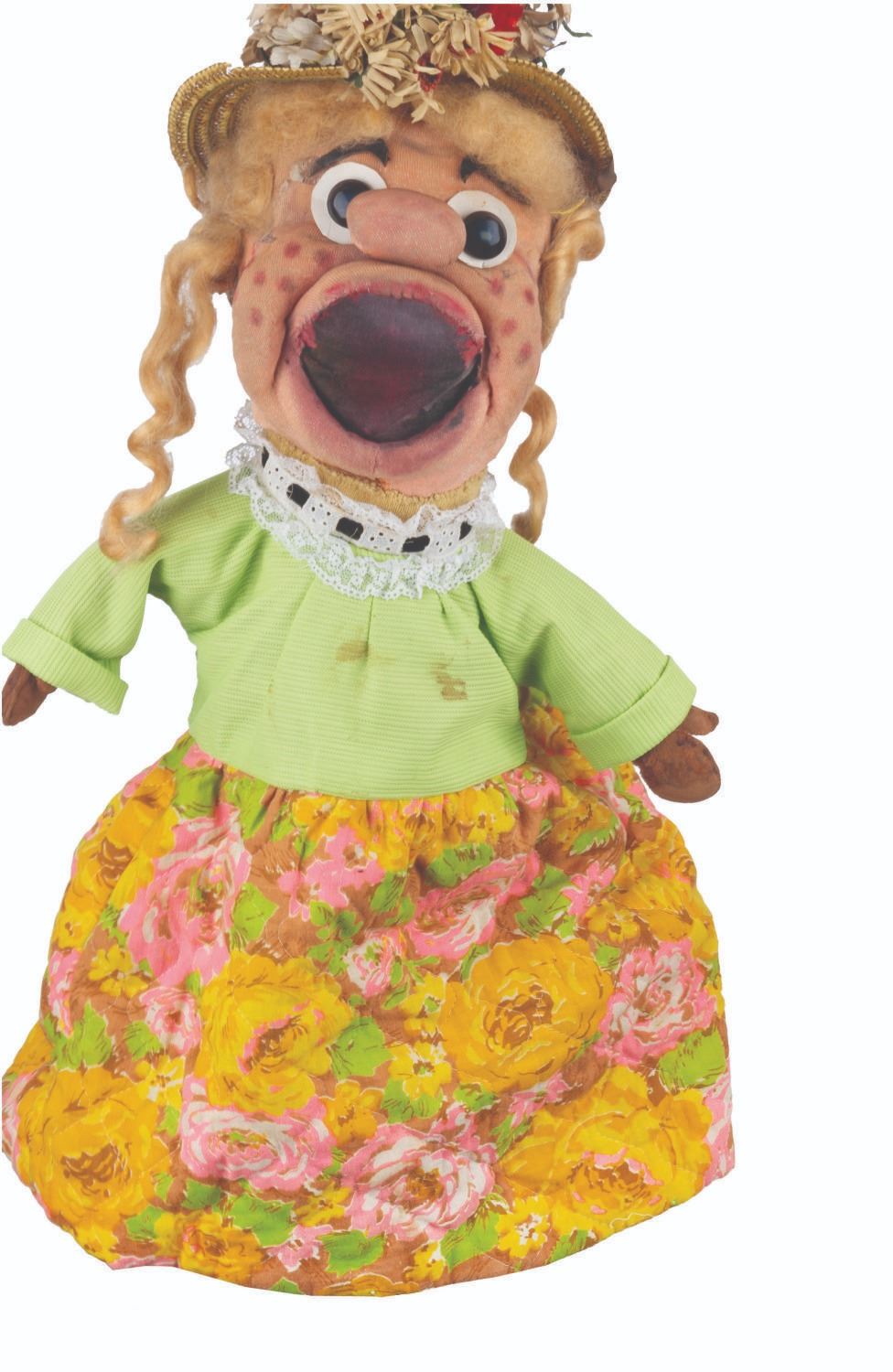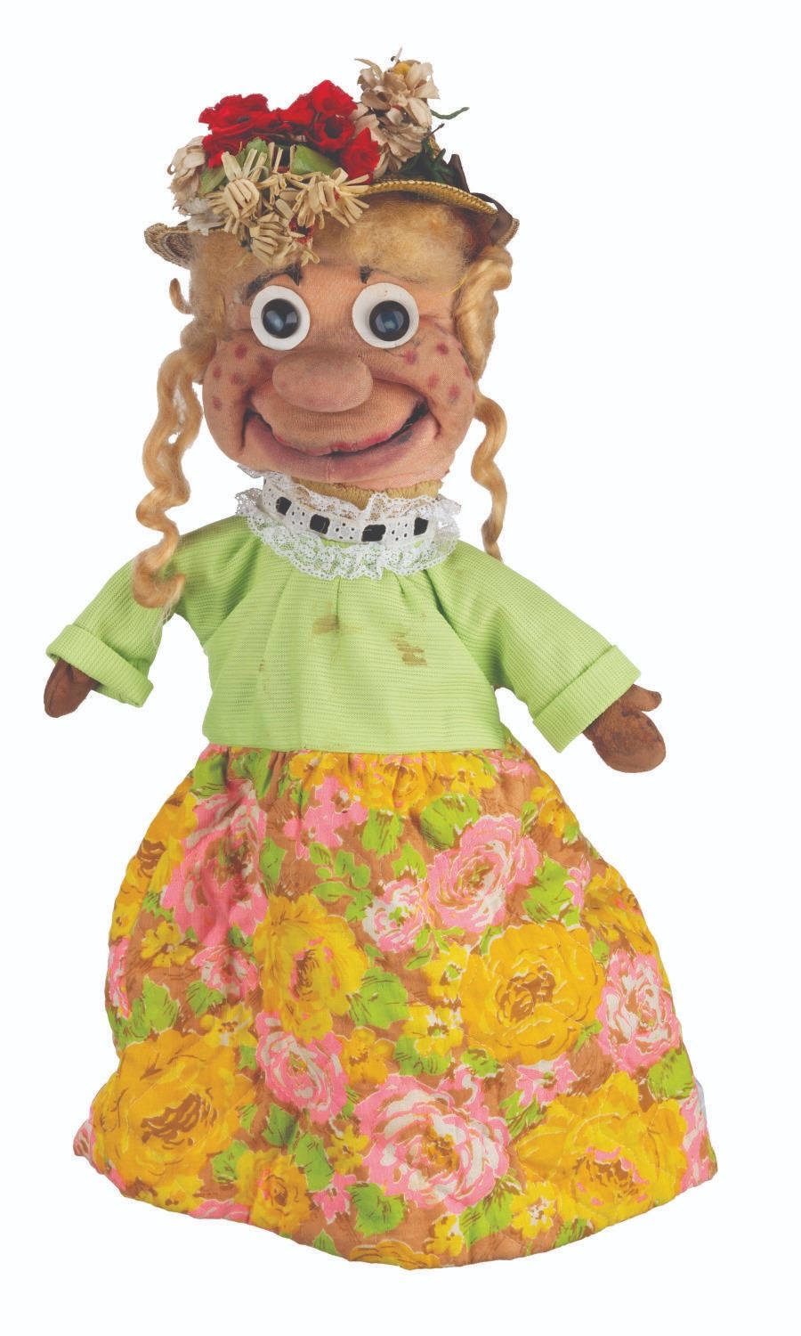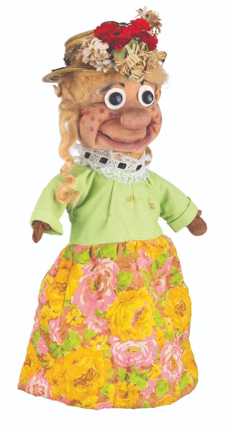 (Clampett, 1954) A production-used hand puppet of a woman in a flower dress and hat from “Buffalo Billy.” Measuring 22” tall, the puppet is in good condition with light discoloration from age, stains, glue residue, and wear from production use.