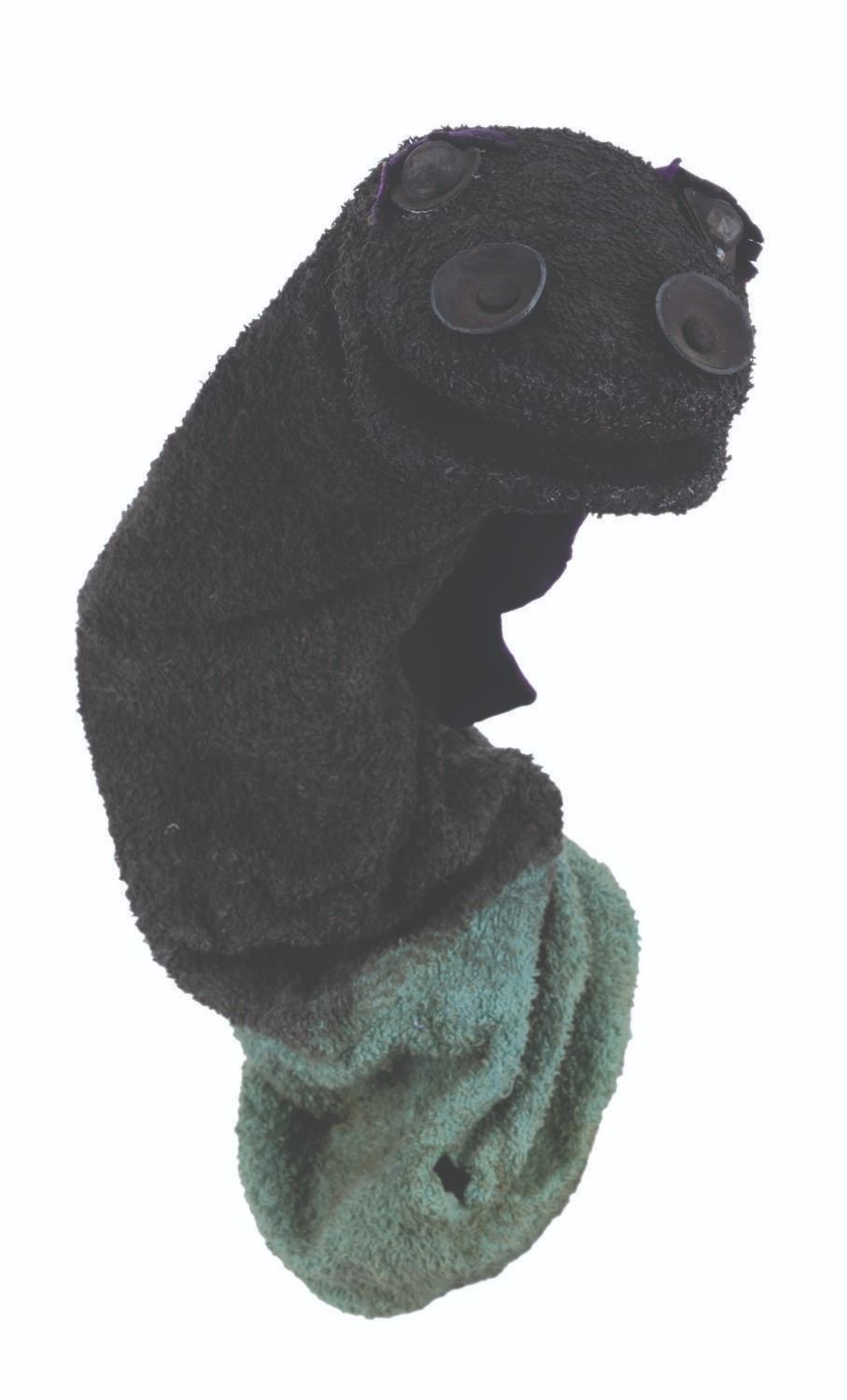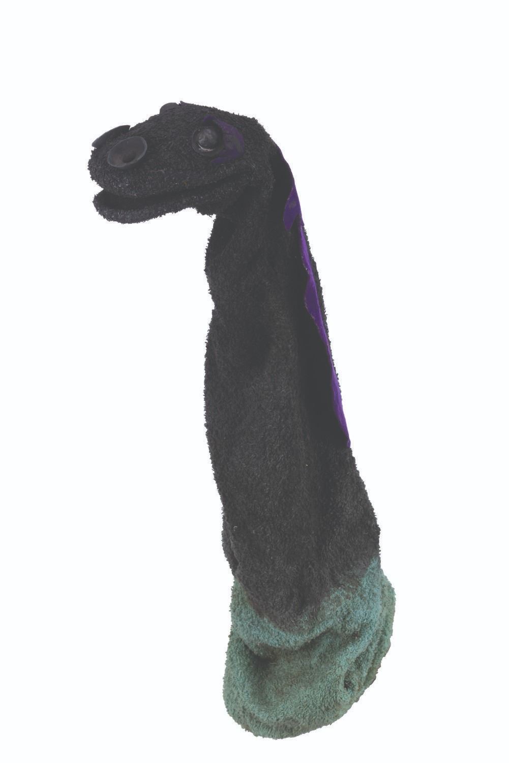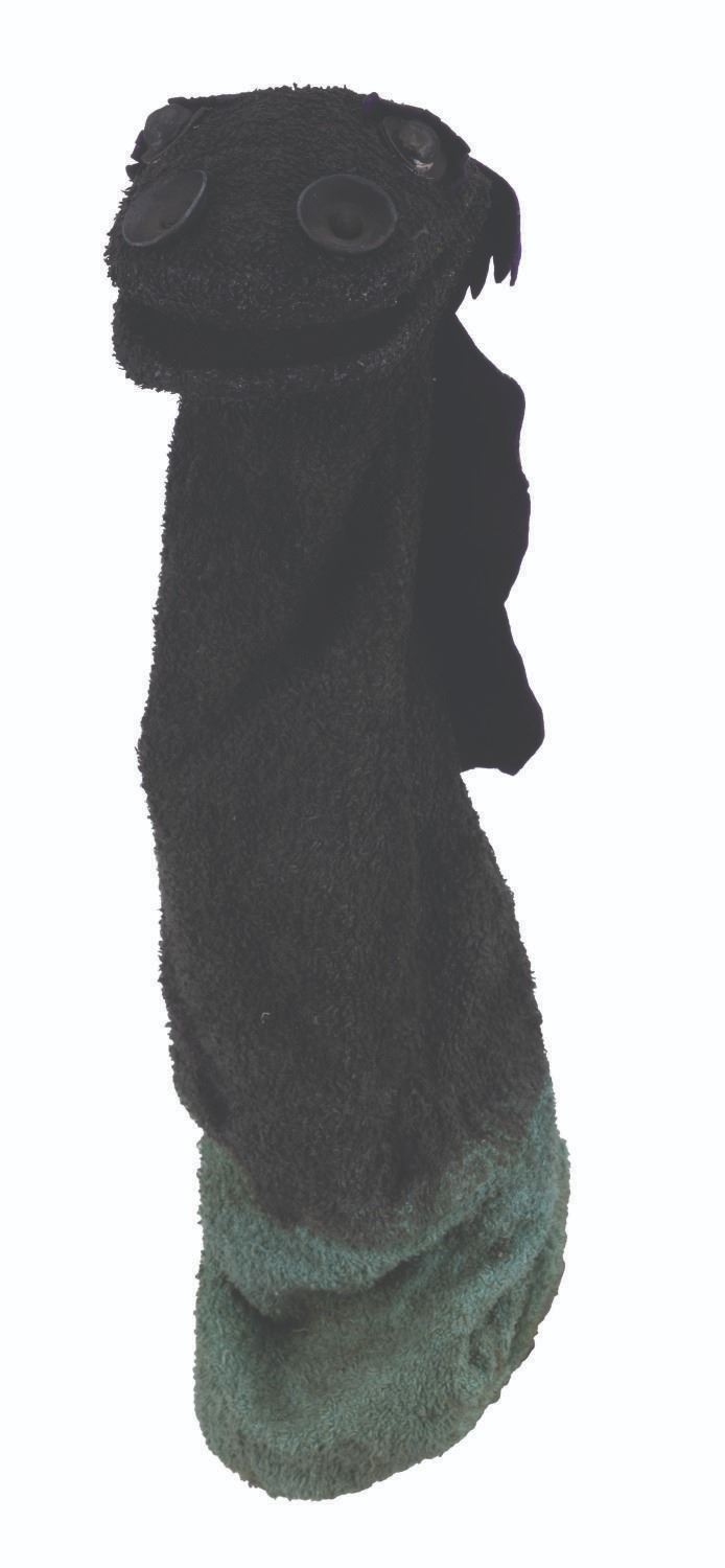(Clampett, 1949-1955) A screen-used “Time for Beany” puppet of Cecil after an explosion. Throughout the show's seven-year run, it was common for a puppet to be uniquely modified for specific scenes. This “charred” Cecil puppet, showing some original green fabric, was painted black to appear as if it survived an explosion and is covered in soot. Constructed of terry cloth, rubber, felt, plastic, foam, and cardboard and measuring 27” x 9.5” x 5” deep, the puppet displays is in good condition with a 1” seam split on the left side, soiling from production use, and discoloration from age.
