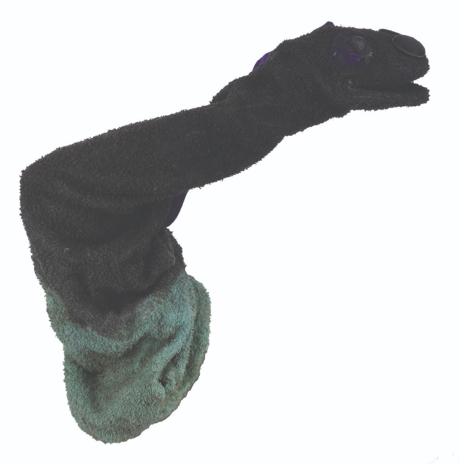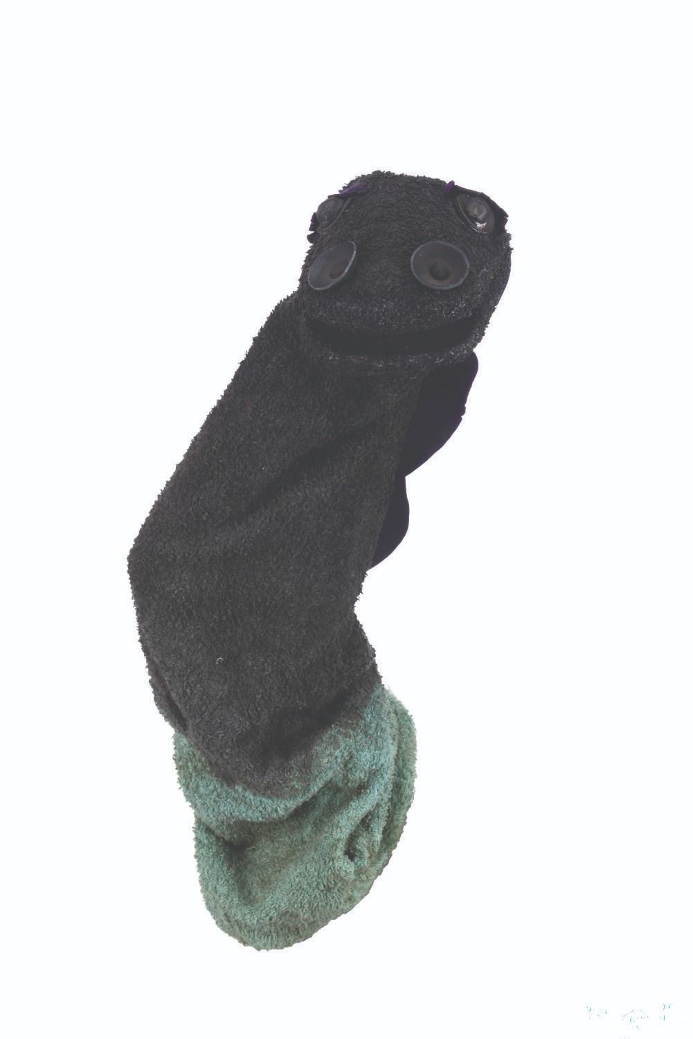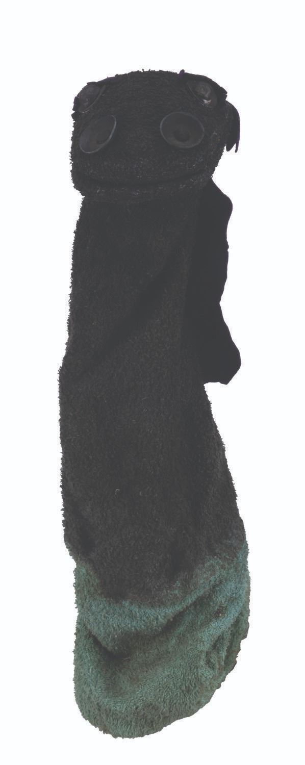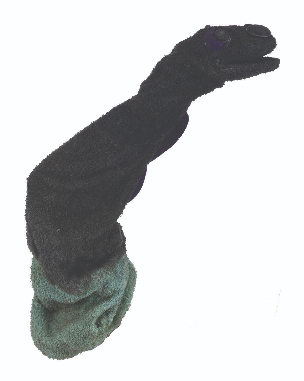(Clampett, 1949-1955) A screen-used “Time for Beany” puppet of Cecil after an explosion. Throughout the show's seven-year run, it was common for a puppet to be uniquely modified for specific scenes. This “charred” Cecil puppet, showing some original green fabric, was painted black to appear as if it survived an explosion and is covered in soot. Constructed of terry cloth, rubber, felt, plastic, foam, and cardboard and measuring 27” x 9.5” x 5” deep, the puppet displays is in good condition with a 1” seam split on the left side, soiling from production use, and discoloration from age.
