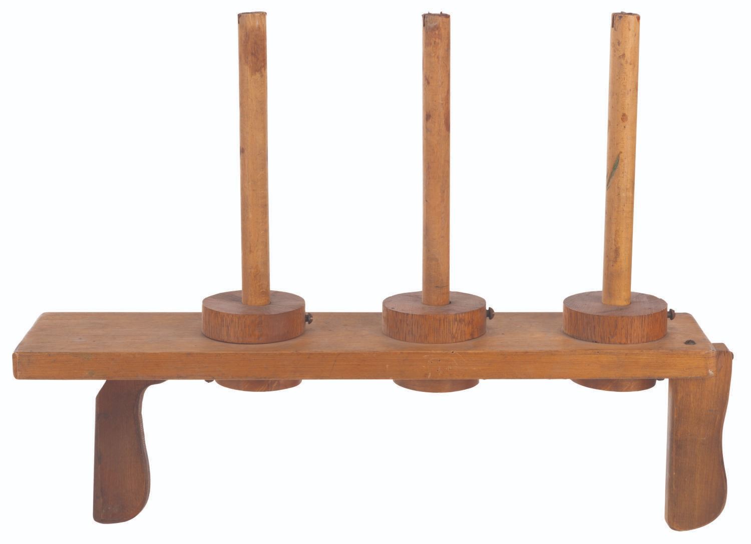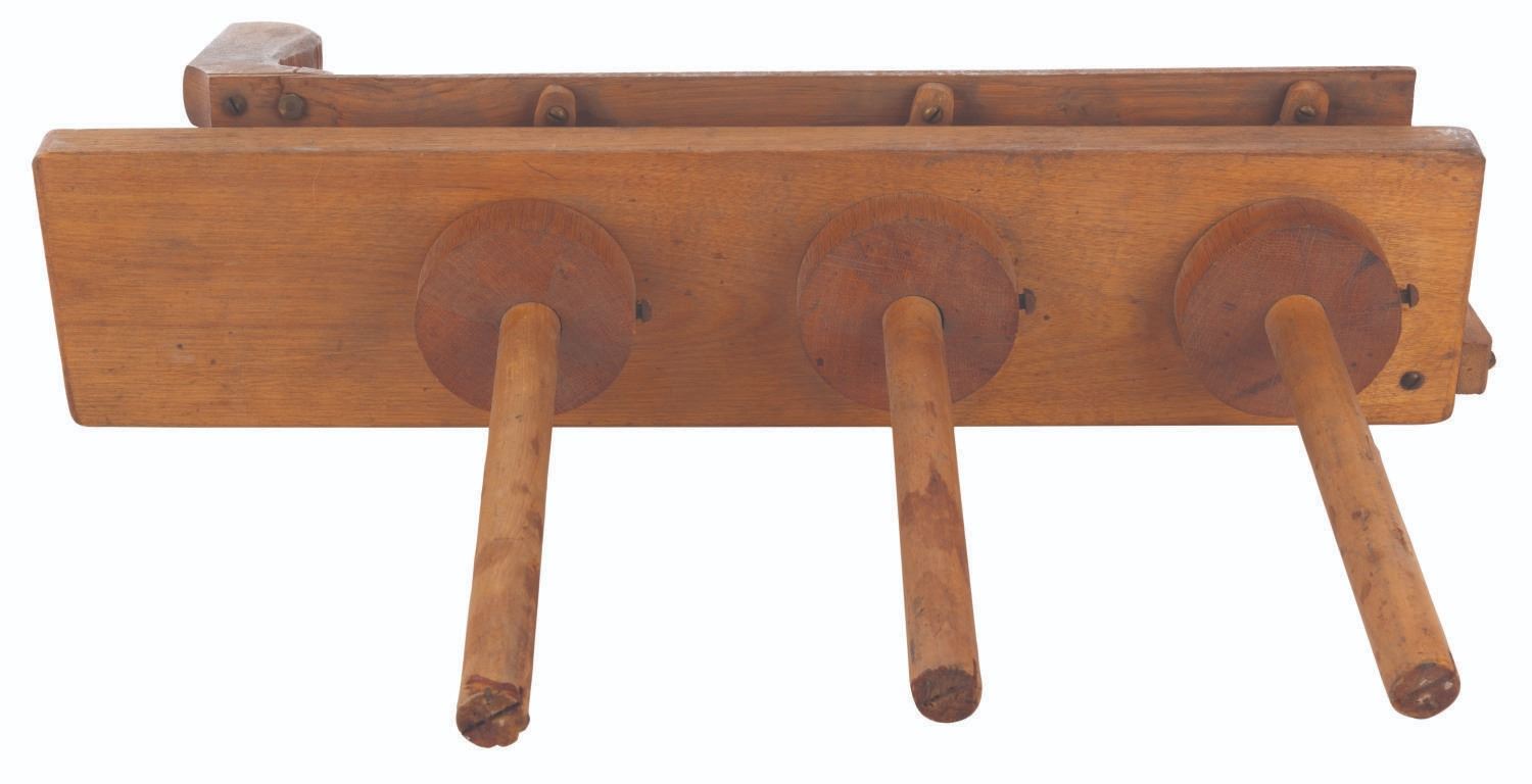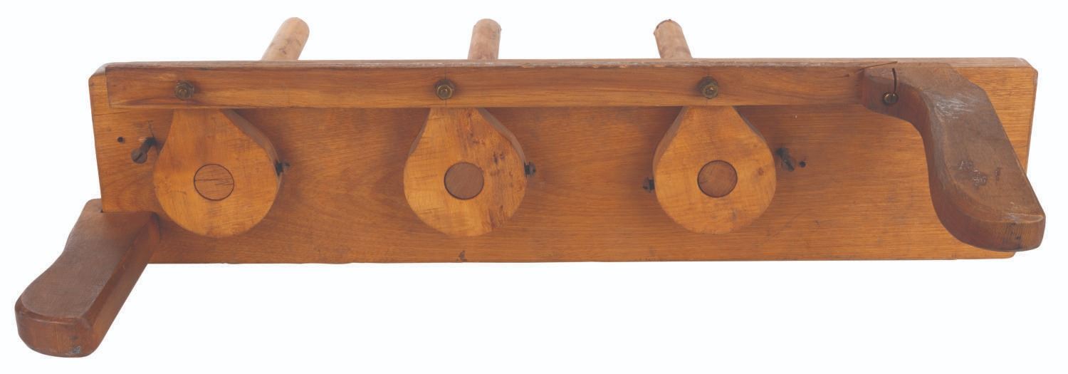 (Clampett, 1950s) A “Time for Beany” simultaneous head turn device. This tool was used to move multiple puppets’ heads at once during production of the groundbreaking children’s television series. The wooden tool’s handle and turn mechanisms worked when tested. Measuring 18.25” 4.25” x 14” tall, the device is in good condition with scuffs, scratches, residue, and wear from production use.