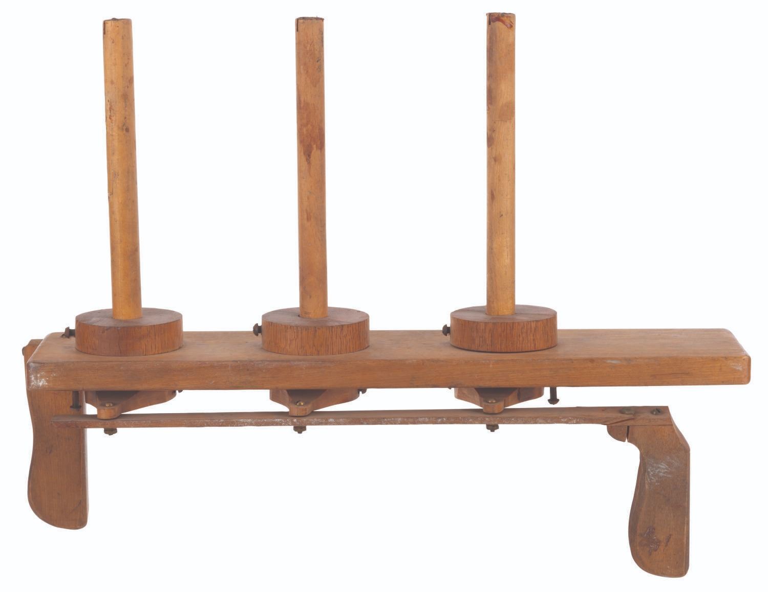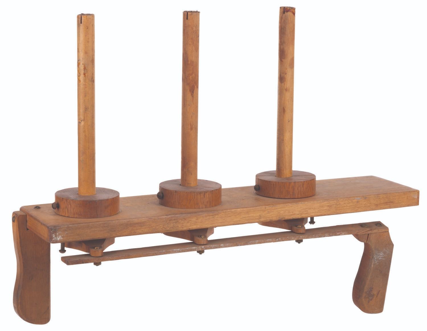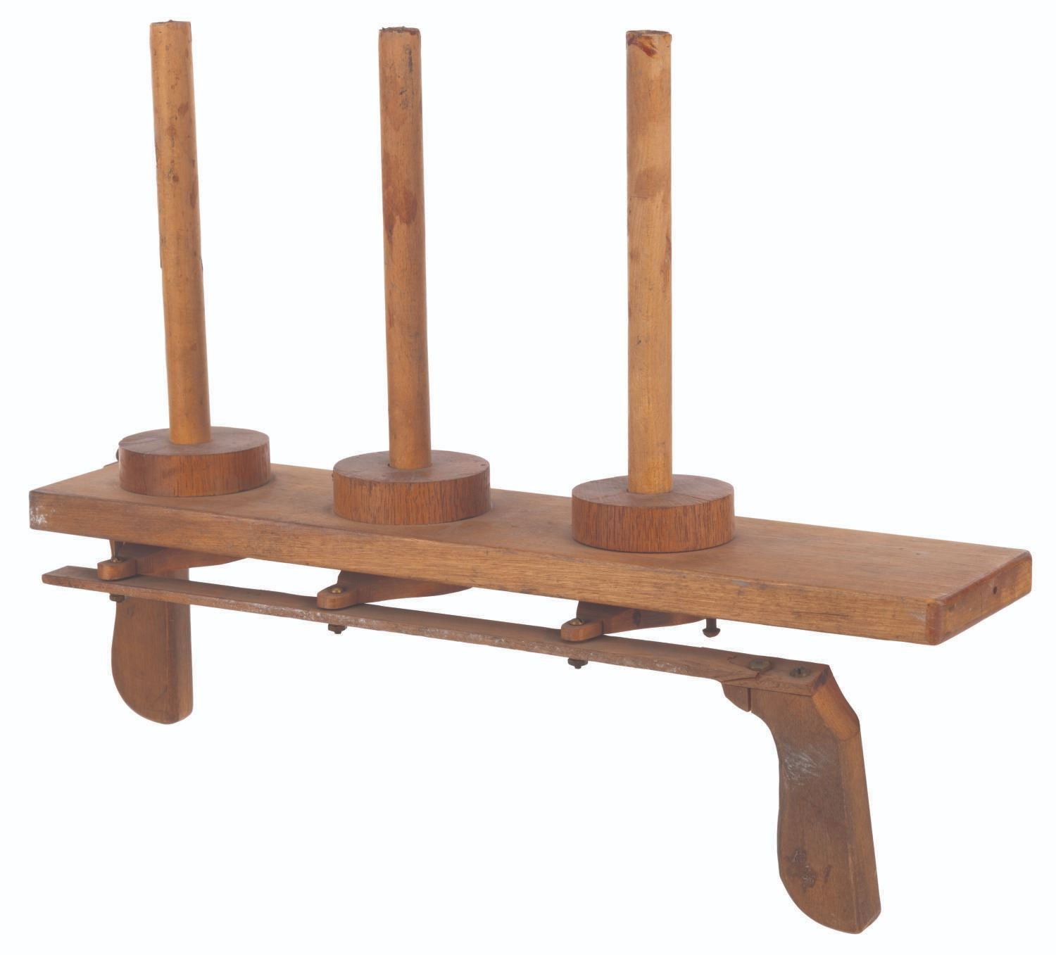 (Clampett, 1950s) A “Time for Beany” simultaneous head turn device. This tool was used to move multiple puppets’ heads at once during production of the groundbreaking children’s television series. The wooden tool’s handle and turn mechanisms worked when tested. Measuring 18.25” 4.25” x 14” tall, the device is in good condition with scuffs, scratches, residue, and wear from production use.