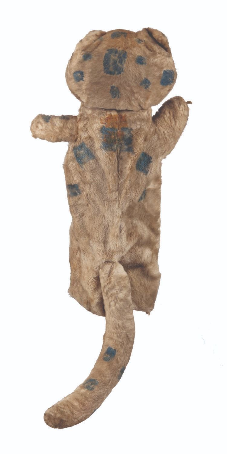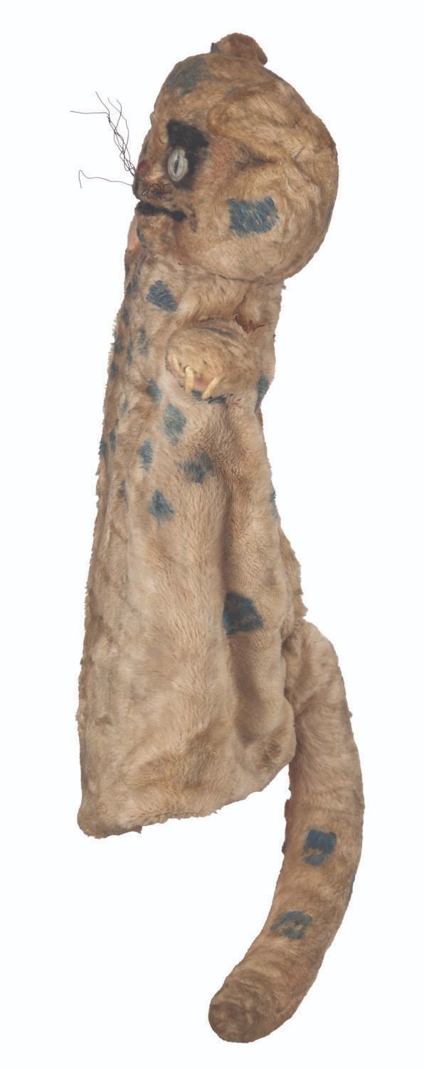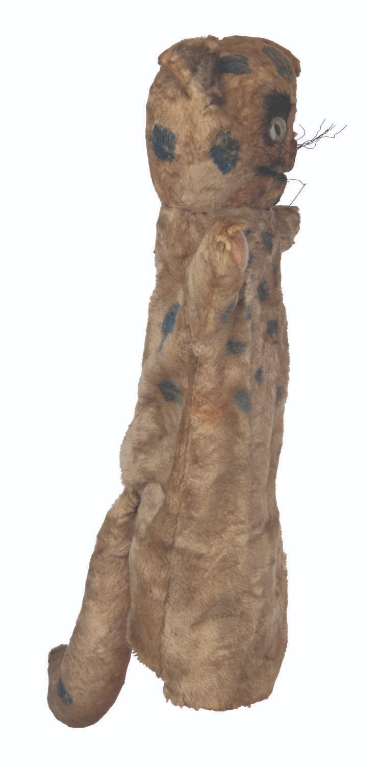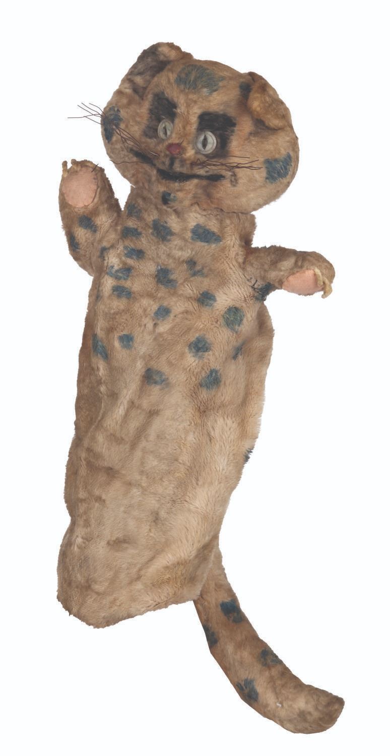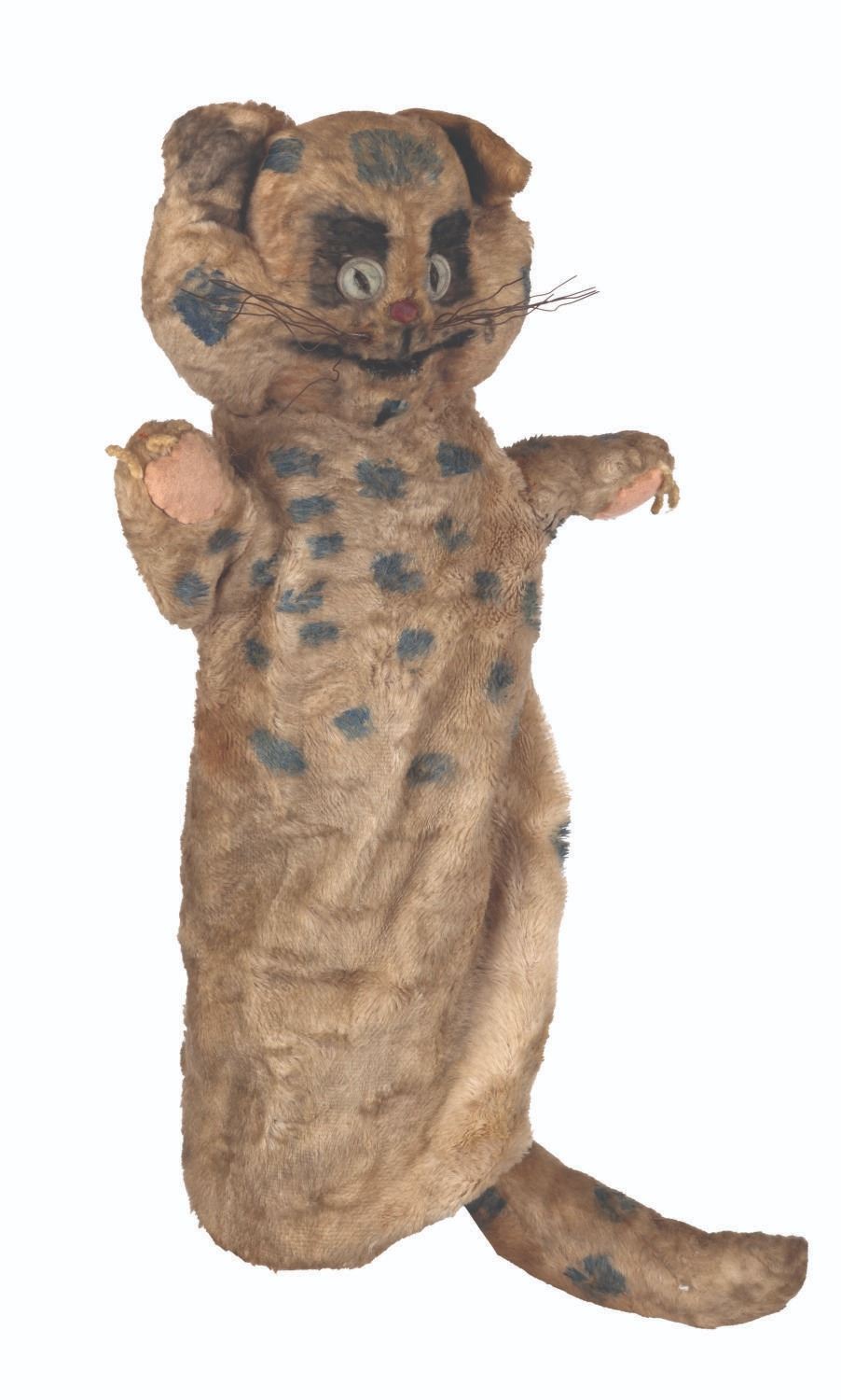 (Clampett, 1949-55) A production-used spotted cat puppet from Bob Clampett’s “Time for Beany.” Measuring 14” tall, the mixed-media puppet is in fair condition with soiling, paint loss, fraying, discoloration from age, stains, and wear from production use.