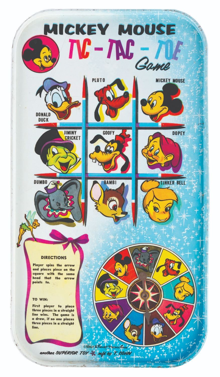 (T. Cohn, 1950s) A tin-litho Mickey Mouse Tic-Tac-Toe Game by T. Cohn Toy Company. Measuring 8" x 14.25" the game is in good condition with scrapes, scuffs, discoloration, oxidation, dents and spots of paint loss.