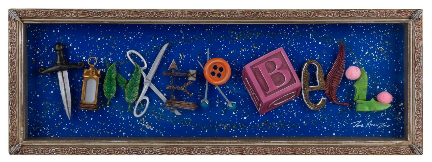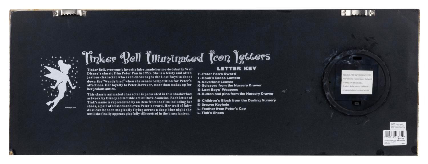 (Disney, 2012) A "Tinker Bell Illuminated Icon Letters" mixed media art piece. Disney Artist Dave Avanzino draws upon familiar visual elements to spell out “Tinker Bell”, framed in a sleek black shadowbox. Measuring 20.75"x7.5"x3.25", the shadowbox displays in very good condition with scratches on the top of the shadow box. The illumination feature on this piece does not work, with only the “I” lantern light glowing faintly with three “AA” batteries (not included).