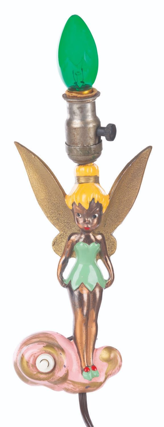 (Disney, 1950s) A hand-painted metal wall lamp of Tinker Bell from "Peter Pan." Measuring 4" x 10.25" tall with bulb, the lamp is in good working condition, with typical wear from age.