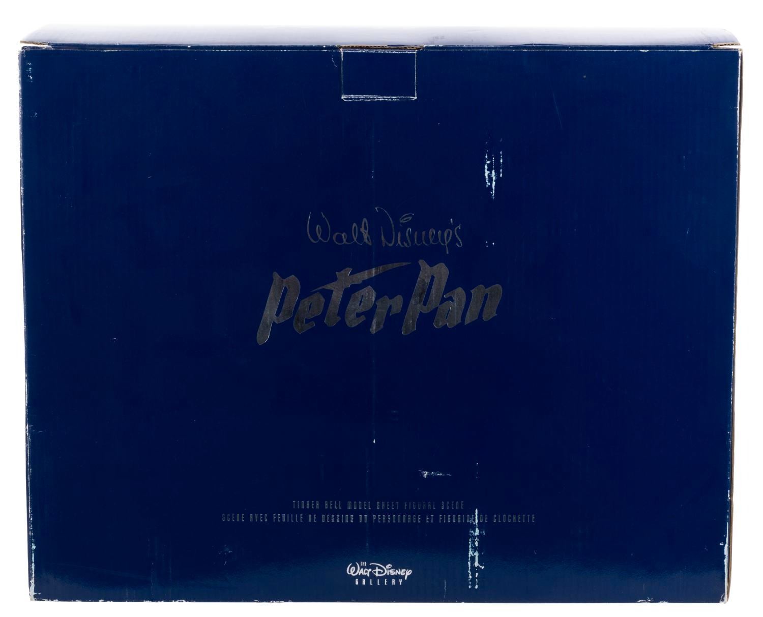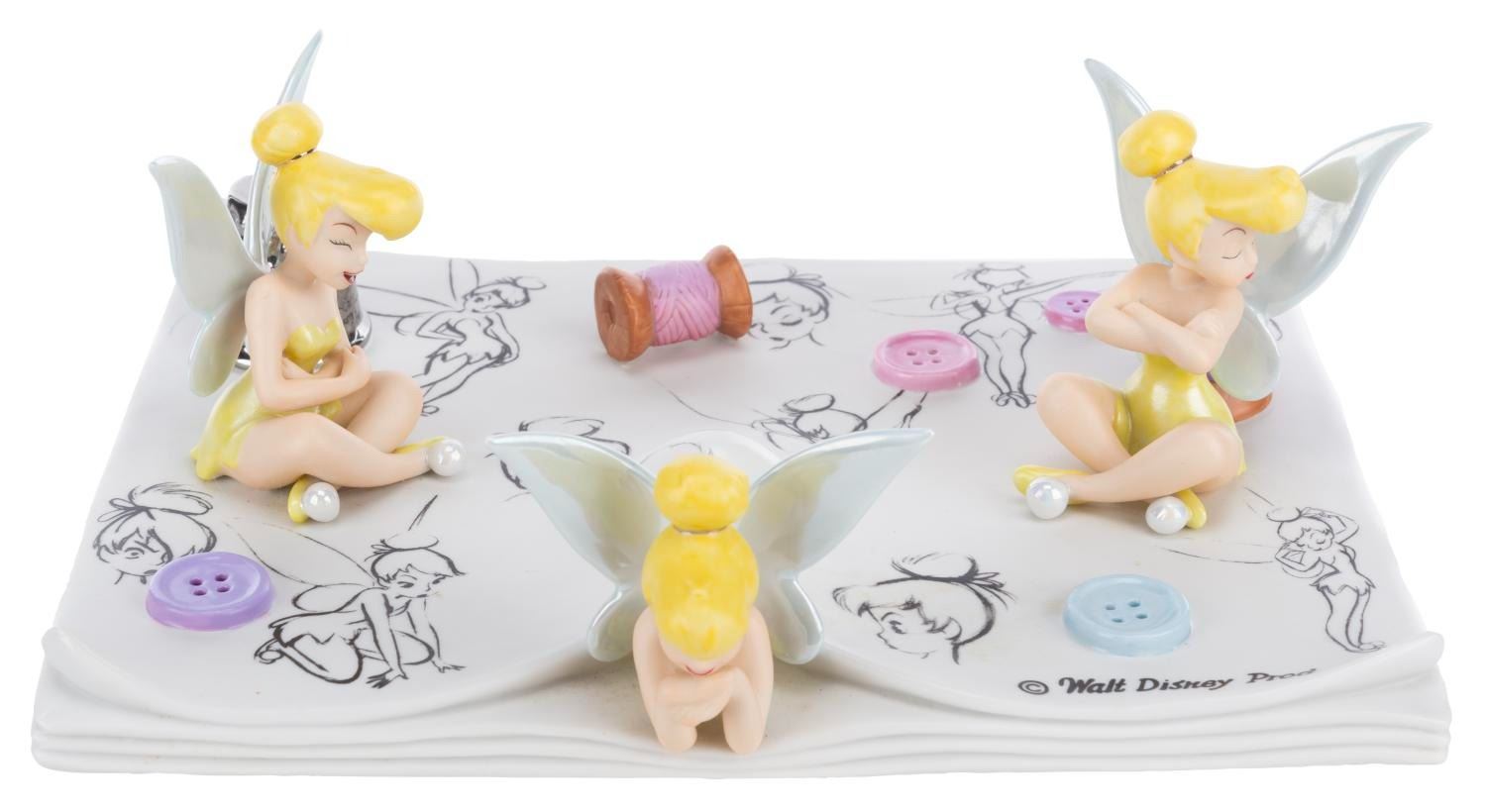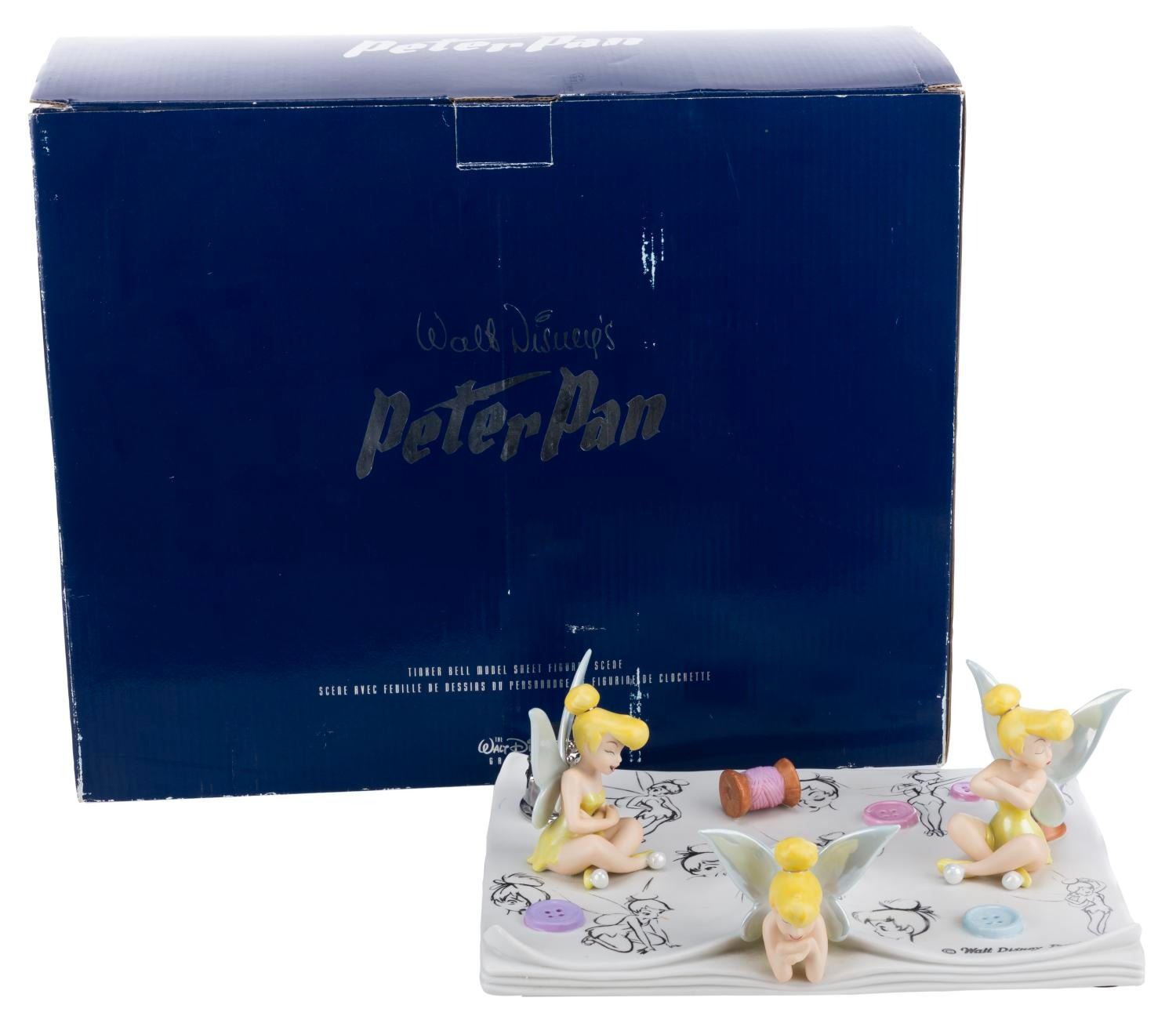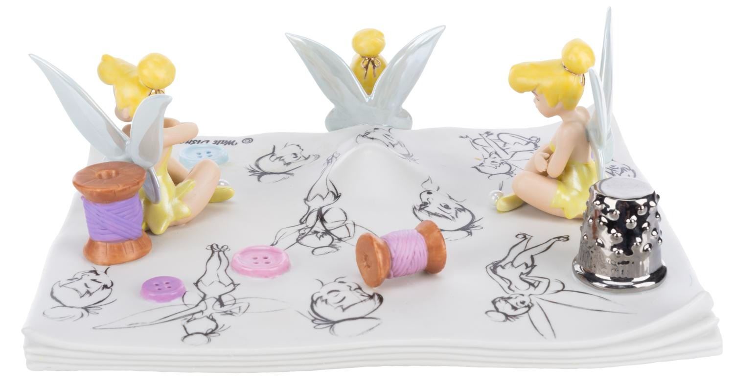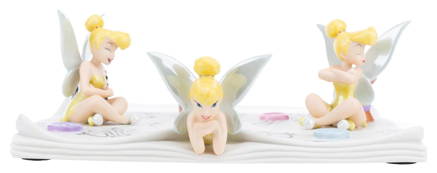 (Disney, 1990s) A ceramic figurine of Tinker Bell, depicting three poses of the pixie on a model sheet for her appearance in "Peter Pan." Measuring 7.5" x 9.75" x 3.75" tall, the figure is in very good condition with minimal soiling and staining from display.