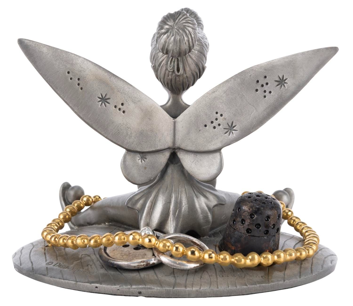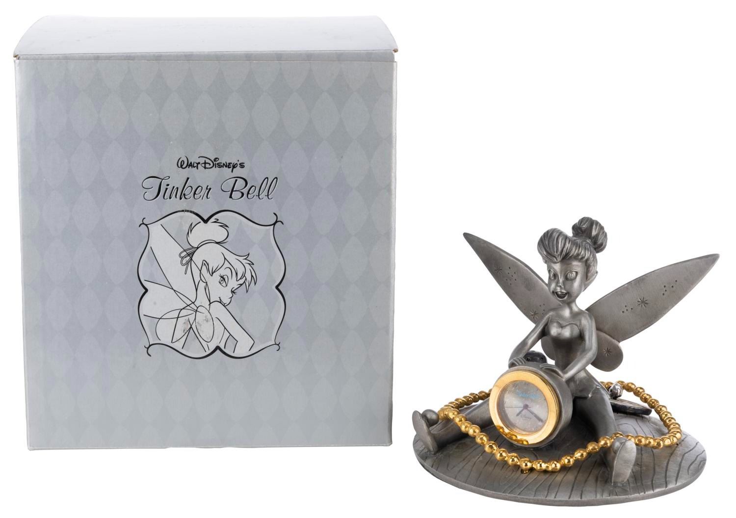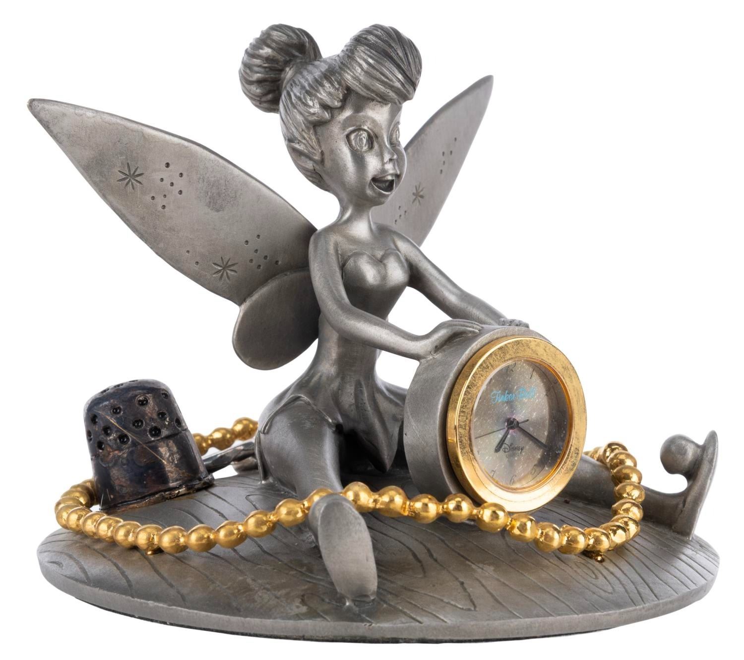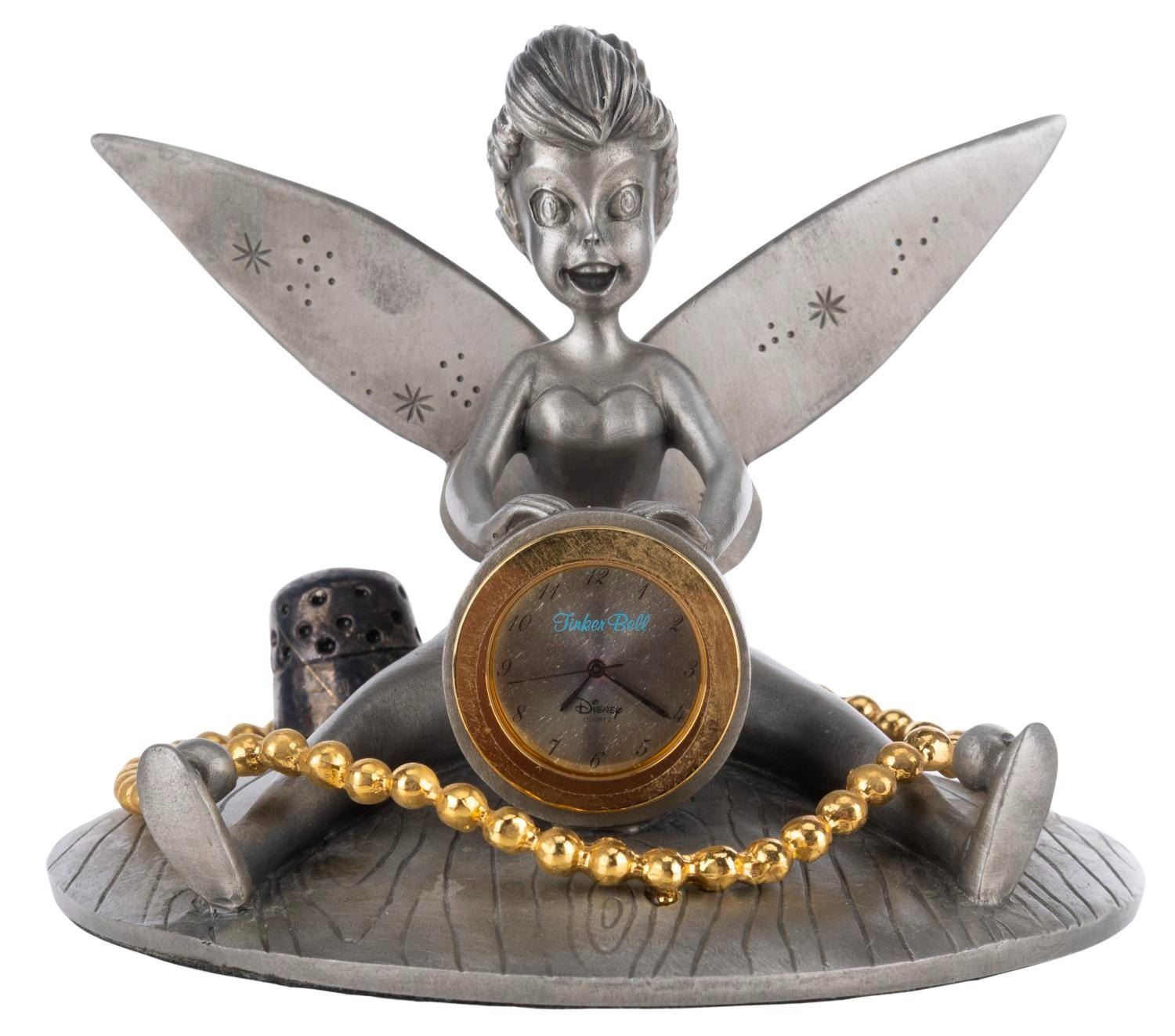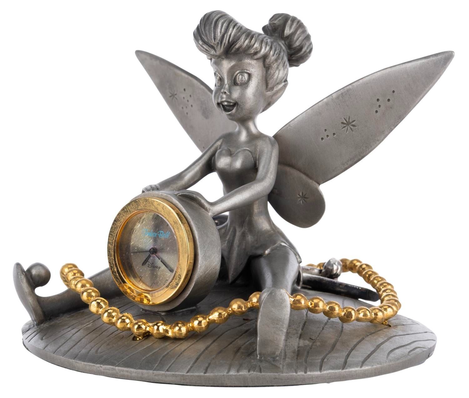 (Disney, 1996) A pewter Tinker Bell figurine with an inset clock. Numbered 0536/5000, the clock measures 4.75 " diameter x 4 " tall and is in fine condition, requiring a battery and possibly service to function.