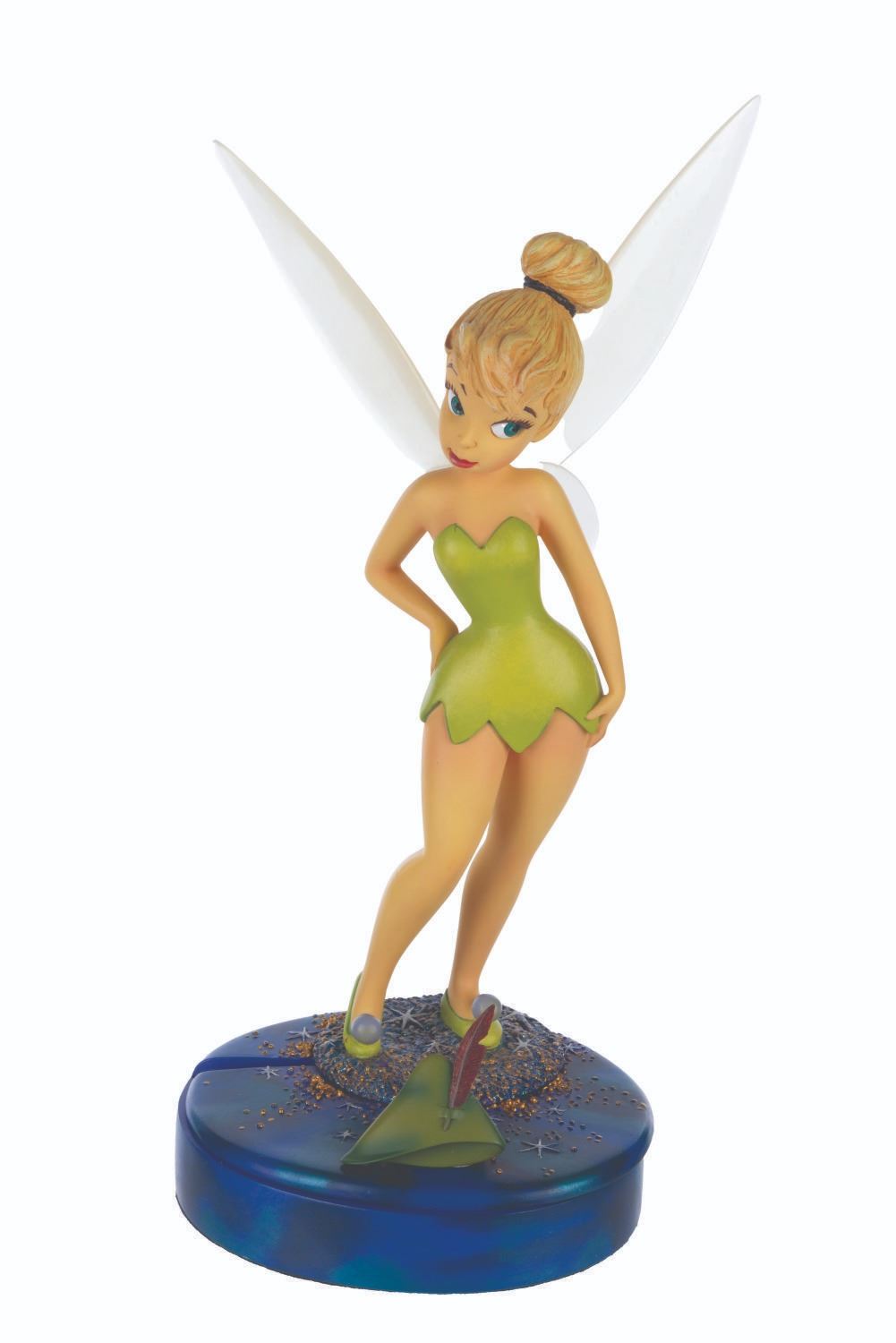 (Markrita, 2000) A trinket box topped with a figurine of Tinker Bell, originally available in the Walt Disney Gallery at the Disneyland Resort. The box opens to reveal a lapel pin in the shape of Peter Pan's feathered hat. Measuring 4.5" x 5" x 10.5" tall and 1.5" x 1.5" respectively, the figurine and pin are in fine condition.