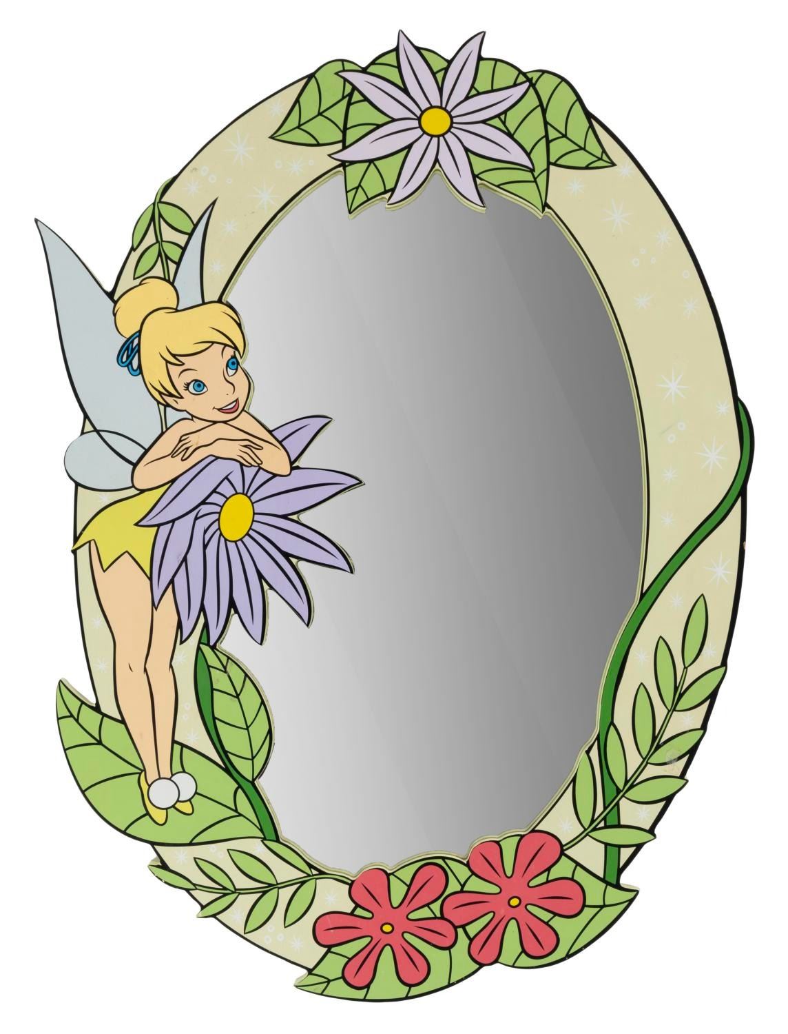 (Disney, 2000s) An oval wall mirror featuring Tinker Bell from “Peter Pan” surrounded by flowers. Measuring 24” x 31” the mirror is in good condition with light soiling, paint chips and adhesive residue.