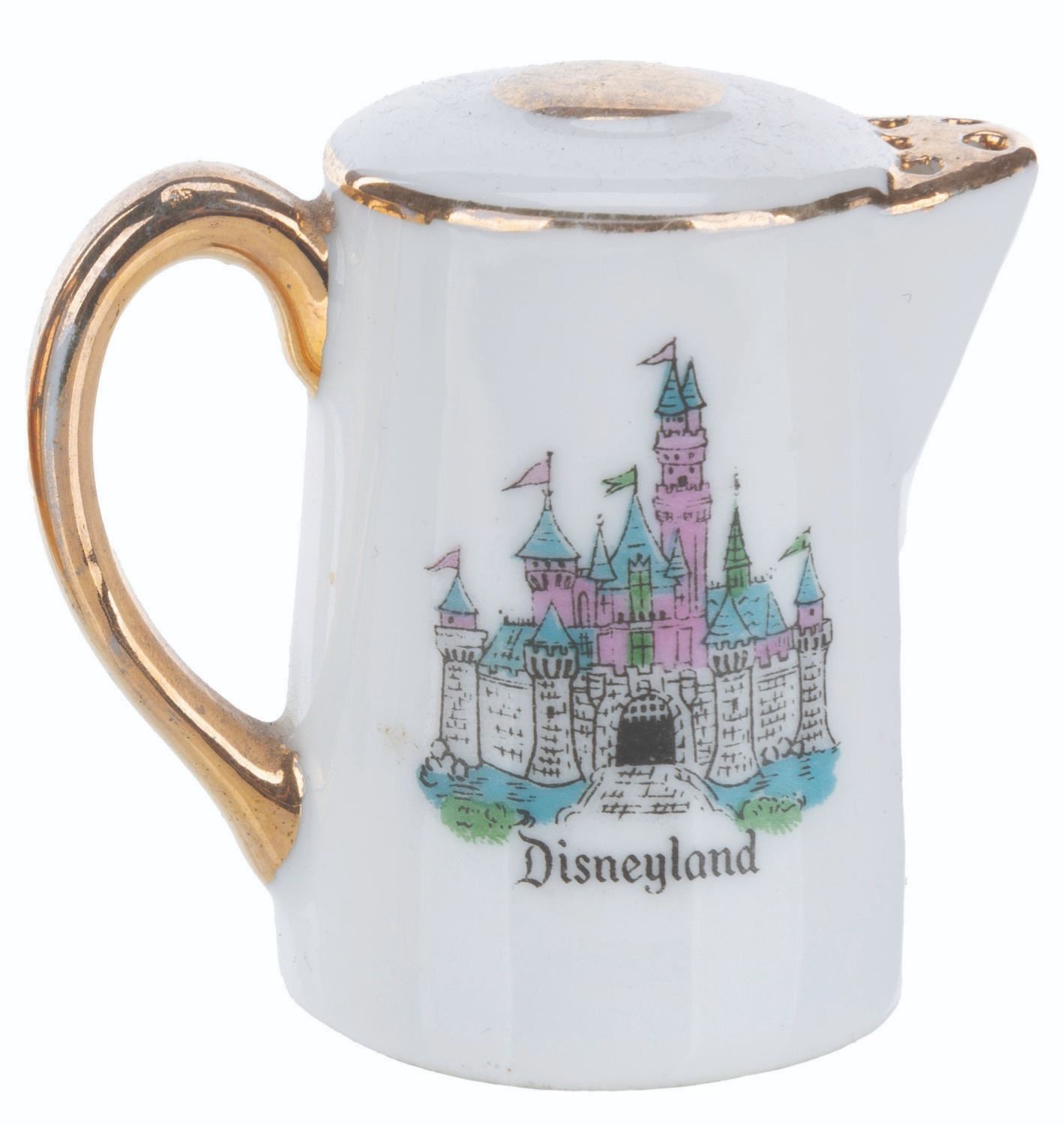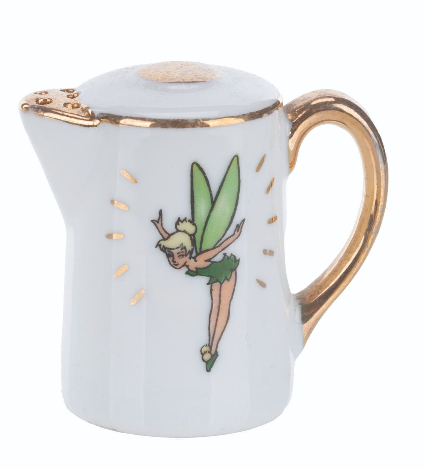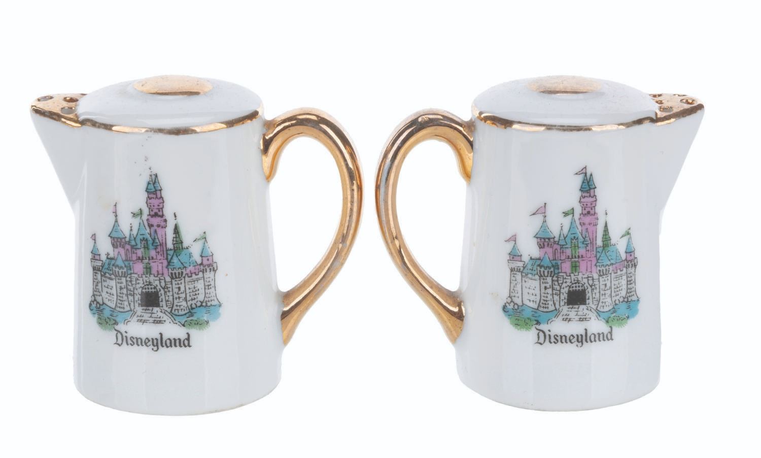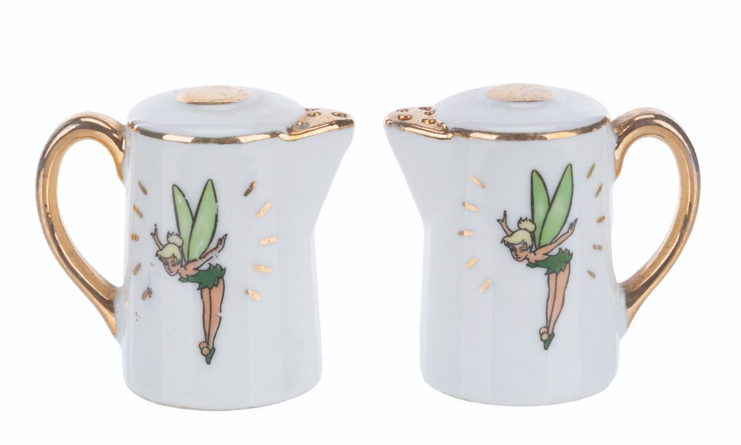 (Disneyland, 1970s-80s) A Tinker Bell and Sleeping Beauty Castle pitcher-shaped souvenir salt and pepper shaker set. Measuring 2" x 2.25", the set is in good condition with very minor scratches and overall wear from use and age.