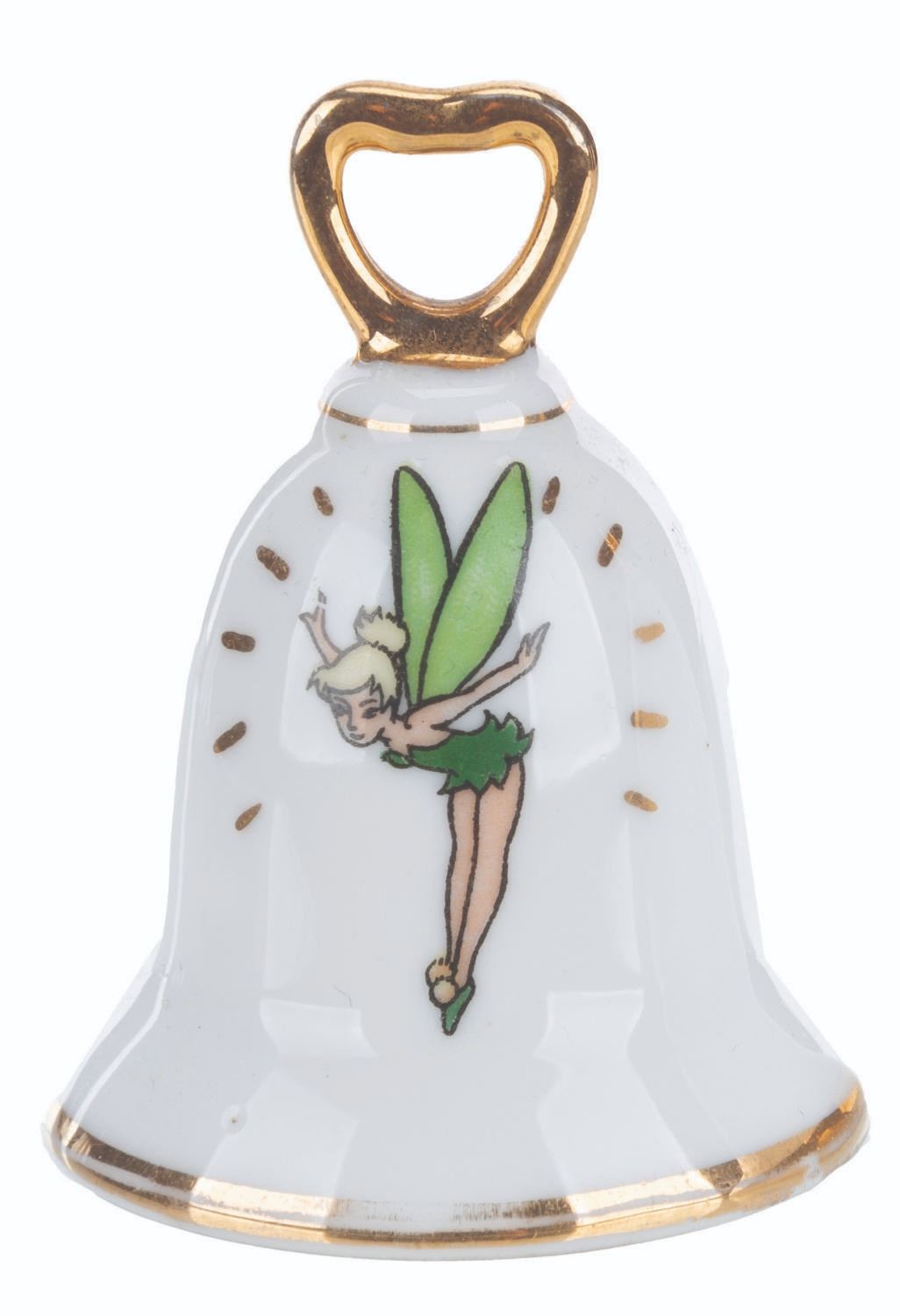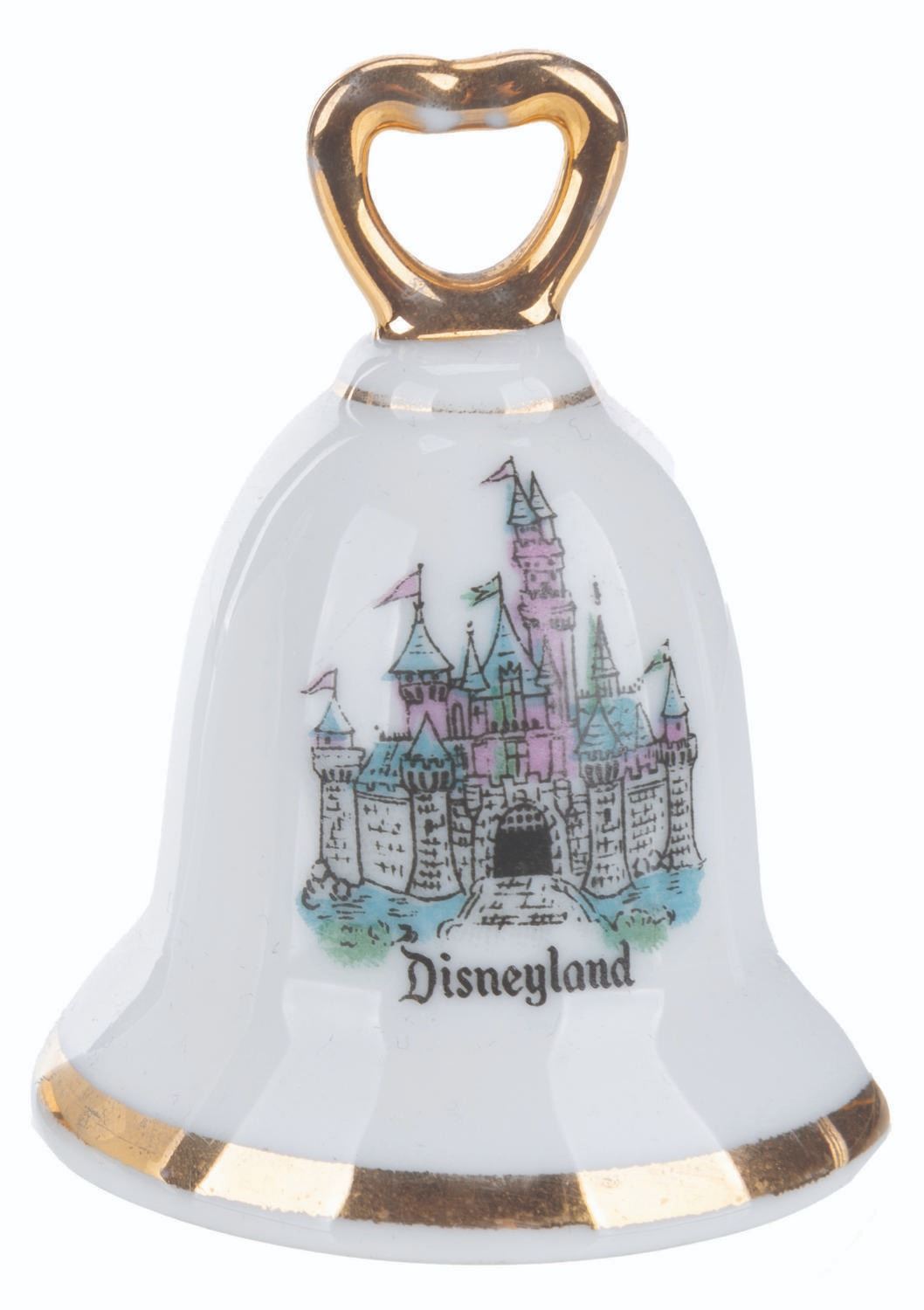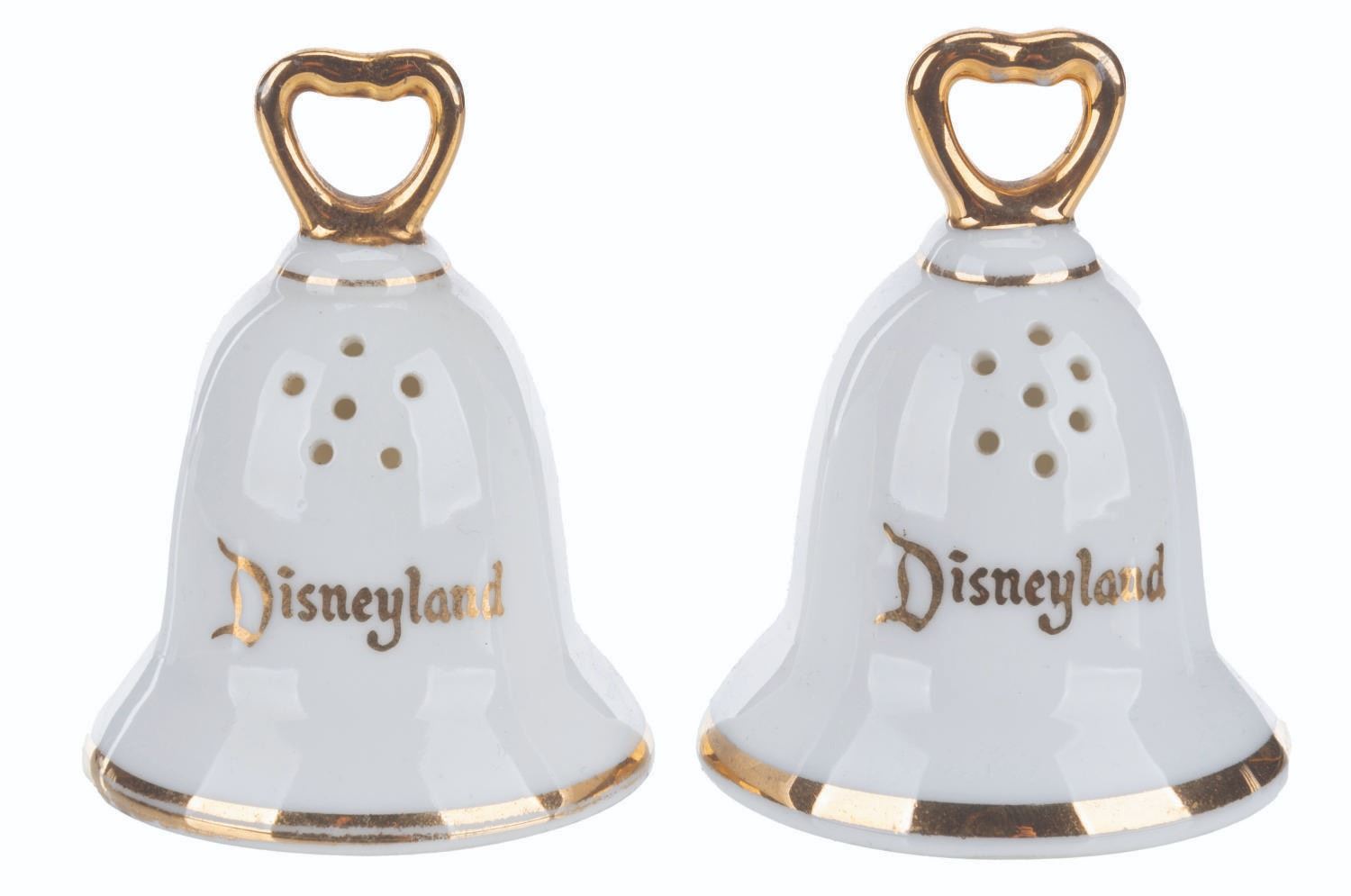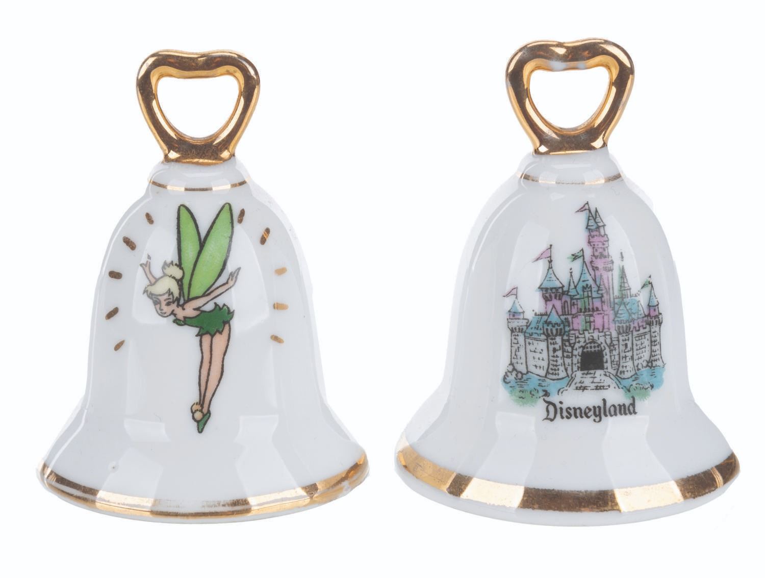 (Disneyland, 1970s-80s) A Tinker Bell and Sleeping Beauty Castle bell-shaped souvenir salt and pepper shaker set from Disneyland. Measuring 1.75" x 2.5" each, the set is in good condition with light wear from age and handling.