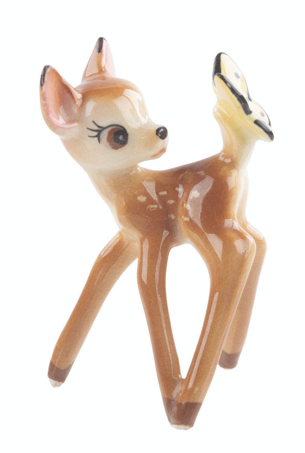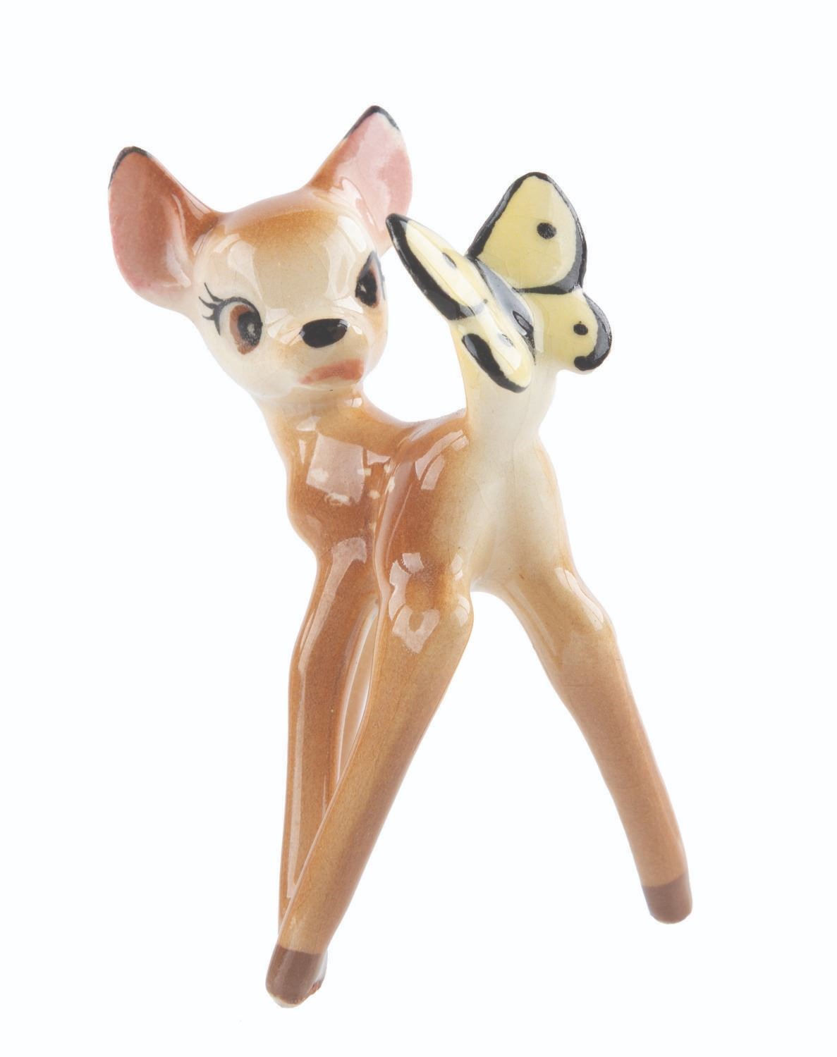 (Shaw, 1940s-50s) A ceramic figurine of “Bambi” looking at a butterfly on his tail. Through the 1940s and 1950s, the Evan K. Shaw Pottery company and its sister companies, Metlox and American Pottery, produced a wide range of ceramics. These companies are no longer in business, and their highly desirable figurines are increasingly rare. Measuring 2” x 1.5” x 2.75” tall, Bambi is in very good condition with slight crazing, and a loose but included “Walt Disney Productions” label that left yellow residue on the figure’s right side.