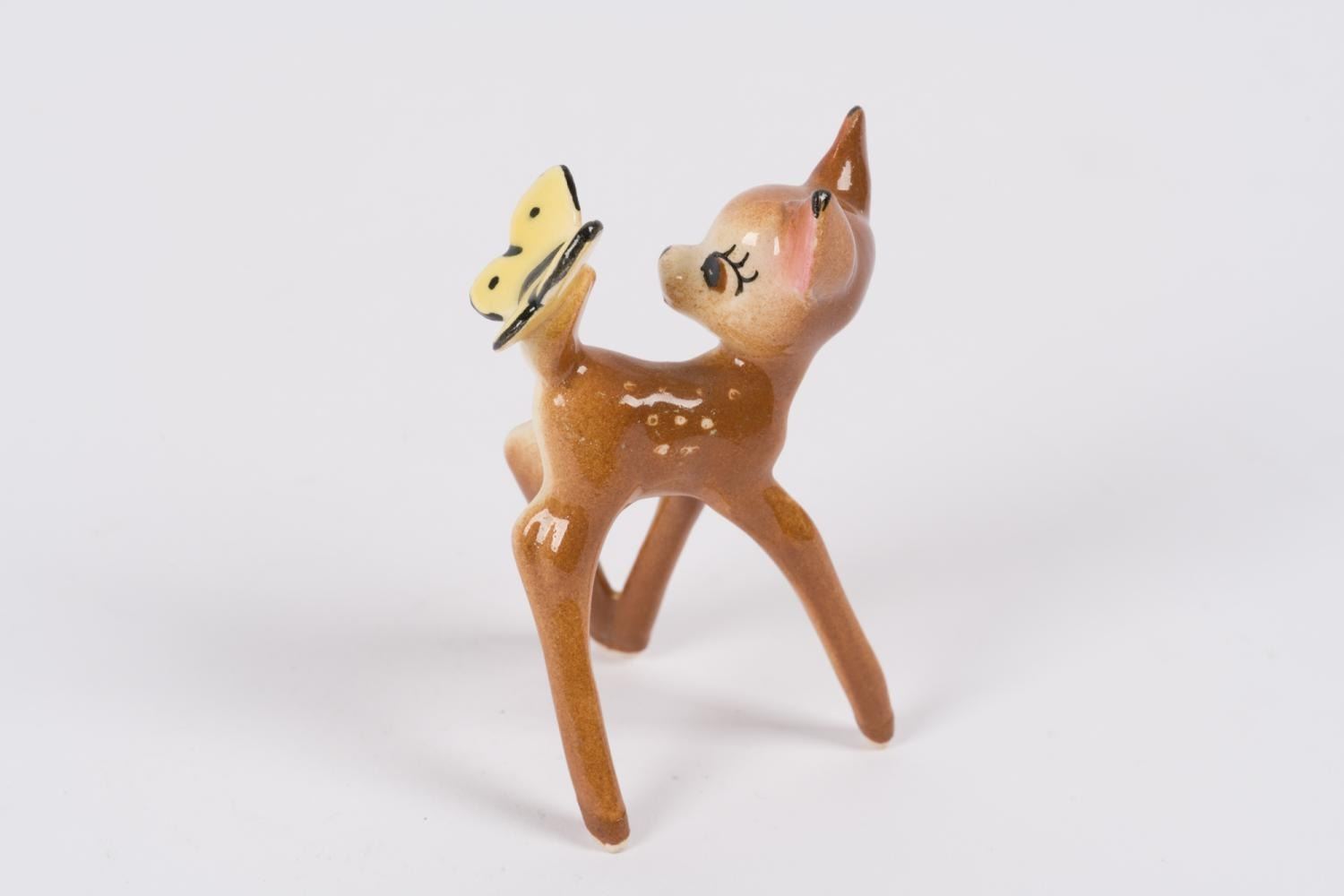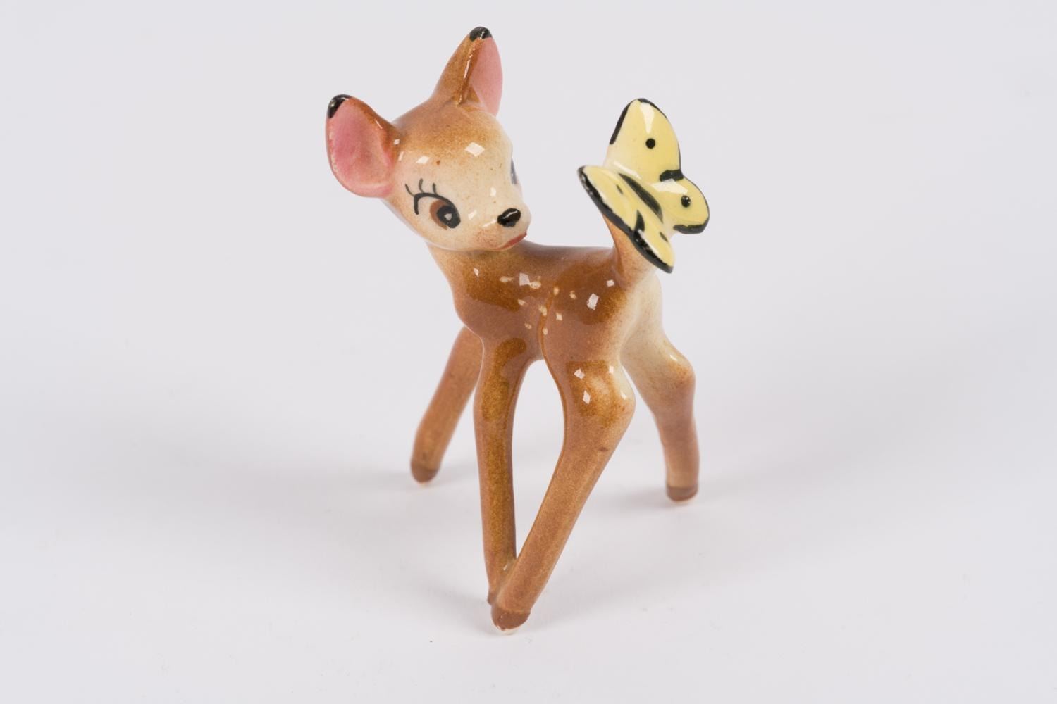 (Shaw, 1940s-50s) A ceramic figurine of "Bambi" looking at a butterfly on his tail. Through the 1940s and 1950s, the Evan K. Shaw Pottery company and its sister companies, Metlox and American Pottery, produced a wide range of ceramics. These companies are no longer in business, and their highly desirable figurines are increasingly rare. Measuring 2" x 1.5" x 2.75" tall, Bambi is in very good condition with slight crazing.