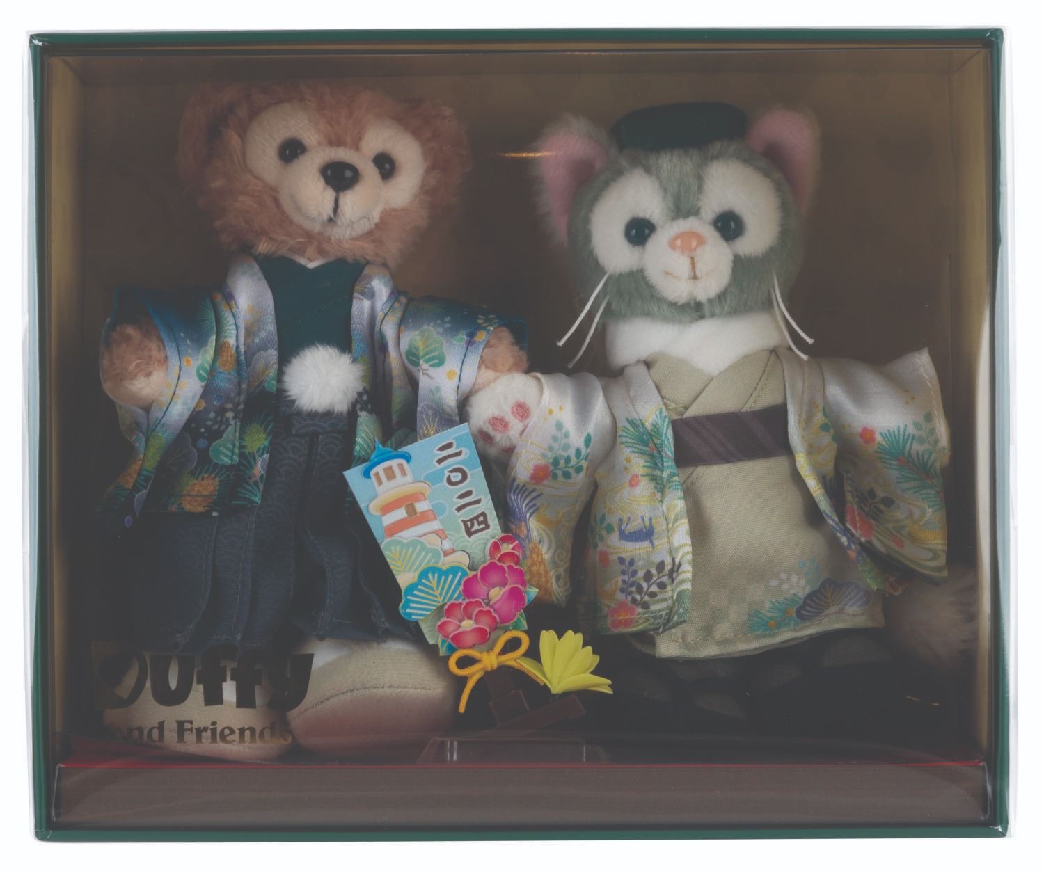 (Tokyo DisneySea, 2024) An unopened set of Duffy and Gelatoni plush dolls in traditional Japanese attire, originally sold at Tokyo DisneySea. Measuring 6.75" x 3.75" x 8.25" tall, the set is in fine condition.