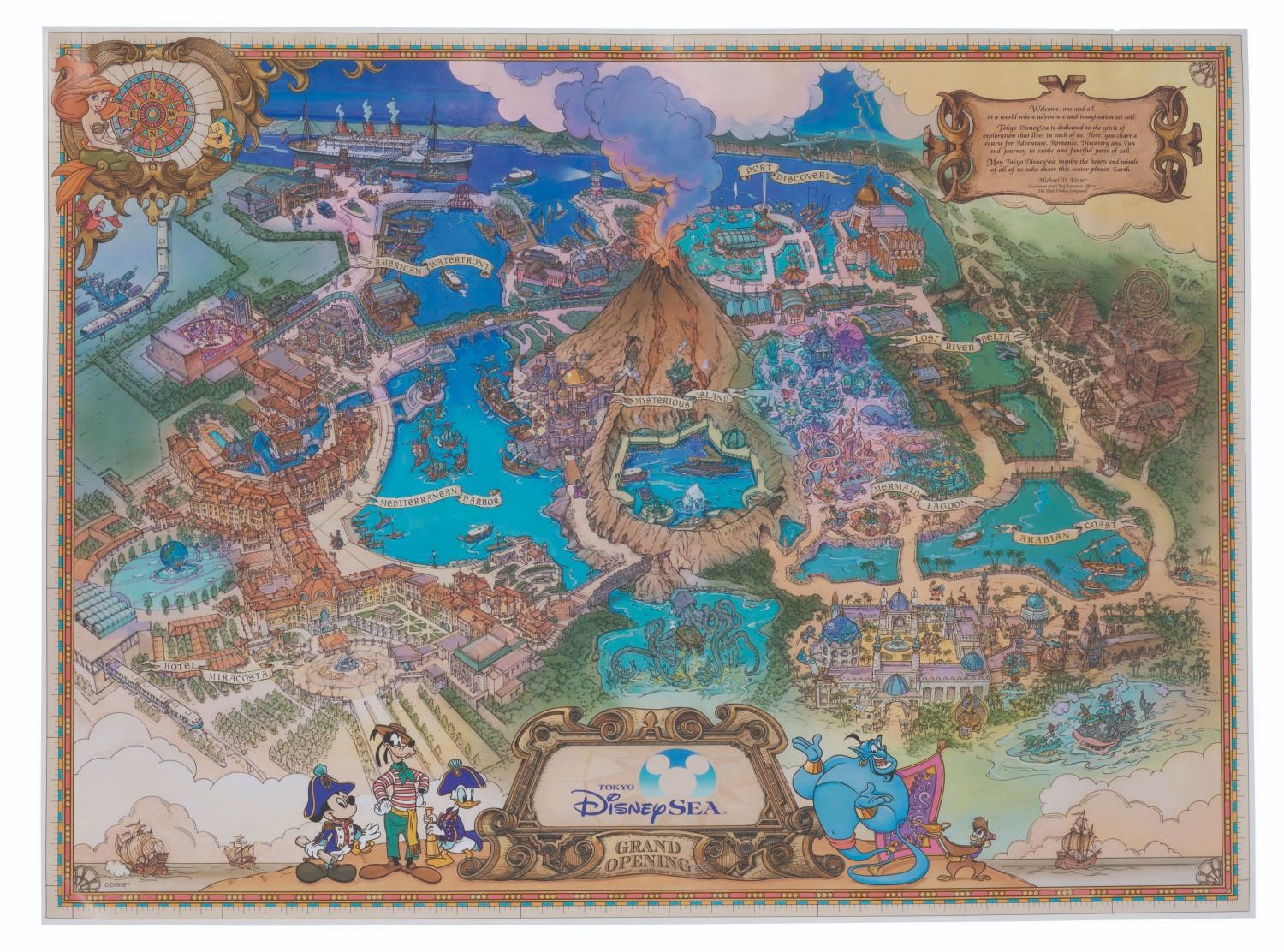 (Tokyo DisneySea, 2001) A Tokyo DisneySea grand opening map. Disney characters in the borders surround whimsical illustrations of the Park’s attractions, and a special grand opening banner is featured at the bottom. Measuring 20" x 27", rolled and never folded, the poster is in very good condition with light water damage at the top right, edge wear, creases, and waviness.
