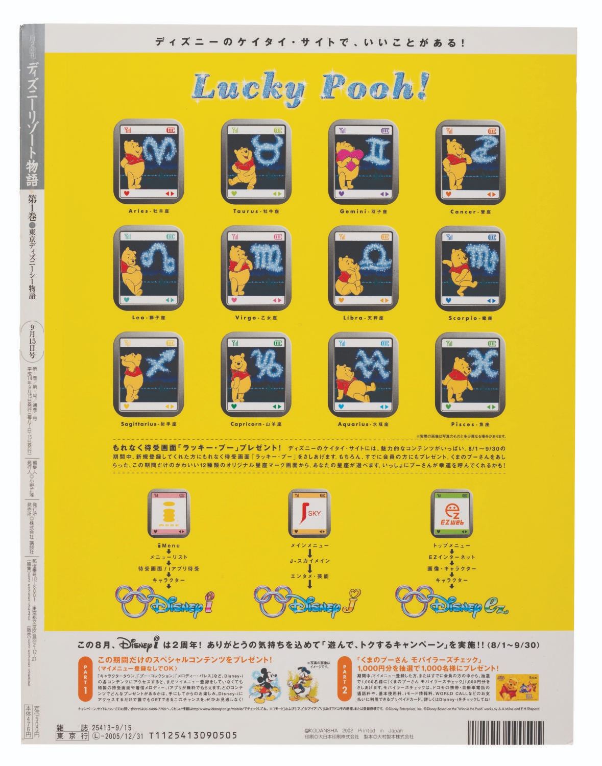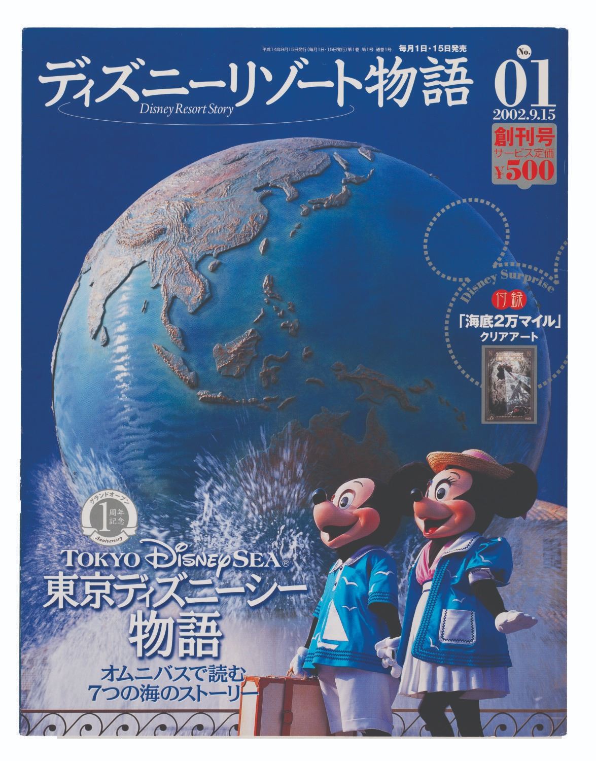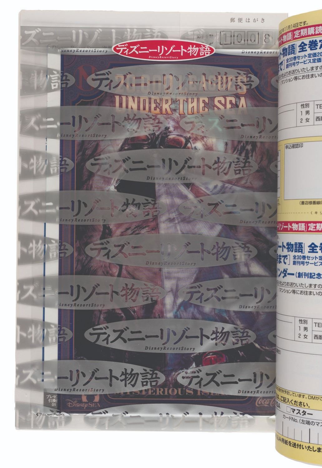 (Tokyo DisneySea, 2002) A Tokyo DisneySea magazine with a print promoting the Park’s “20,000 Leagues Under The Sea” attraction. The print is described by the magazine as “clear art,” which is a color image printed on very thin clear plastic with some areas left transparent. Measuring 11.75” x 9”, the magazine is in very good condition with light wear from handling. The “Clear Art” print is in fine condition sealed and unopened in its original bag attached to the back page.