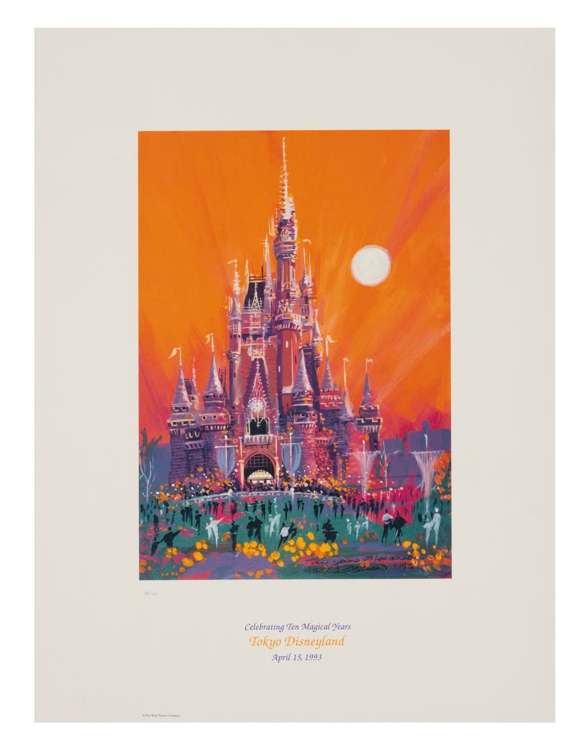 (Tokyo Disneyland, 1993) A limited edition lithograph commemorating the 10 year anniversary of Tokyo Disneyland. Hand-numbered 30 out of 1000, the print measures 18" x 24" and is in very good condition with two light creases and a scuff in the border.