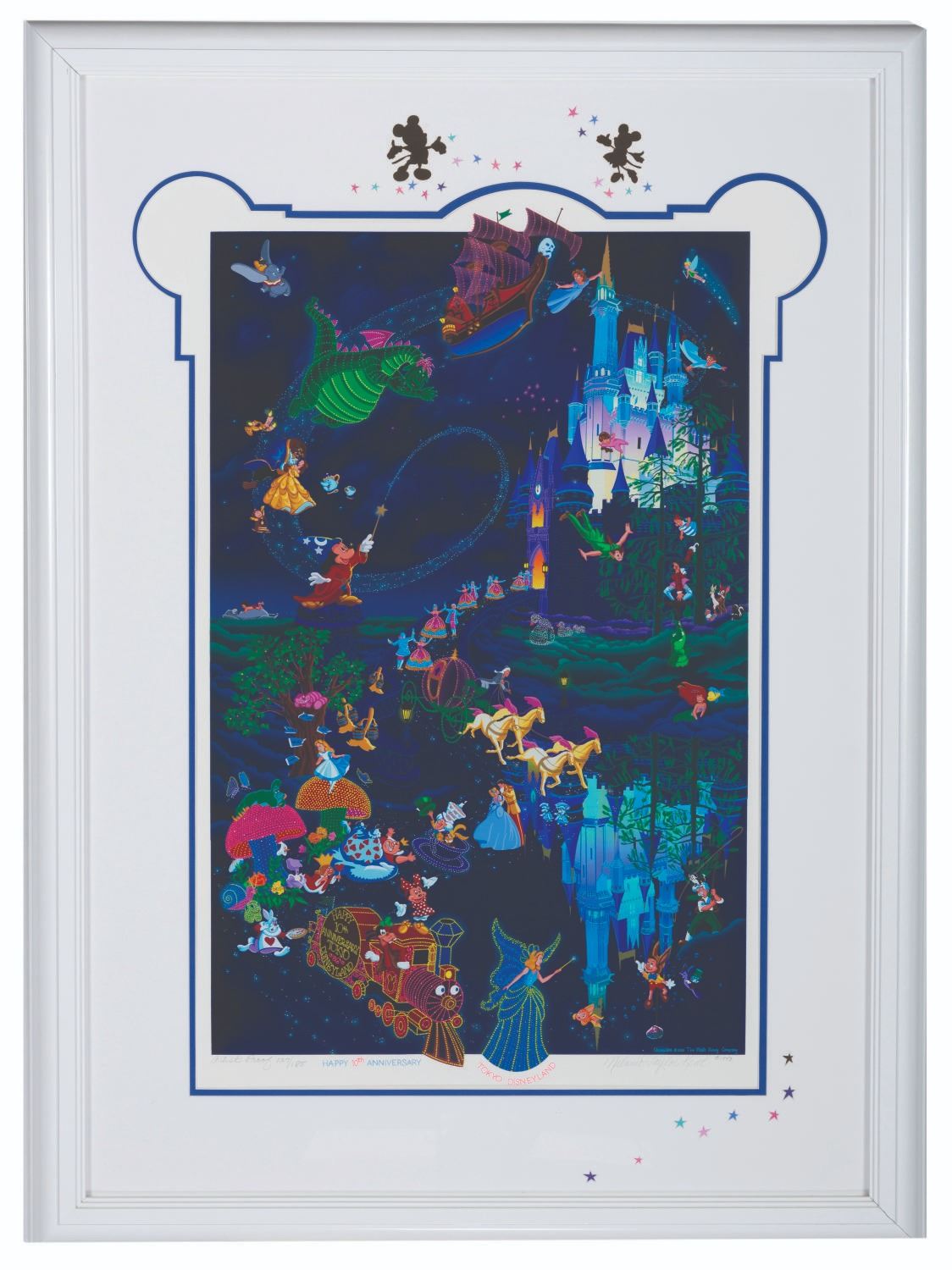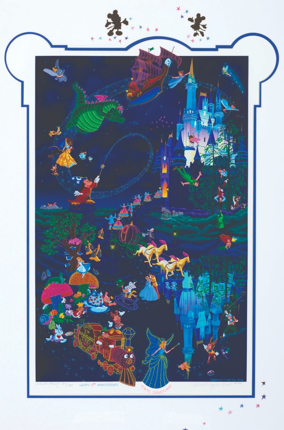 (Tokyo Disneyland, 1993) A limited edition silk-screened print celebrating Tokyo Disneyland's 10th anniversary with brilliant imagery of Cinderella Castle and the characters at night. "Tokyo Disneyland 10th Anniversary" by artist Melanie Taylor Kent was released in a hand-signed Artist's Proof edition of 185. This print numbered 127/185 with an image area of 20.5" x 33" is in fine condition, in a 35" x 48" frame with a custom mat featuring Mickey, Minnie, and stars.