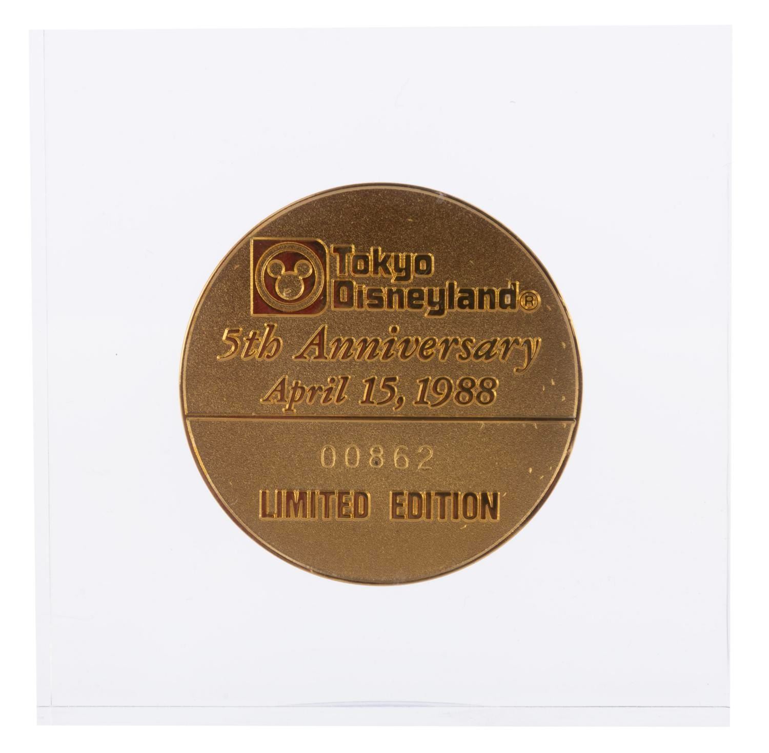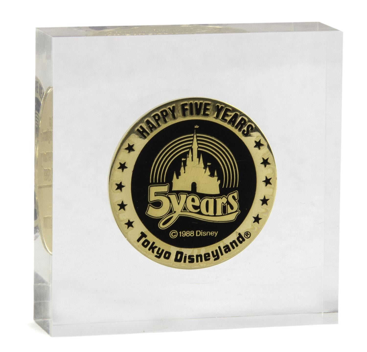 (Tokyo Disneyland, 1988) A commemorative coin released for the 5th anniversary of Tokyo Disneyland in 1988.The coin is displayed in lucite and features Cinderella Castle, numbered 00862 on the reverse. Measuring 3.25” x 3.25” and 1” thick, the piece is in very good condition with light wear and scratches.