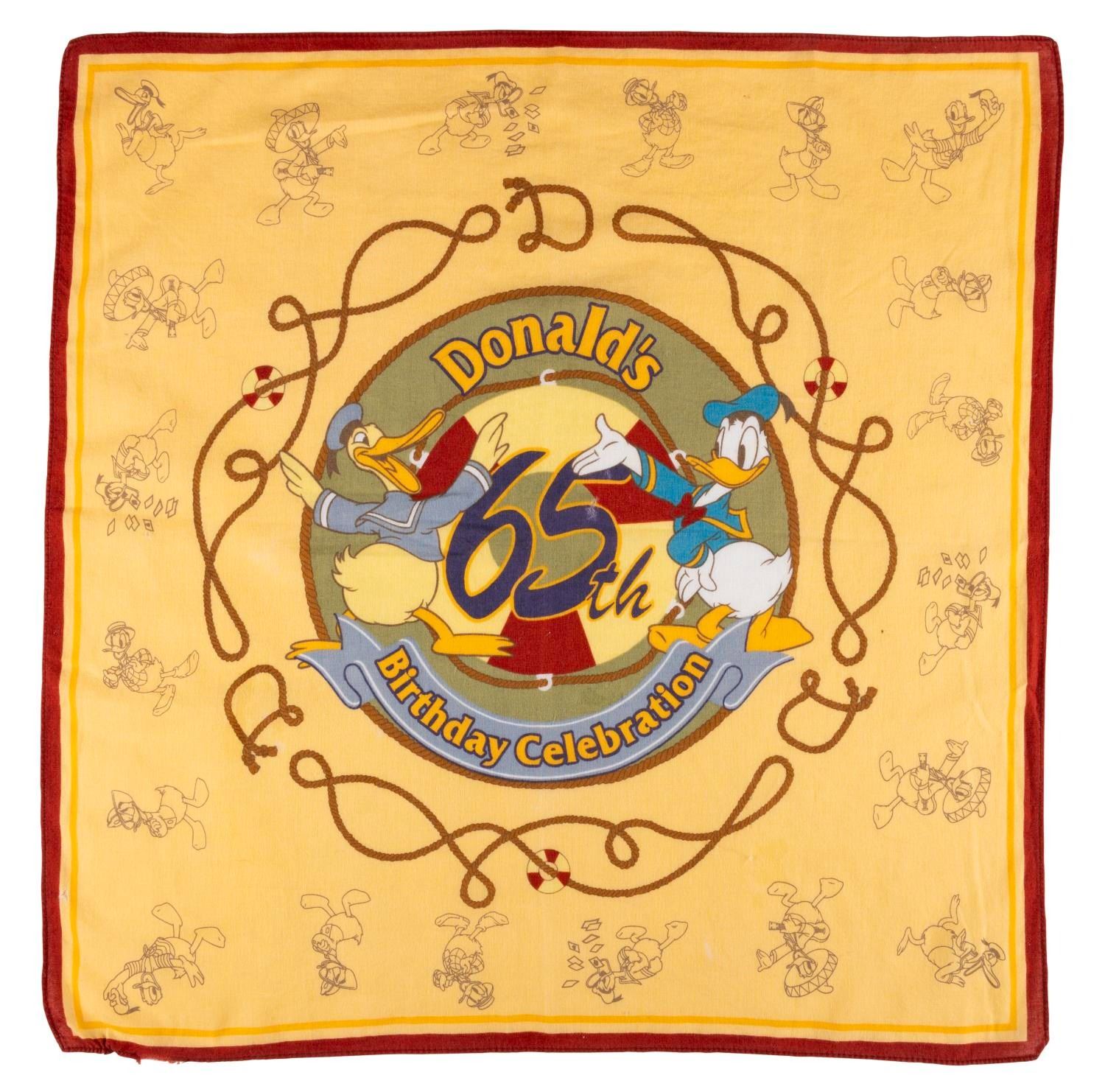 (Tokyo Disneyland, 1999) A souvenir bandana celebrating Donald Duck's 65th anniversary, featuring the hot-headed character before his re-design in 1936. Measuring 19.75" x 20", the bandana is in good condition with a few small holes, light spotting, and some fraying near the bottom left corner.