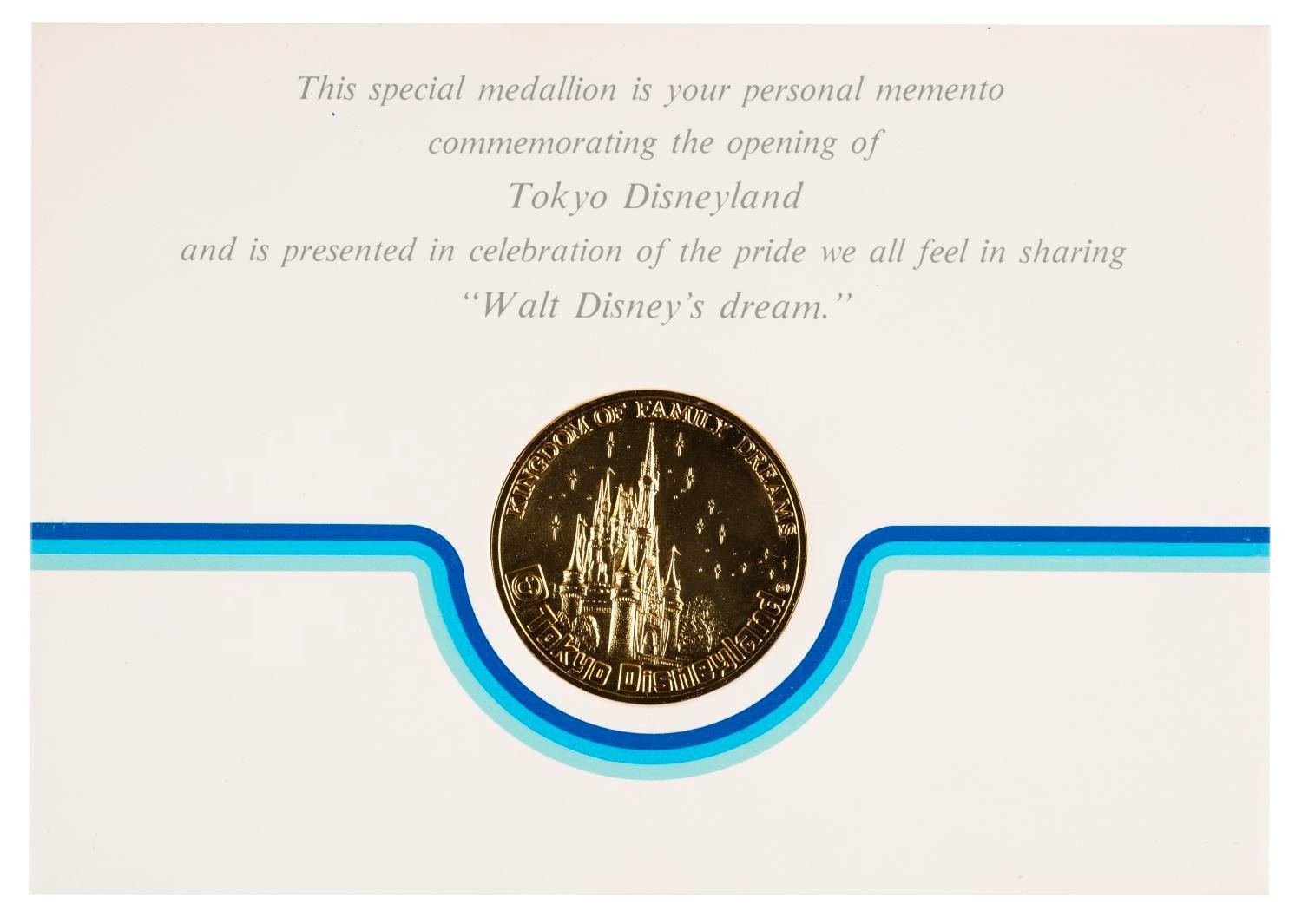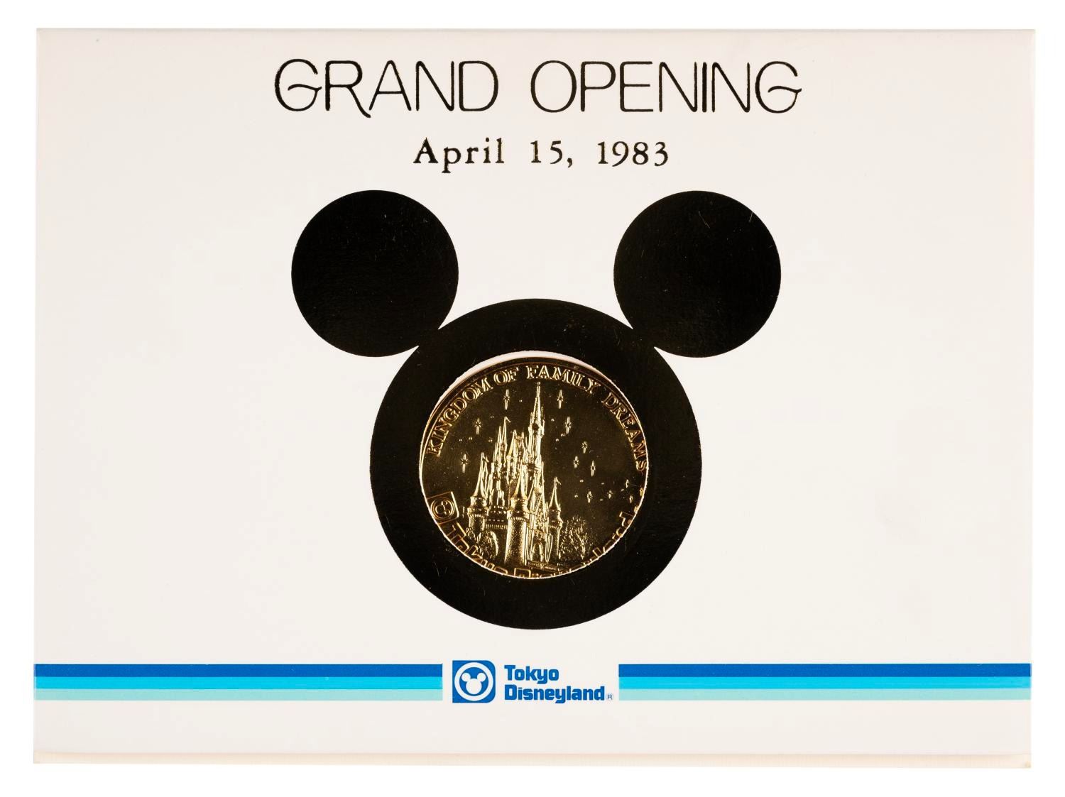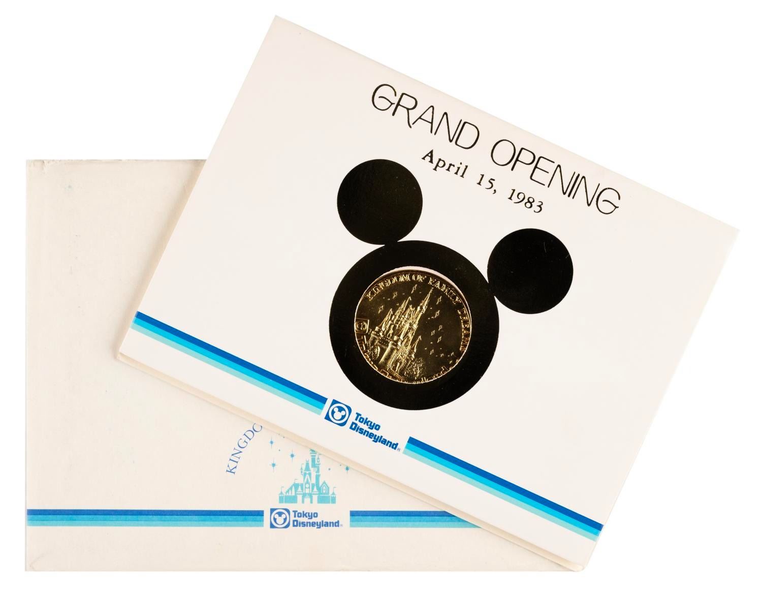 (Tokyo Disneyland, 1983) A medallion coin gifted to Cast Members, commemorating the Grand Opening Day of Tokyo Disneyland on April 15, 1983. Included is the original envelope, which was opened at the top. Measuring 1.5” in diameter in a 5” x 6.75” display, the coin is in fine condition, while the display exhibits surface scratches.