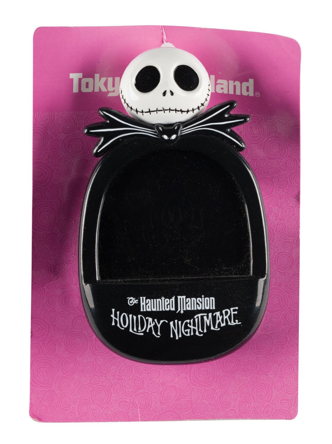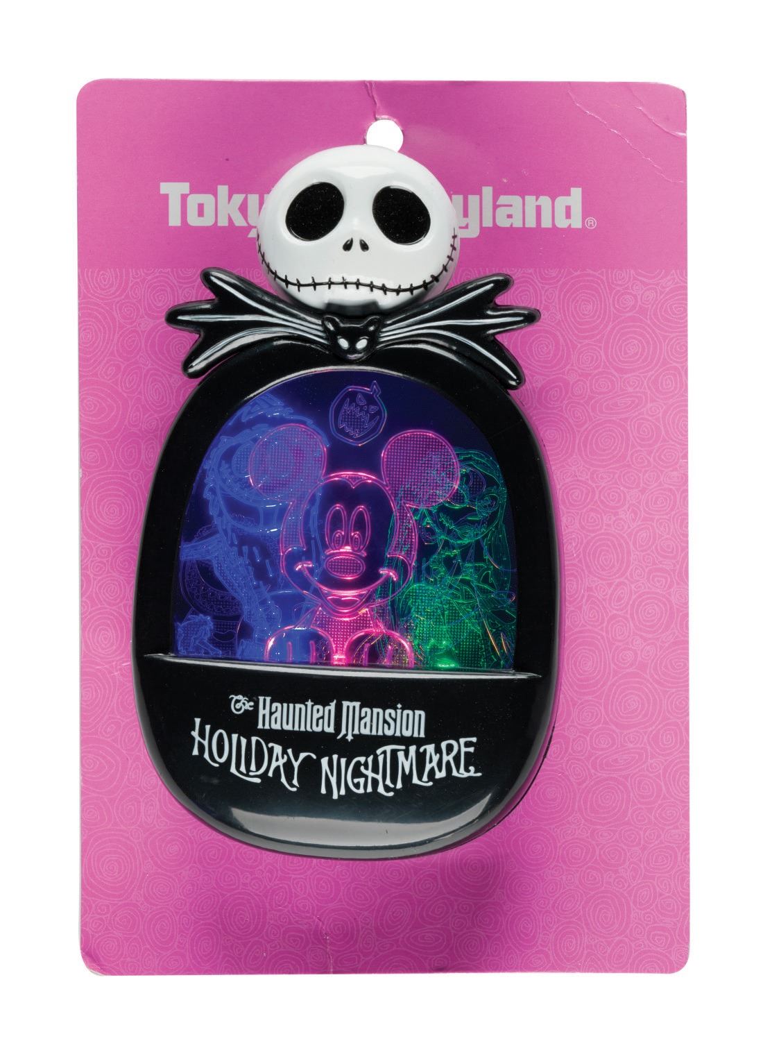(Tokyo Disneyland) A light-up badge commemorating The Haunted Mansion Holiday Nightmare at Tokyo Disneyland. The Doom Buggy-shaped badge features imagery of Mickey Mouse, Jack Skellington, Sally, Lock, Shock, and Barrel inside. Measuring 4.5" tall and 2.75" wide, the piece is in fine working condition on its original good condition card, the card exhibiting few creases.