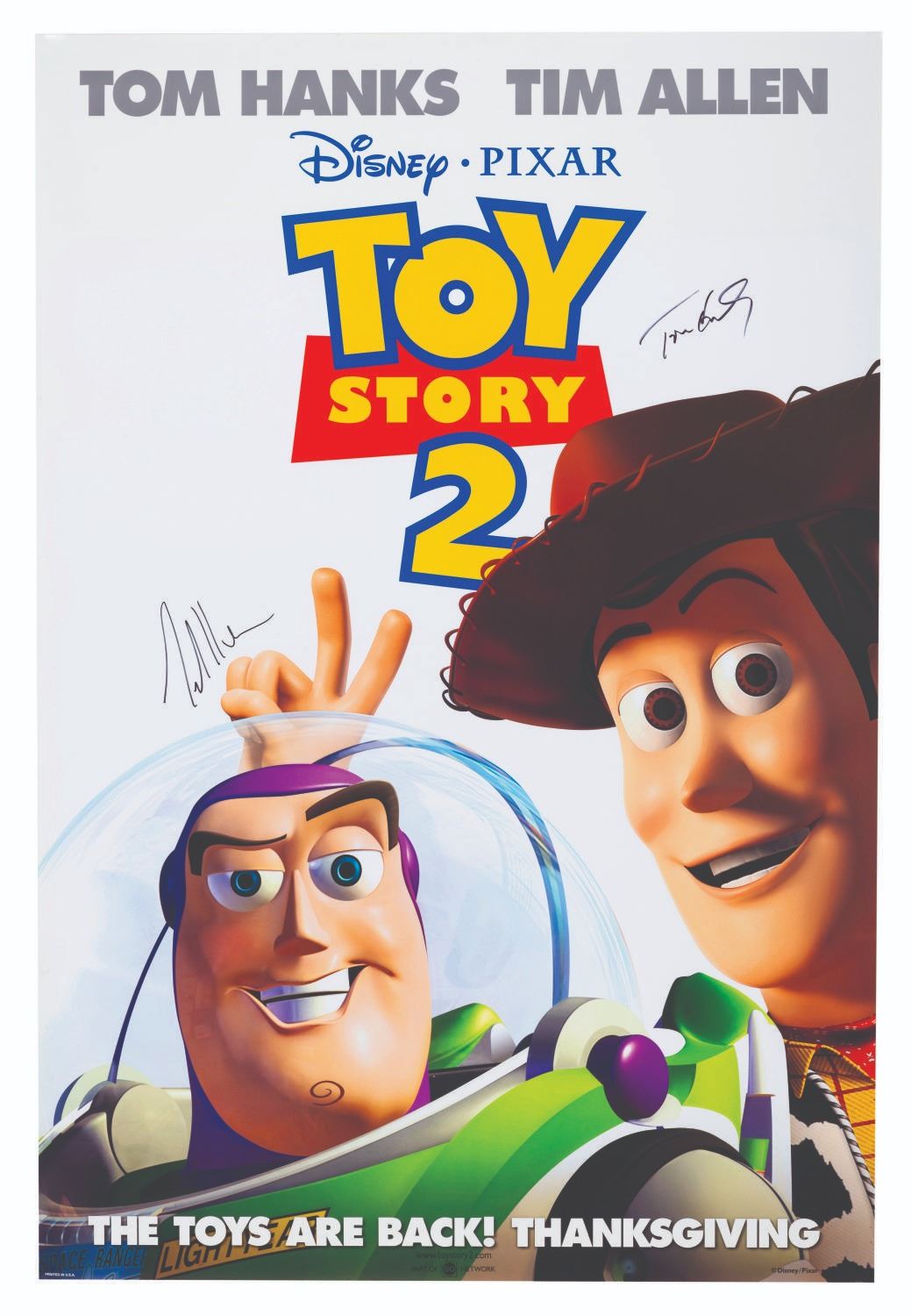 (Disney/Pixar, 1999) A double-sided one-sheet for "Toy Story 2" signed by lead voice actors Tom Hanks and Tim Allen. Measuring 27" x 40", the poster displays in fine condition with very minor wear and very light discoloration to the edges.