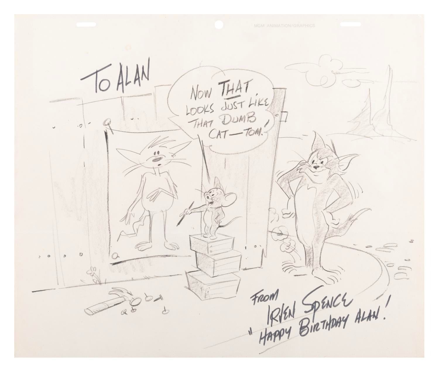 (Spence, 1970s-80s) A pencil drawing of Tom and Jerry by animator Irven Spence, signed in felt tip with a dedication to Alan Hylton. Spence is known for his work on MGM's "Tom and Jerry" series on shorts like "Little Red Walking Hood," and "Million Dollar Cat." With an image size of 8.25” x 11.5” on 10.5” x 12.5” animation paper, the drawing is in very good condition, with slight color shift to the paper from age.