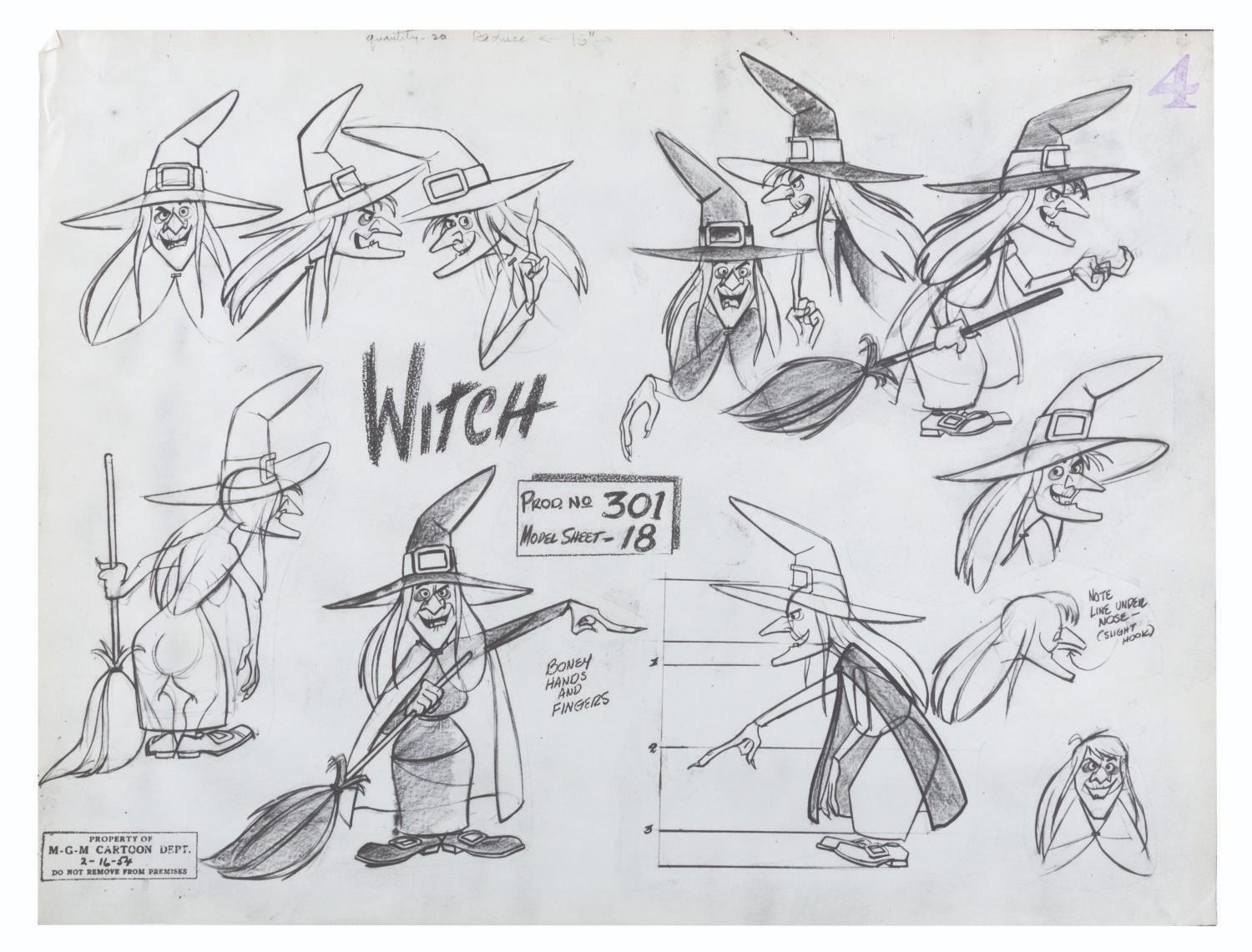 (MGM, 1956) A Studio-produced photostat model sheet of the Witch for the Tom & Jerry short “The Flying Sorceress.” Model sheets such as these were distributed to animators and crew working on the film to ensure character design continuity. Measuring 12.25” x 15.75”, the model sheet is in good condition with light creases in the top left corner and general handling wear from production use.