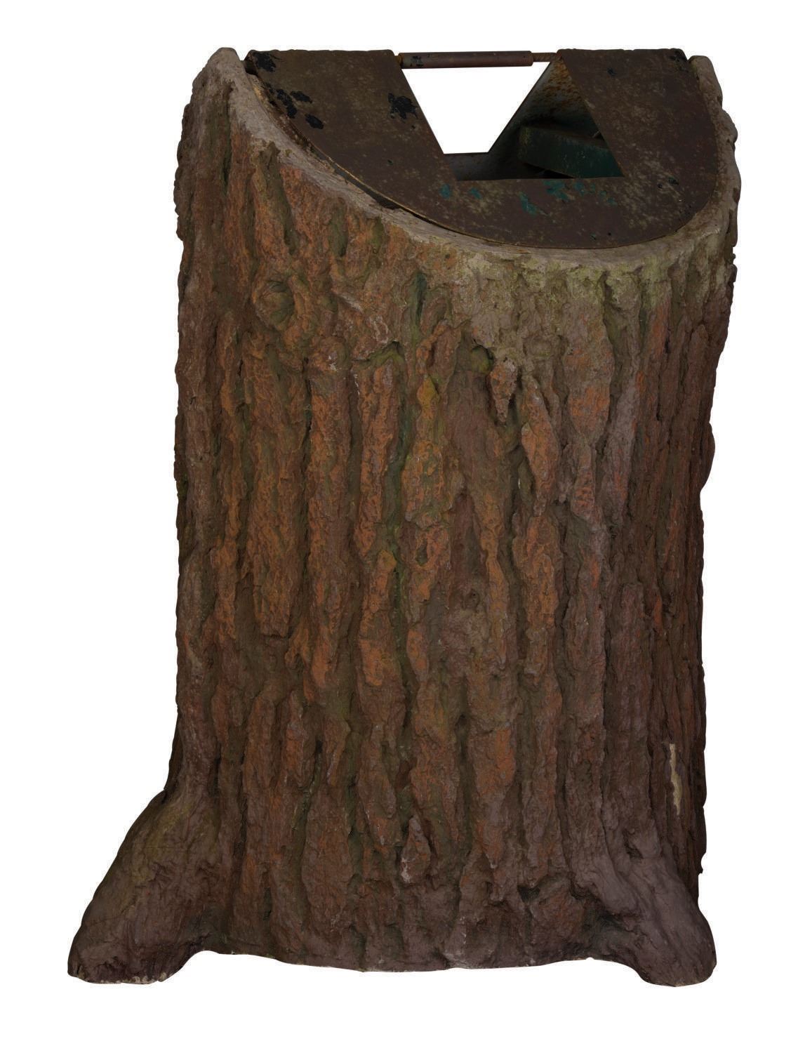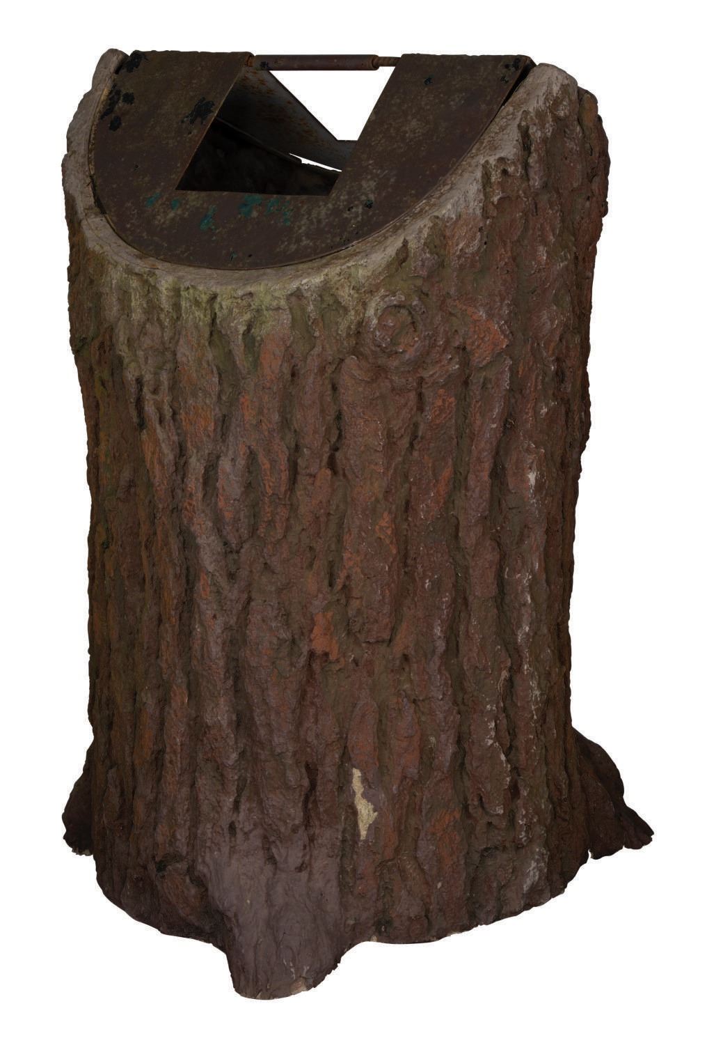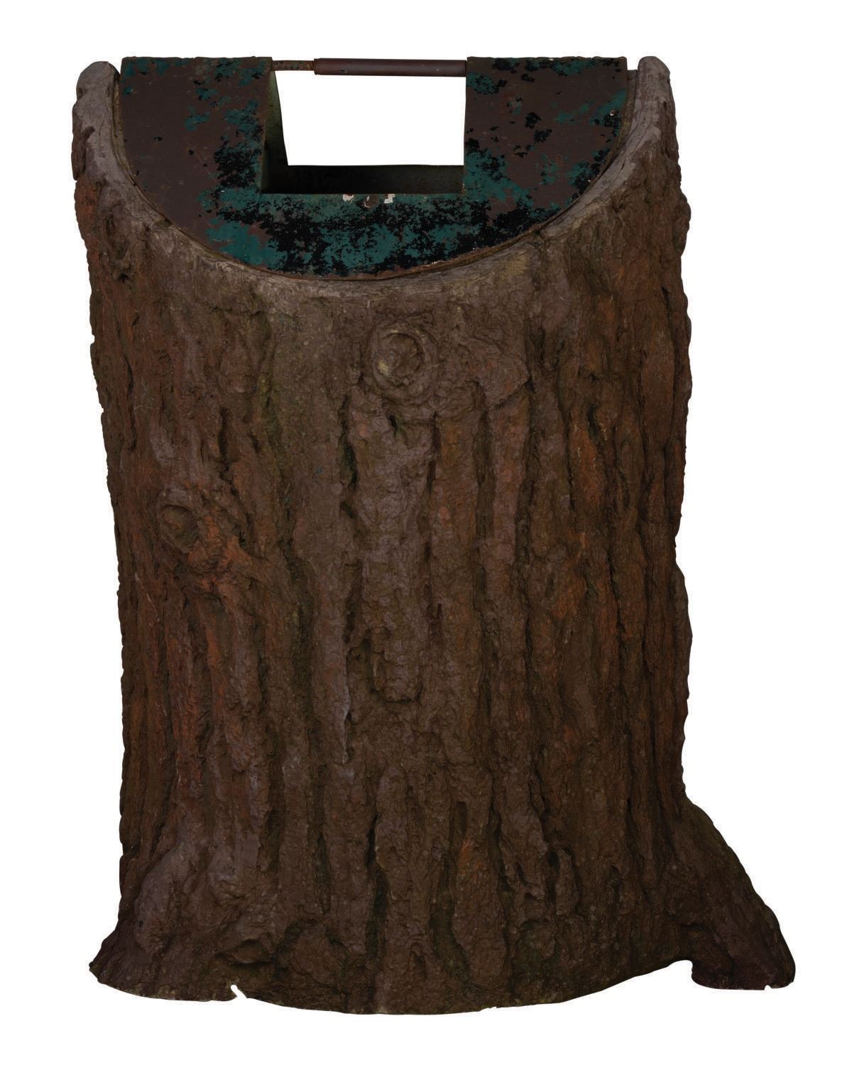 (Disneyland, 1960s) An extremely rare original Frontierland Trash Can. The tree stump-inspired trash can was crafted by the Staff Shop for Fort Wilderness on Tom Sawyer Island. The Trash Cans were used at the fort for decades before being removed when the fort closed. The fiberglass and metal cans feature a detachable metal lid, but the swinging panels are missing. The entire piece measures 48.5" tall and 44" at its widest diameter and displays in good condition despite wear to the fiberglass and oxidation to the metallic parts. Because of size and weight, special shipping arrangements may be required. Inquire before bidding.