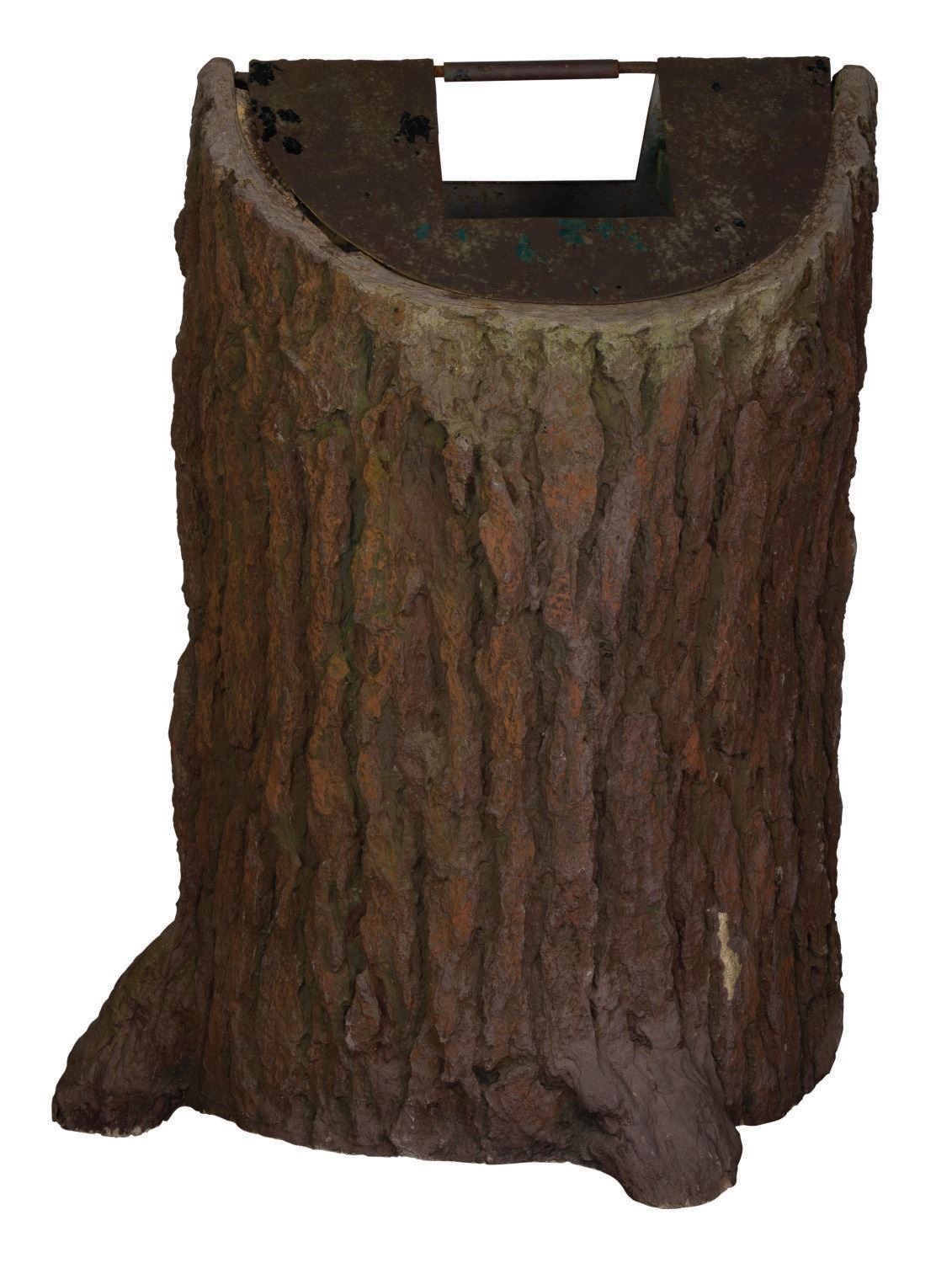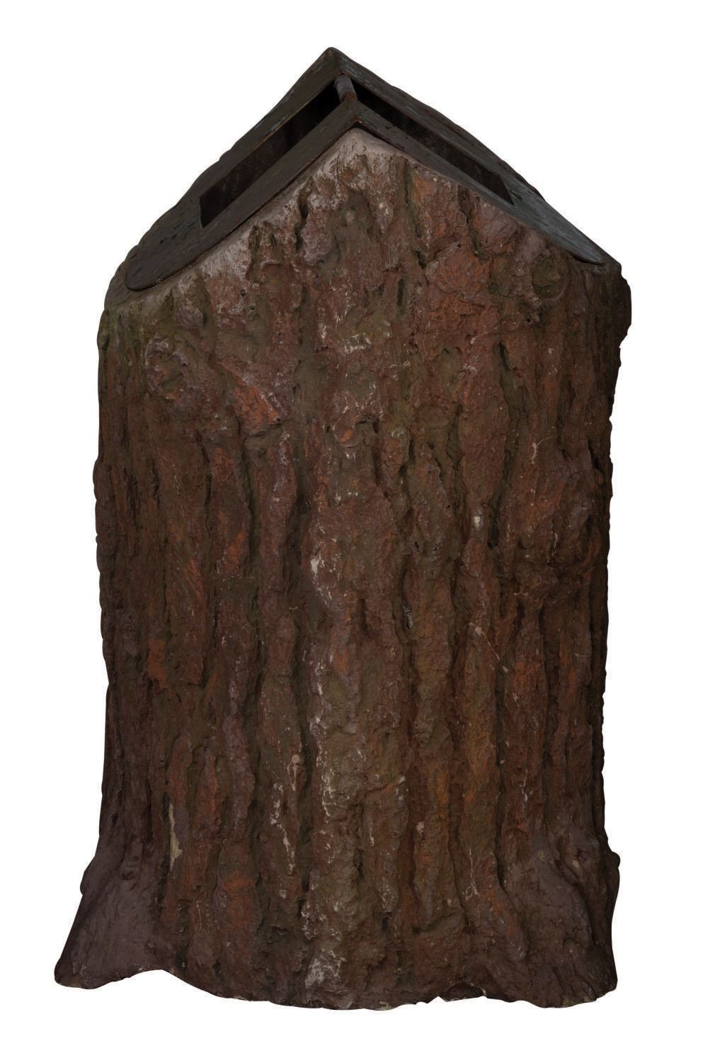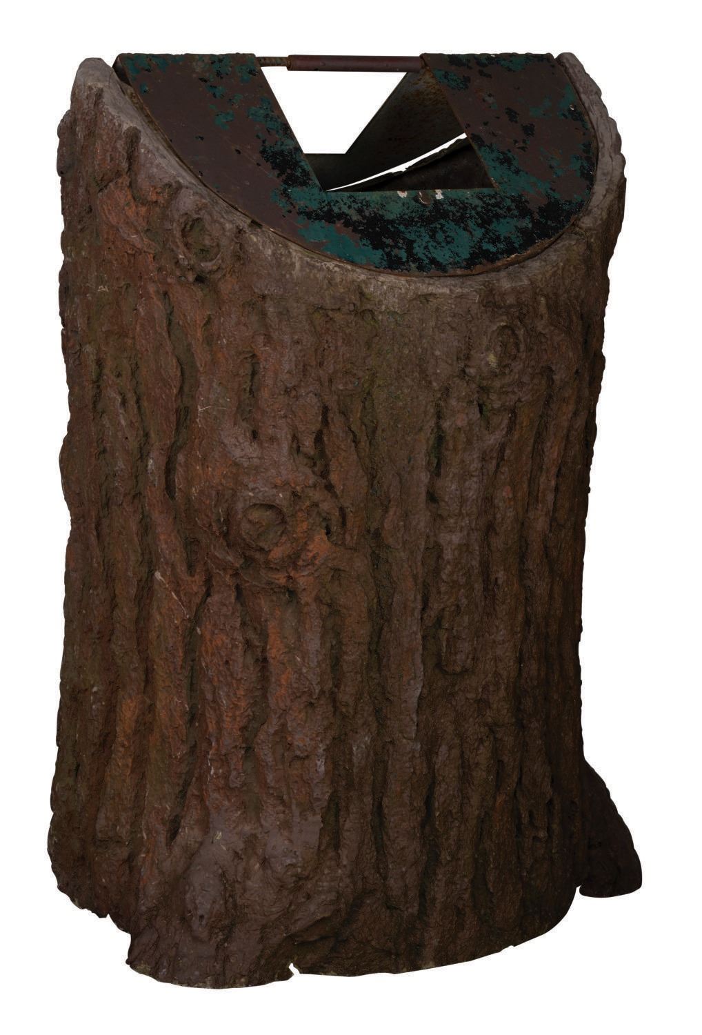 (Disneyland, 1960s) An extremely rare original Frontierland Trash Can. The tree stump-inspired trash can was crafted by the Staff Shop for Fort Wilderness on Tom Sawyer Island. The Trash Cans were used at the fort for decades before being removed when the fort closed. The fiberglass and metal cans feature a detachable metal lid, but the swinging panels are missing. The entire piece measures 48.5" tall and 44" at its widest diameter and displays in good condition despite wear to the fiberglass and oxidation to the metallic parts. Because of size and weight, special shipping arrangements may be required. Inquire before bidding.