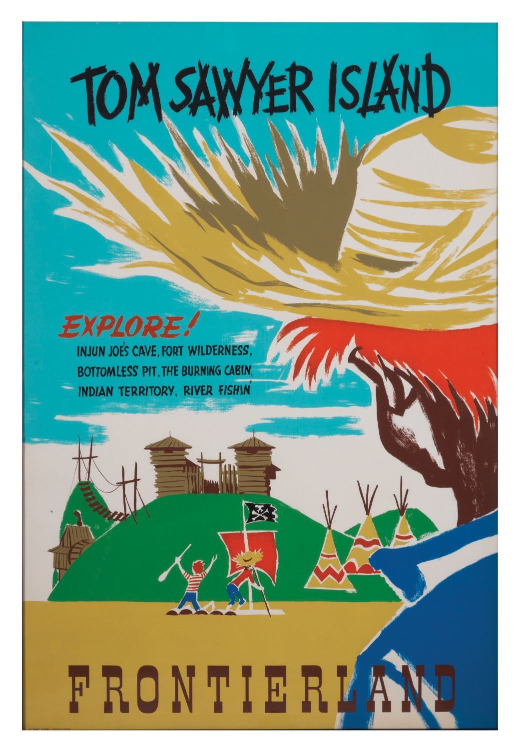 (Disneyland, 1956) An original hand-silkscreened attraction poster for Tom Sawyer Island. Designed by Bjorn Aronson, this first version of the poster lists The Bottomless Pit, The Burning Cabin, Indian Territory, and River Fishin' as features of the Island. The poster measures 36"x54" and is in very good condition with a few scuffs and light wear.