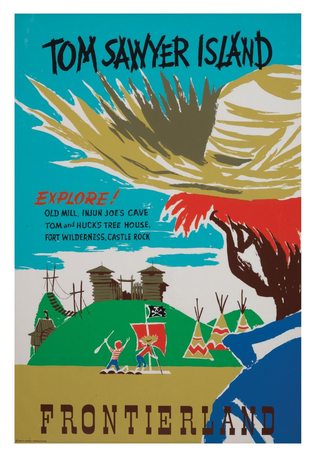 (Disneyland, 1960s) An original hand-silkscreened attraction poster for Tom Sawyer Island. Designed by Bjorn Aronson, this second version of the poster lists the Old Mill, Tom and Huck's Treehouse, and Castle Rock as attractions on the Island for the first time. The poster measures 36"x54" and is in very good condition with a few mild creases, few light scuffs, and little wear.