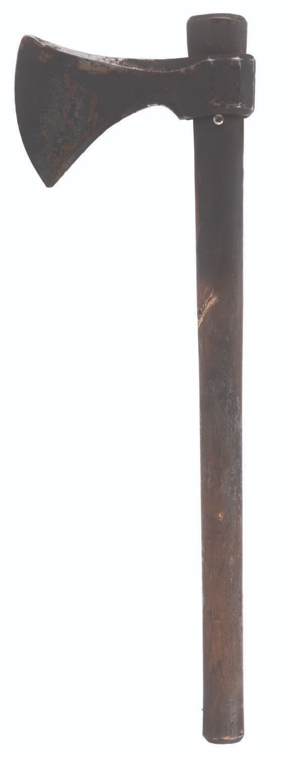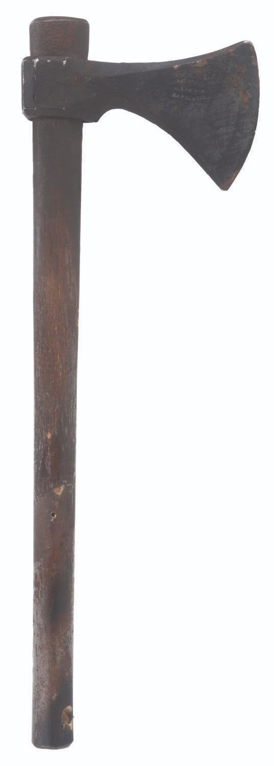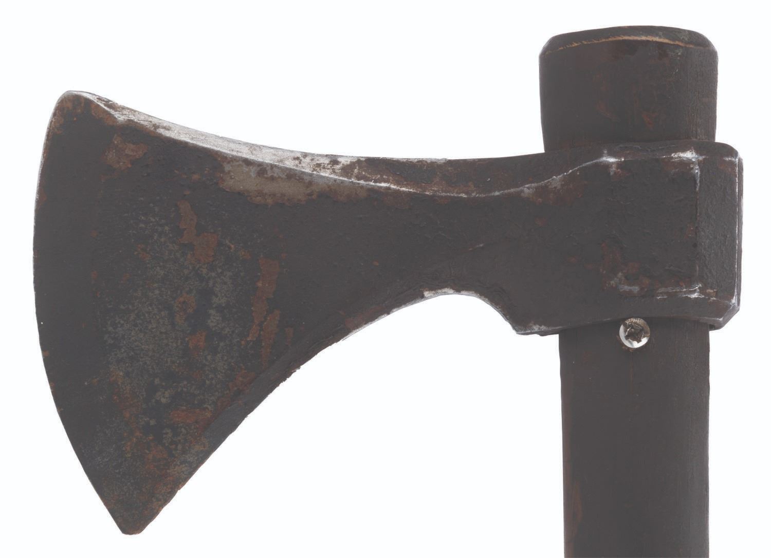 (Disneyland, 2007-16) An original tomahawk prop from Pirate's Lair on Tom Sawyer Island. This prop was displayed in the Stow Yer Weapons area, a reference to a scene from Pirates of the Caribbean. Measuring 6" x 18", the unsharpened metal and wood prop is in good condition with oxidation from age, scuffs, heavy scratches, and wear from Park use.