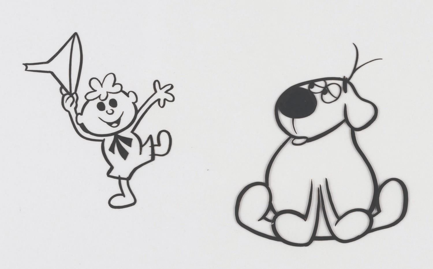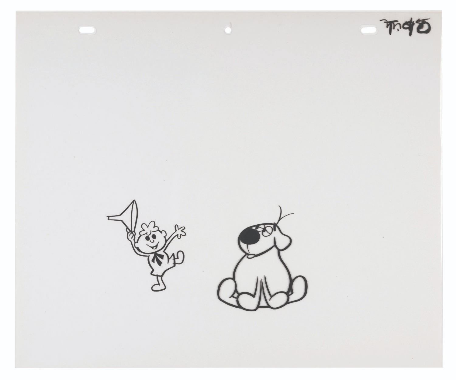 (Terrytoons, 1957-59) An original hand-painted multi-layer production cel of Tom Terrific and Mighty Manfred. "Tom Terrific" was created by Gene Deitch as a weekly segment of the "Captain Kangaroo" show. With a character image size of 3.5" x 6" on untrimmed 10.5" x 12" cels, the piece is in very good condition.