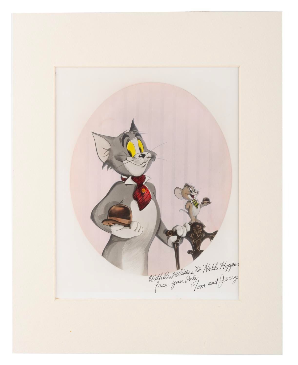 (MGM, 1960s) A fan card of Tom and Jerry, addressed to Hollywood gossip columnist Hedda Hopper. The print features very fine hand-painted accents. Measuring 8 " x 10 " in an 11 " x 14 " matte, the fan card is in very good condition with light wear.